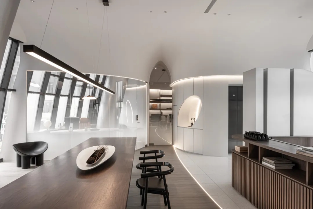 整体环境色调通过自然木纹色,加上黑色与白色的中性色调,实现了工作环境的现代、干净和优雅的设计诉求。因为严格的保密要求,项目的声学与视觉设计都变得至关重要。该项目包括以客户为中心的区域:一个类似于艺术画廊的展示室/产品展示区,配有先进的展示设备;一个会议室,游戏室,休息室和协作空间,一个材料库,一个开放的办公区和一个后厨工作间。