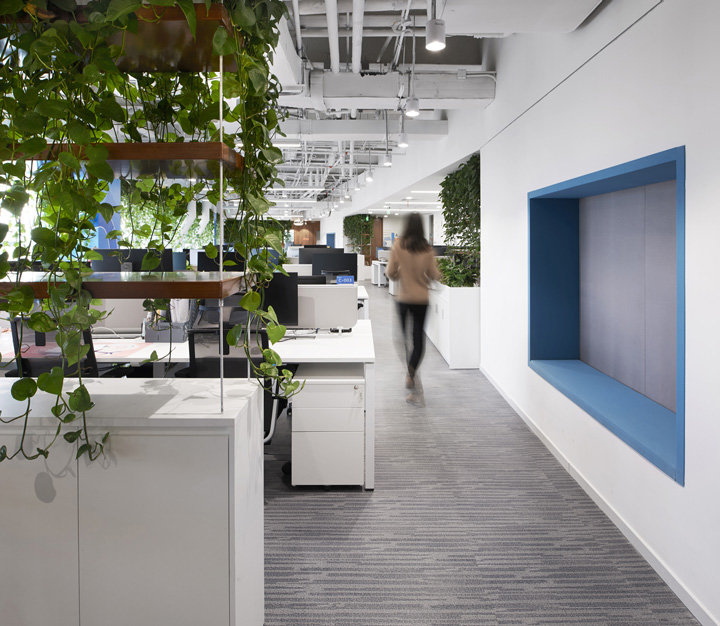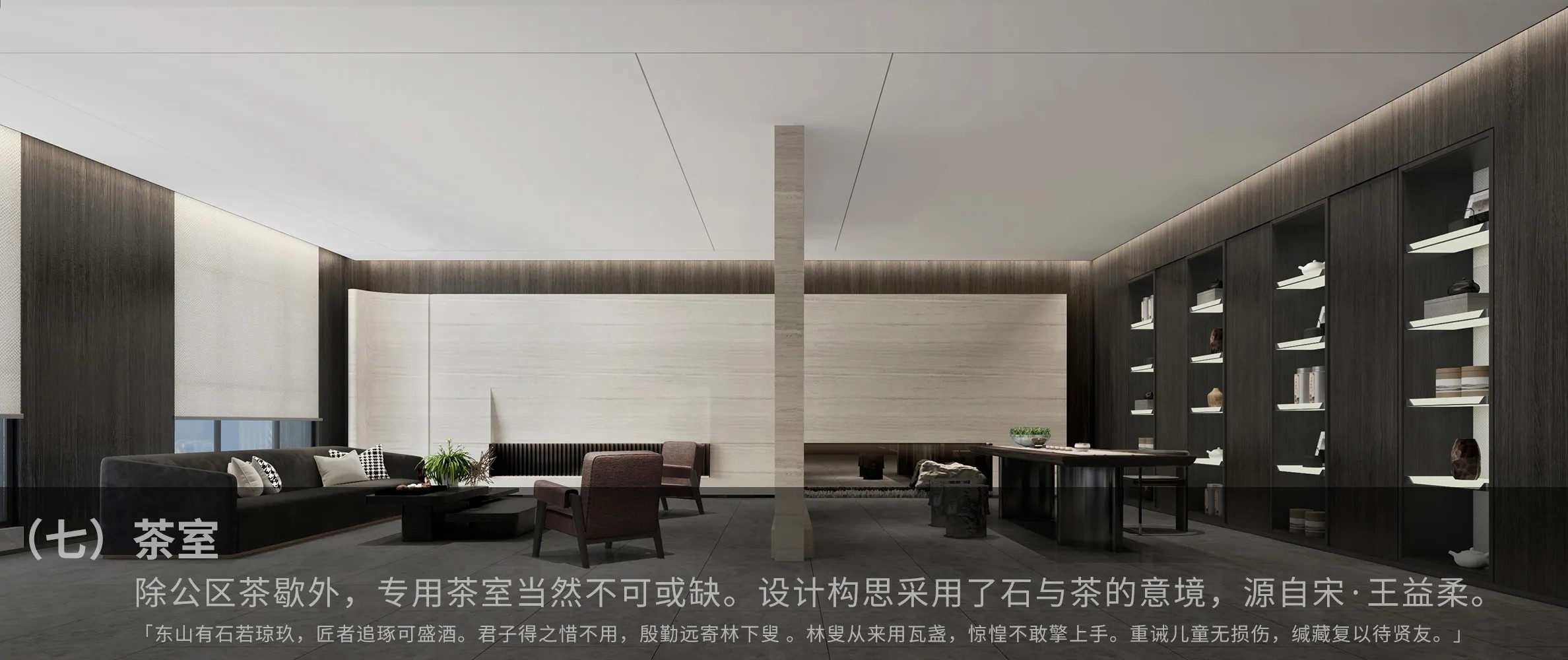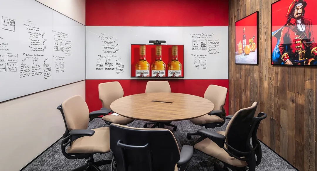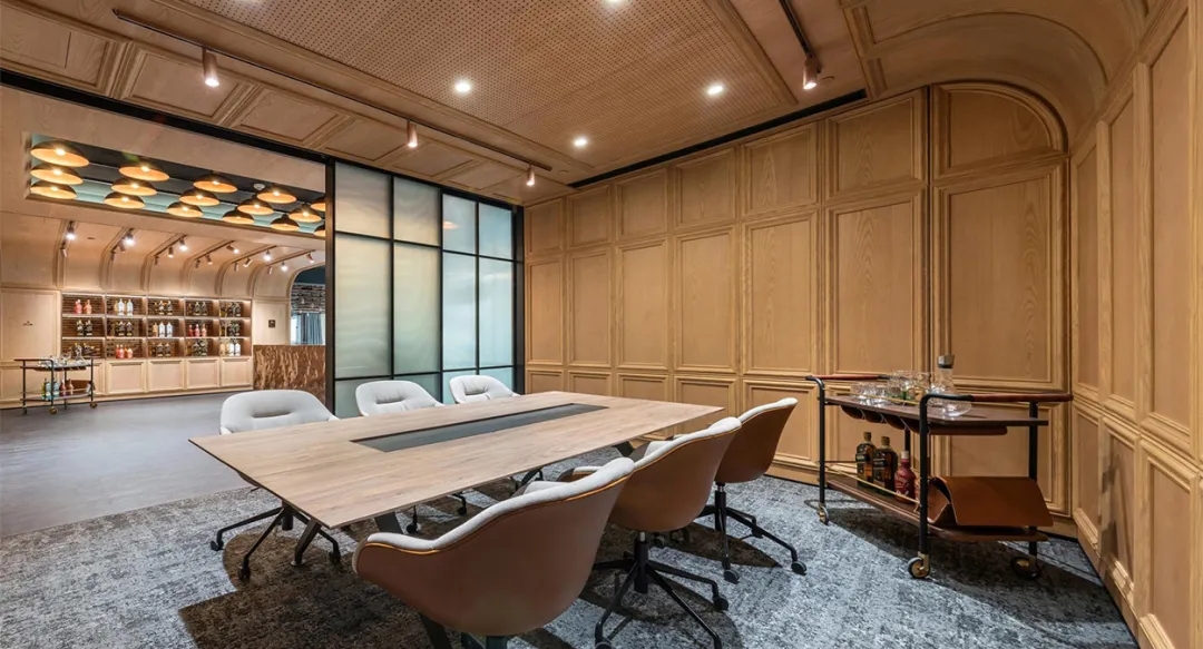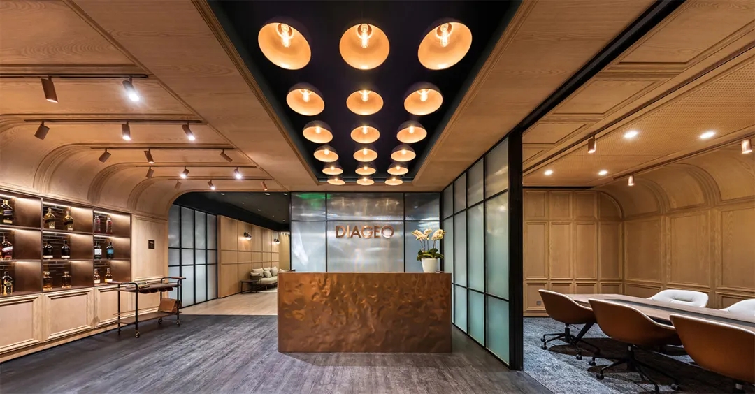 办公空间营造了醇馥的沉浸式品牌环境。到访区使用了可回收利用的铜材质,不仅反映了Diageo“可持续”的环保承诺,更模拟出流动的杯中质感。