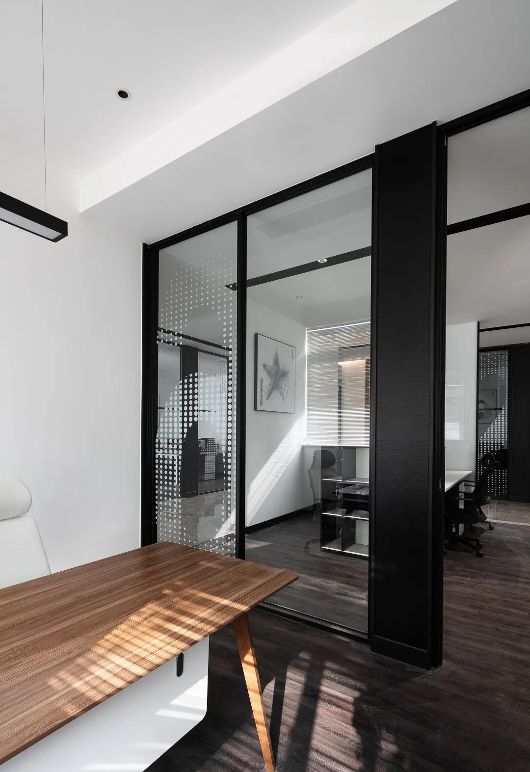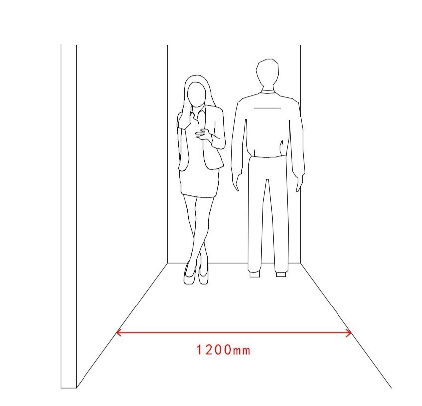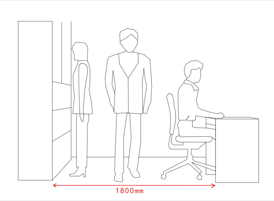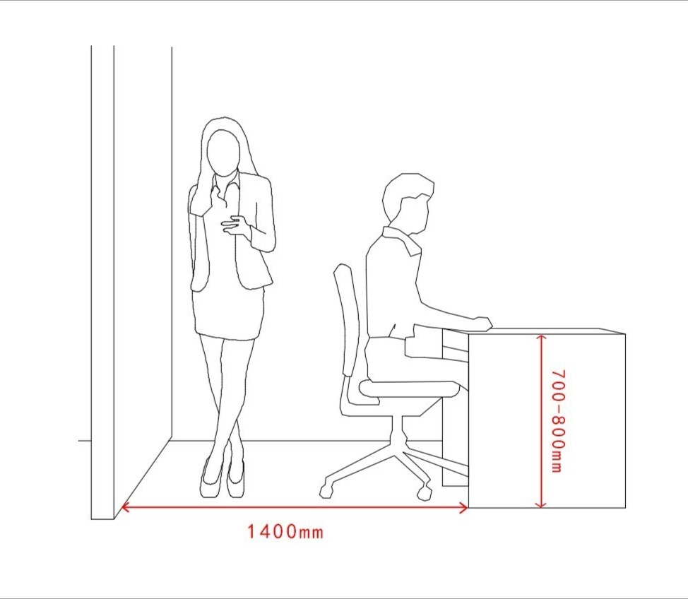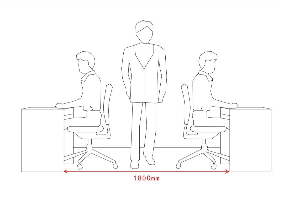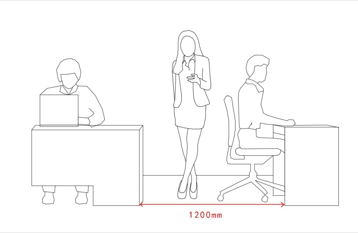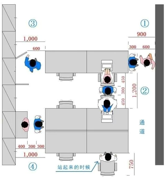 6.2.开放式办公区6.2.1 办公室的通道尺寸不应少于0.9m,满足两个人正面和侧面同时通过。6.2.2 两个办公桌之间的工作过道不应少于1.2m。6.2.3 带文件柜的通道与办公桌距离不应小于1.0m,确保柜门开启后员工的正常走动。6.2.4 工作岗位站立的距离尺寸为0.75m,便于人员左右走动。