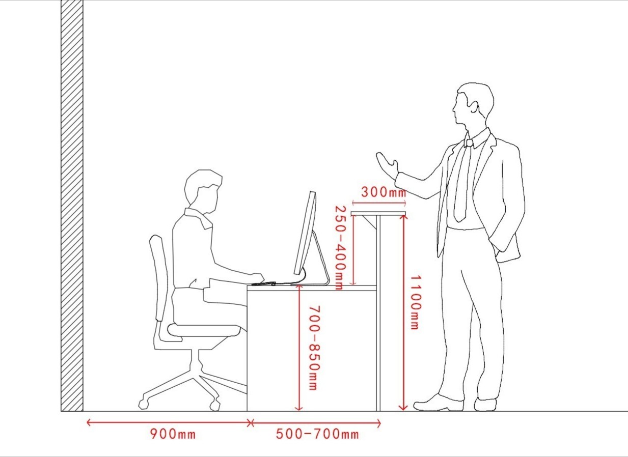 6.1前台6.1.1 服务前台应分高低两层、内层为员工使用尺寸:台面宽度为0.5~0.7m,柜台高度为0.7~0.85m。6.1.2 外层为客人使用,顶面需设置0.3mm宽的书写板,用于客人填写资料使用,尺寸:高度1.1mm,台面宽度在.0.3mm。6.1.3 前台员工活动后方距离墙体或物体需预留不少于0.9m通道。