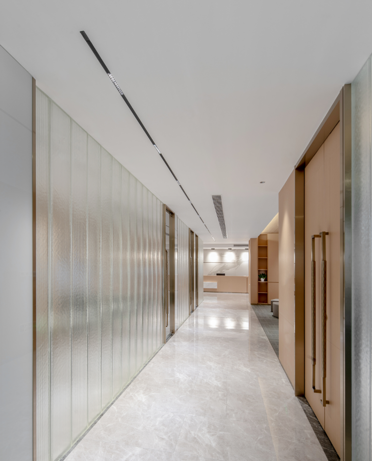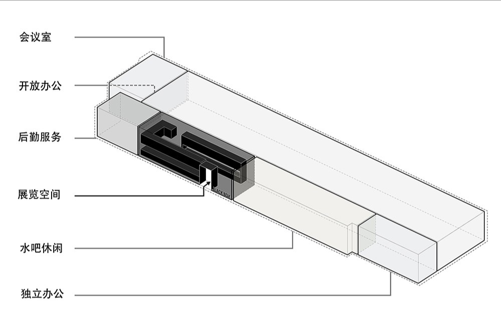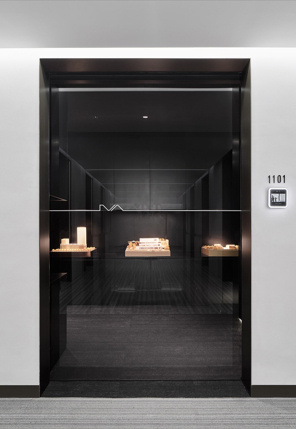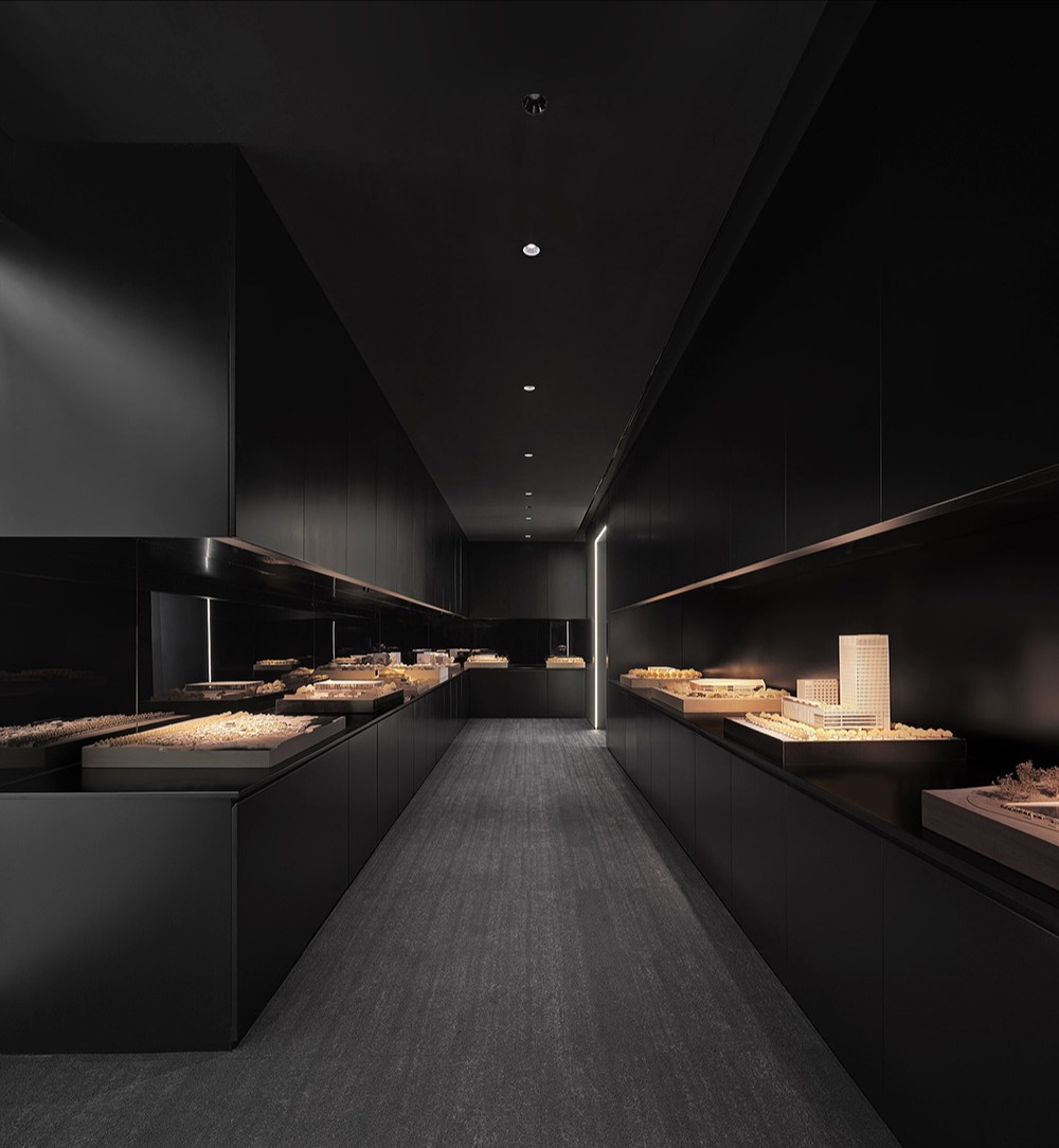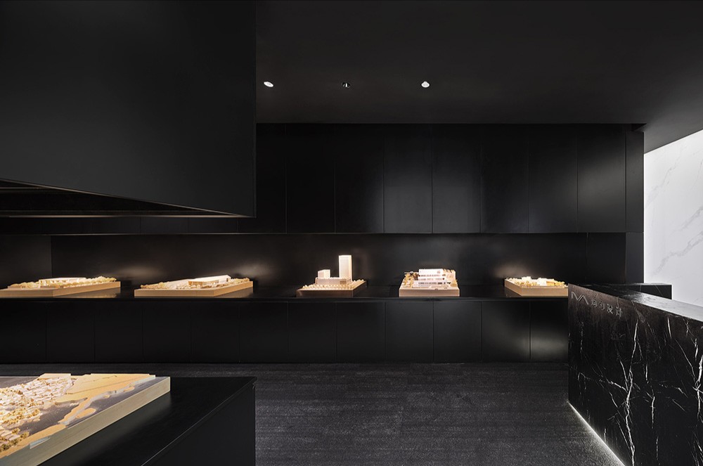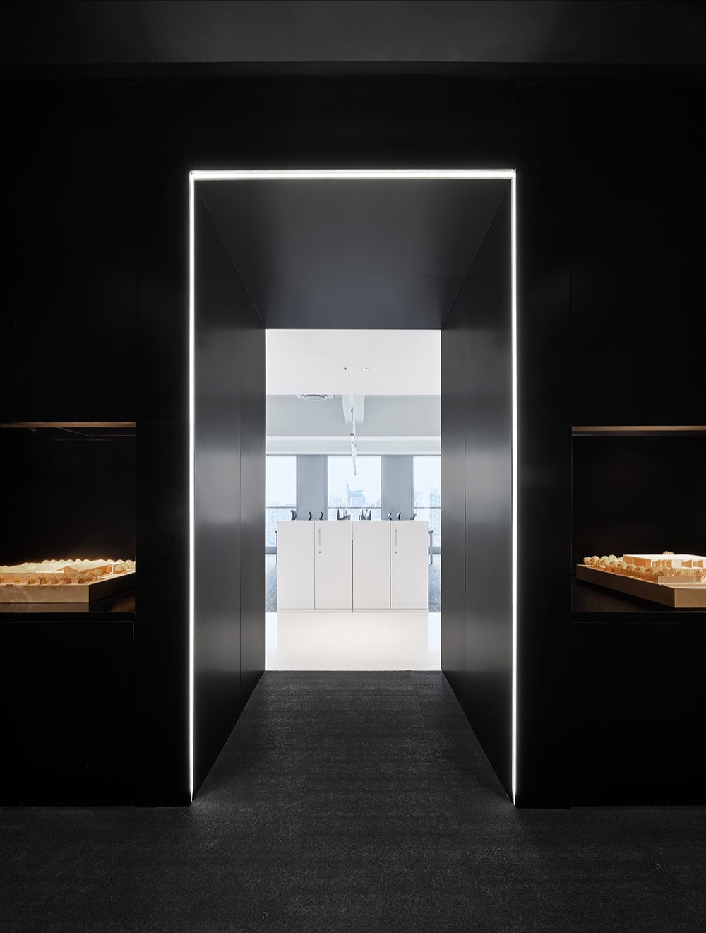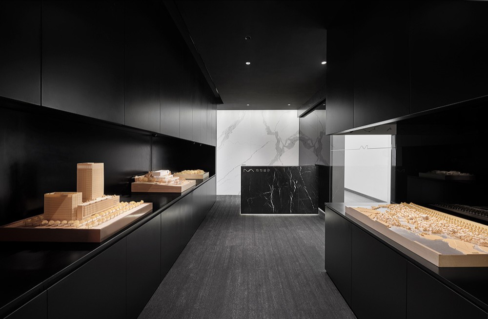 写字楼门厅至电梯厅大面积使用白色石材,明亮大方。而设计通过黑色盒子限定入口,既暗示到访者已进入公司,也是保护办公私密性的玄关。黑色盒子是一个小型展陈空间,可收纳与展示重要项目模型,通过光环境的对比与控制,黑色盒子里展示的模型犹如一件件艺术品,使访客能够在第一时间感知团队的设计追求和精良品质。