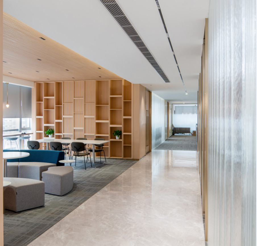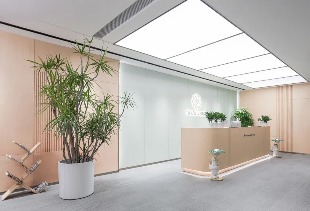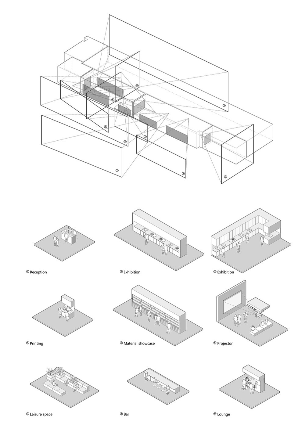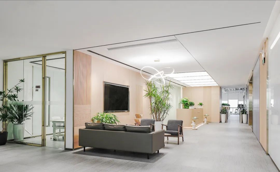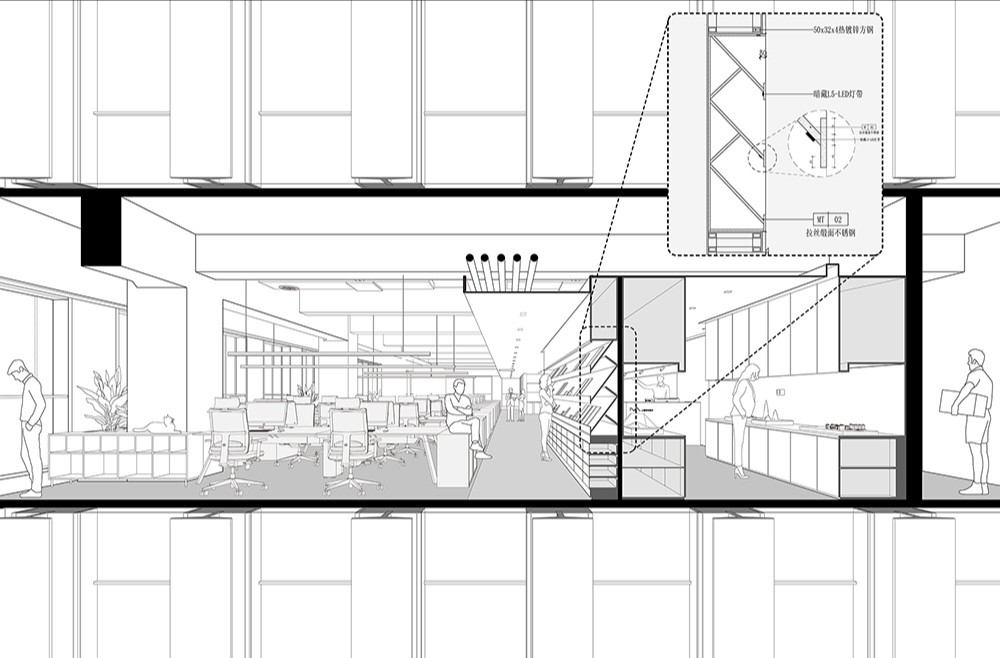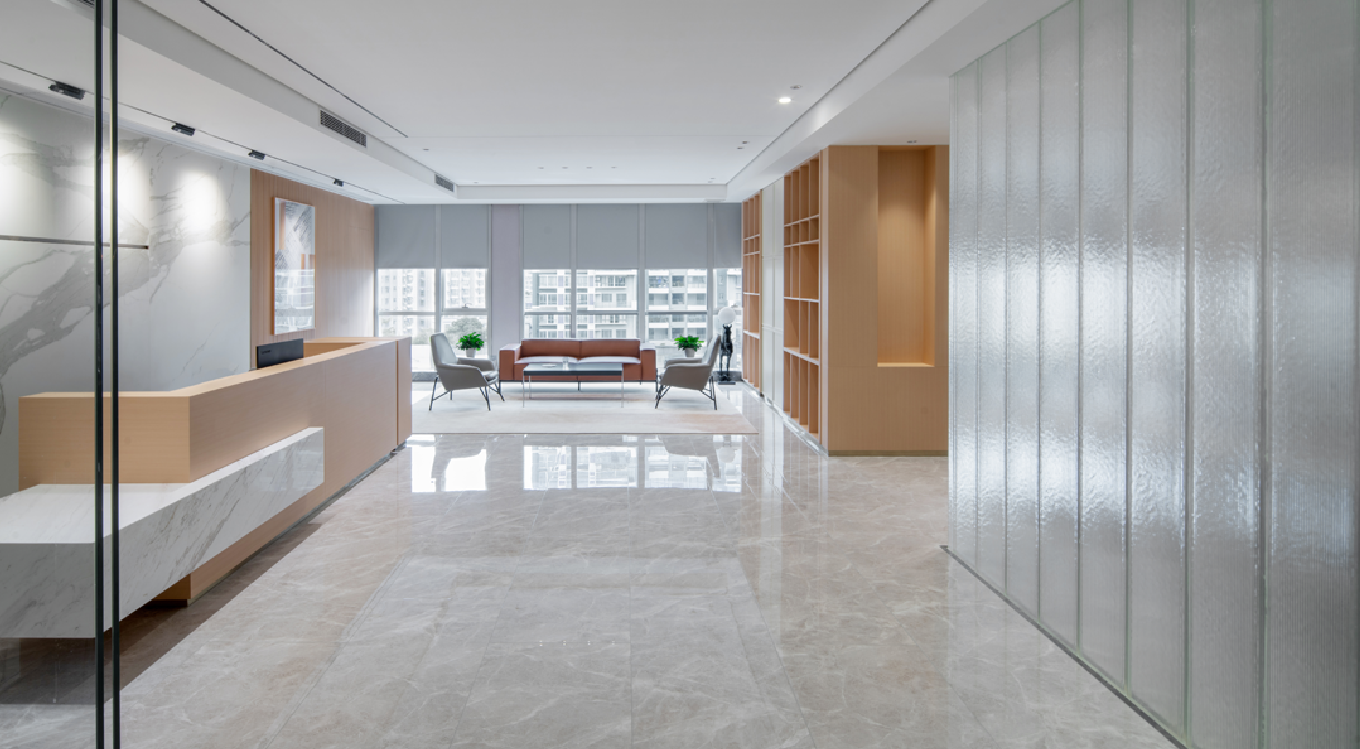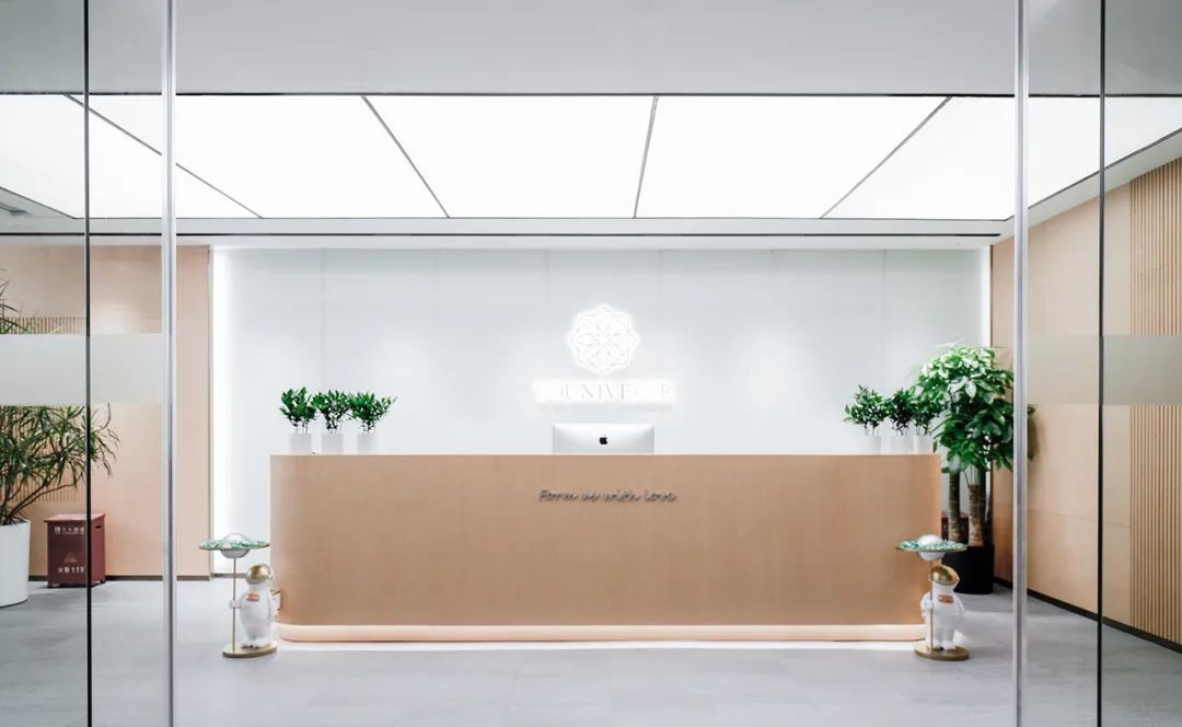 写字楼门厅至电梯厅大面积使用白色石材,明亮大方。而设计通过黑色盒子限定入口,既暗示到访者已进入公司,也是保护办公私密性的玄关。黑色盒子是一个小型展陈空间,可收纳与展示重要项目模型,通过光环境的对比与控制,黑色盒子里展示的模型犹如一件件艺术品,使访客能够在第一时间感知团队的设计追求和精良品质。