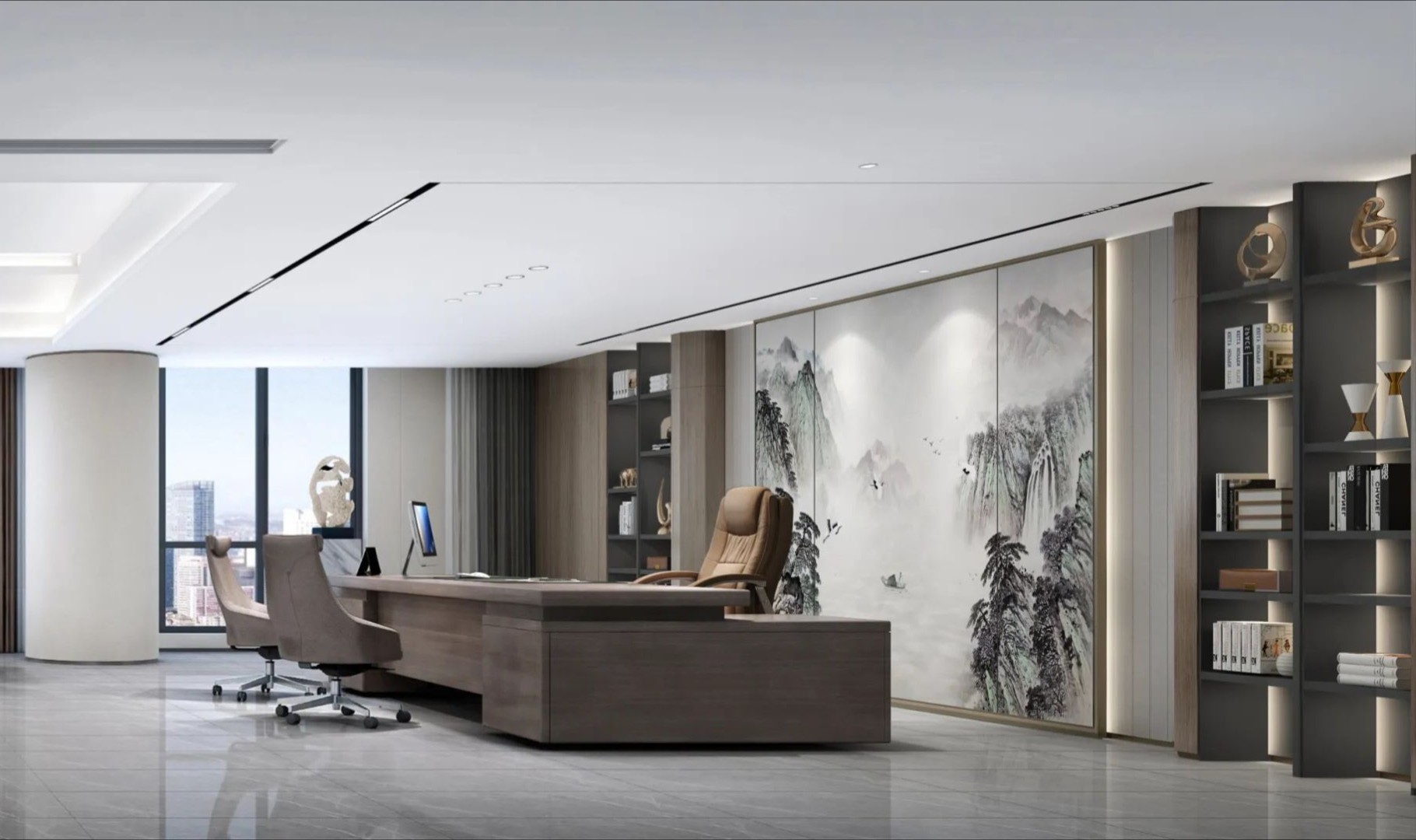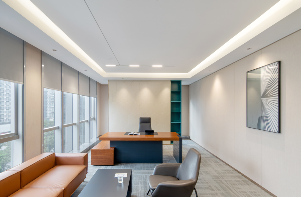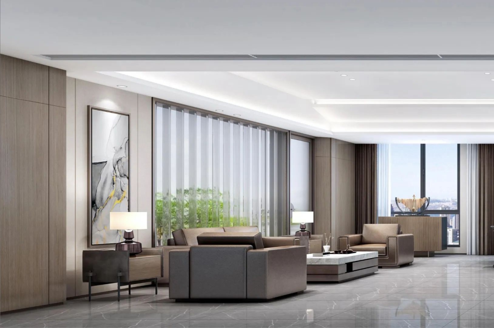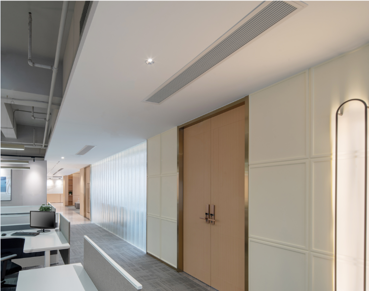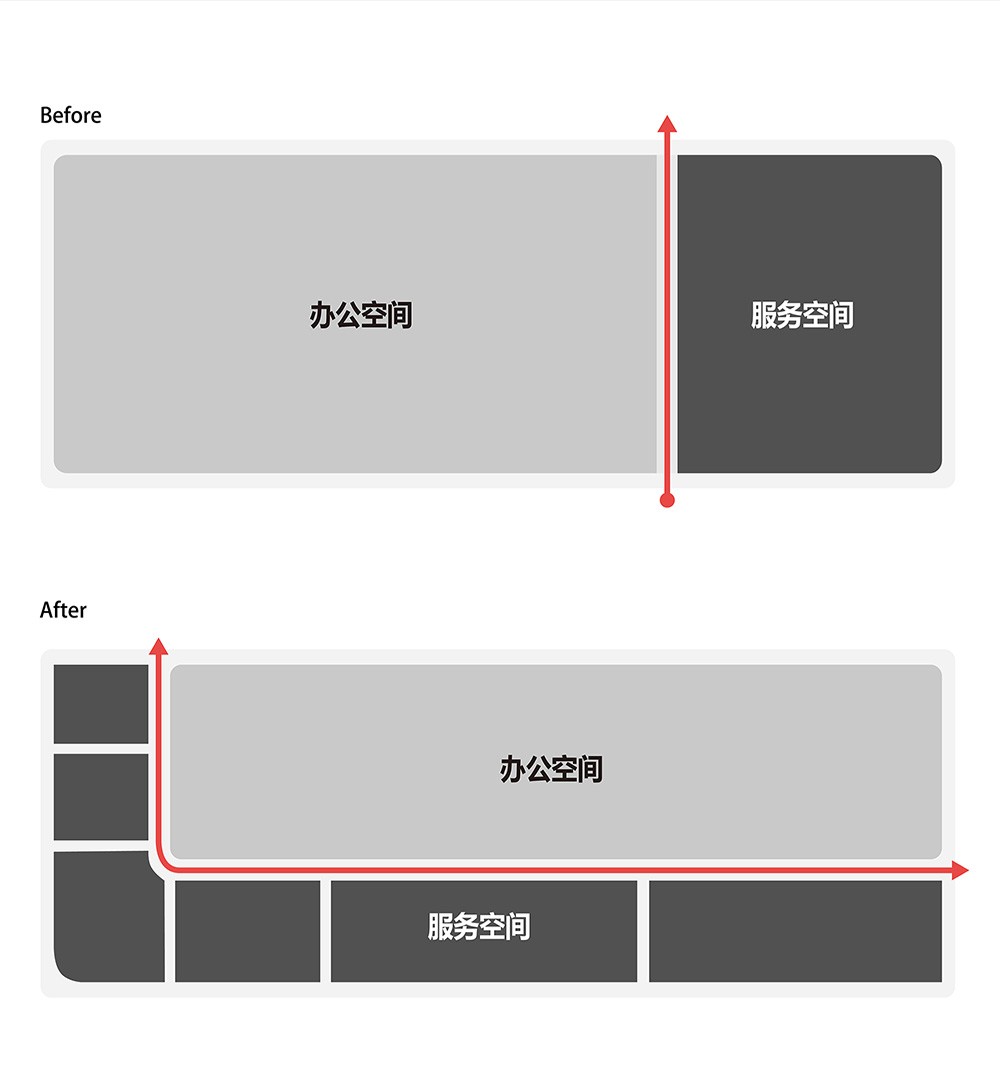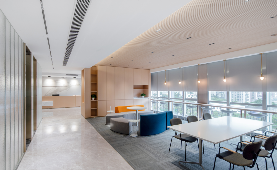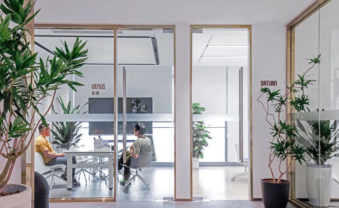 写字楼门厅至电梯厅大面积使用白色石材,明亮大方。而设计通过黑色盒子限定入口,既暗示到访者已进入公司,也是保护办公私密性的玄关。黑色盒子是一个小型展陈空间,可收纳与展示重要项目模型,通过光环境的对比与控制,黑色盒子里展示的模型犹如一件件艺术品,使访客能够在第一时间感知团队的设计追求和精良品质。