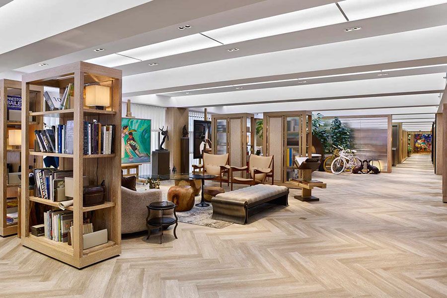 最初,通道通过与墙高的半透明窗户提供内部一瞥,并将用户引导至办公室。大理石地板、灰色真皮沙发和与接待台相得益彰的木桌相结合,彰显了功能外观的简洁性。角落里的一些绿色的景观和一个用于存储和装饰的预制金属架减轻了氛围,营造出令人愉悦的氛围。