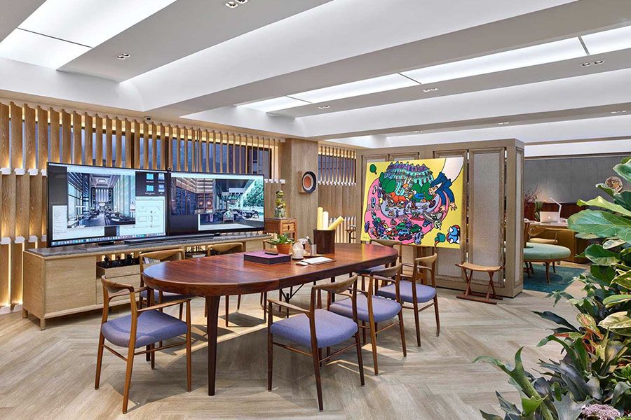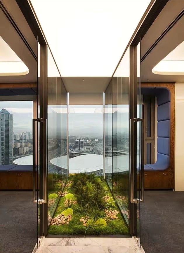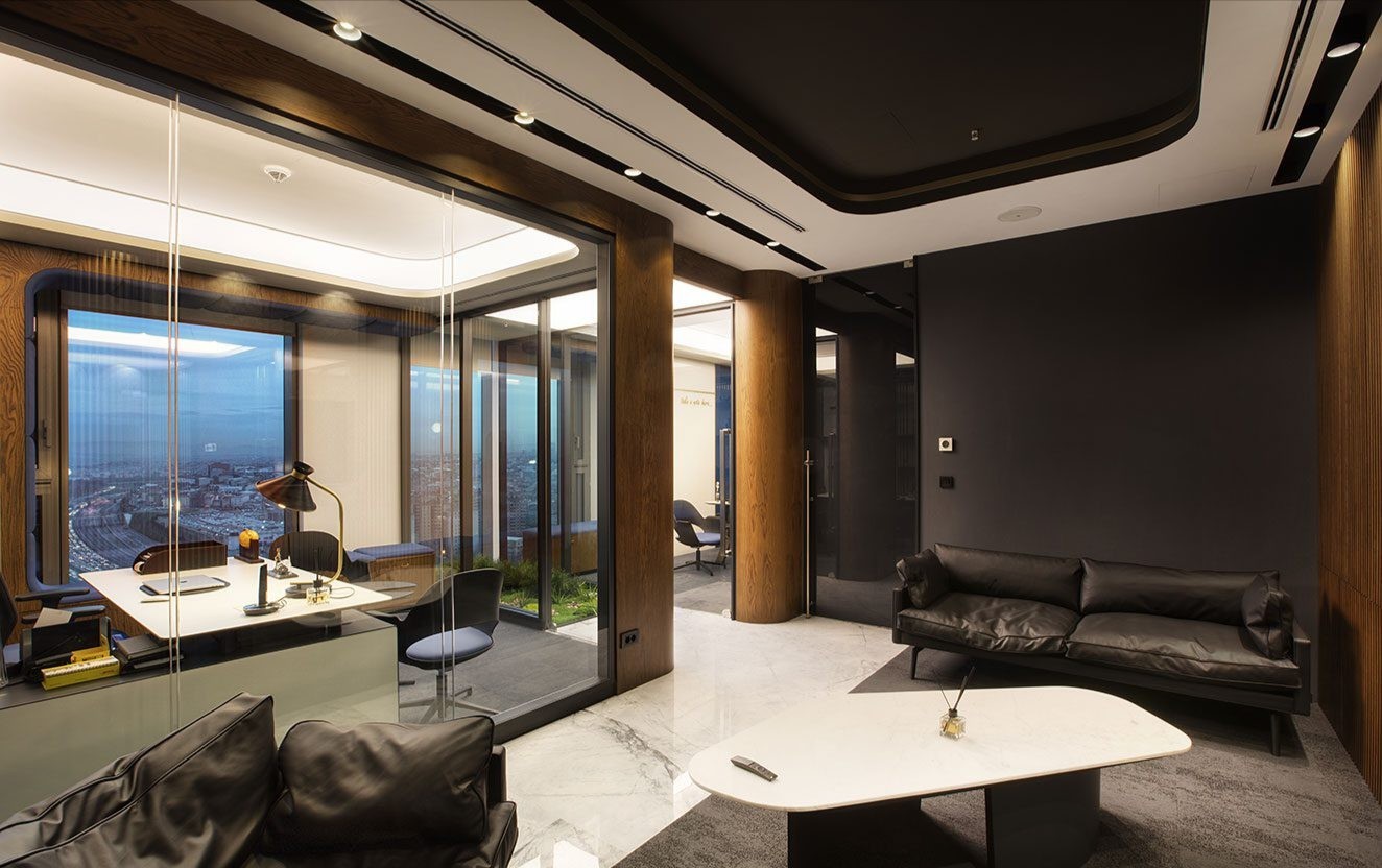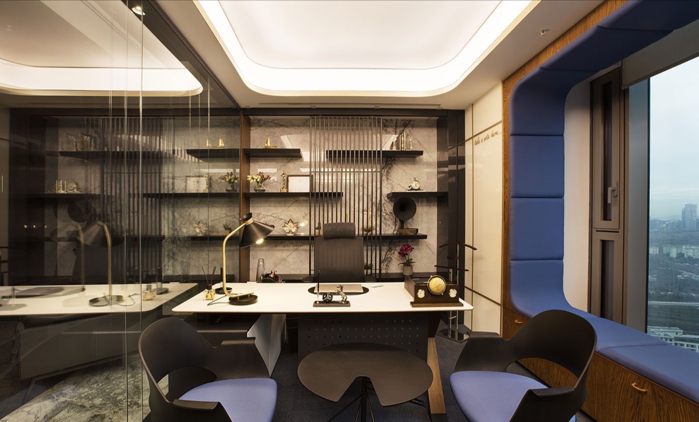 老板办公室紧靠景观区。利用原有的窗户设计可以休息思考的地方。设计的理念是融入一个动态和有效的工作环境。混合桌椅以一排植物为中心,打破空间的单调。这个元素带来了活泼的本质,间接有助于提高生产力。为了保持空间的连续性,额外的桌子沿着墙的外围延伸。包含储物柜是一种功能选择。未来更好地融入生态自然,利用透明的玻璃隔断来实现,把绿色的景观收入眼底。当需要私密空间的时候,我们通过智能开关让玻璃瞬间雾化。以增强空间的个性。