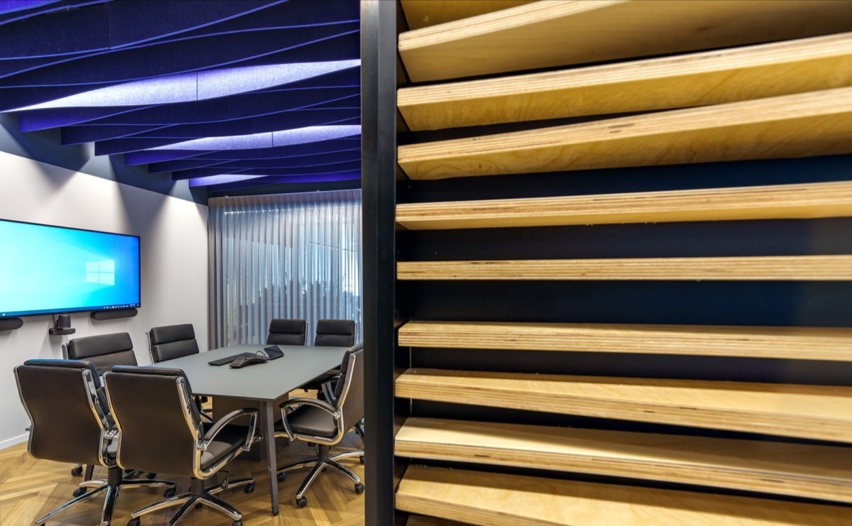 会议室为蓝色,并有一个模仿水层的蓝色波浪形吸音天花板。由于超高的混凝土天花板,我们能够用黑色油漆“消失”基础设施,使空间看起来干净、优雅。一个长而弯曲的灯具伴随着空间中的运动。