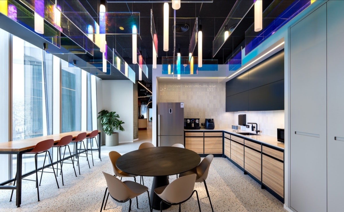 一个由全息有机玻璃制成的大型移动装置悬挂在自助餐厅的天花板上。它的灵感来自于在水中折射的太阳光线。各种长度和高度的面板与照明设备相结合,产生了色彩和透明度的变化。