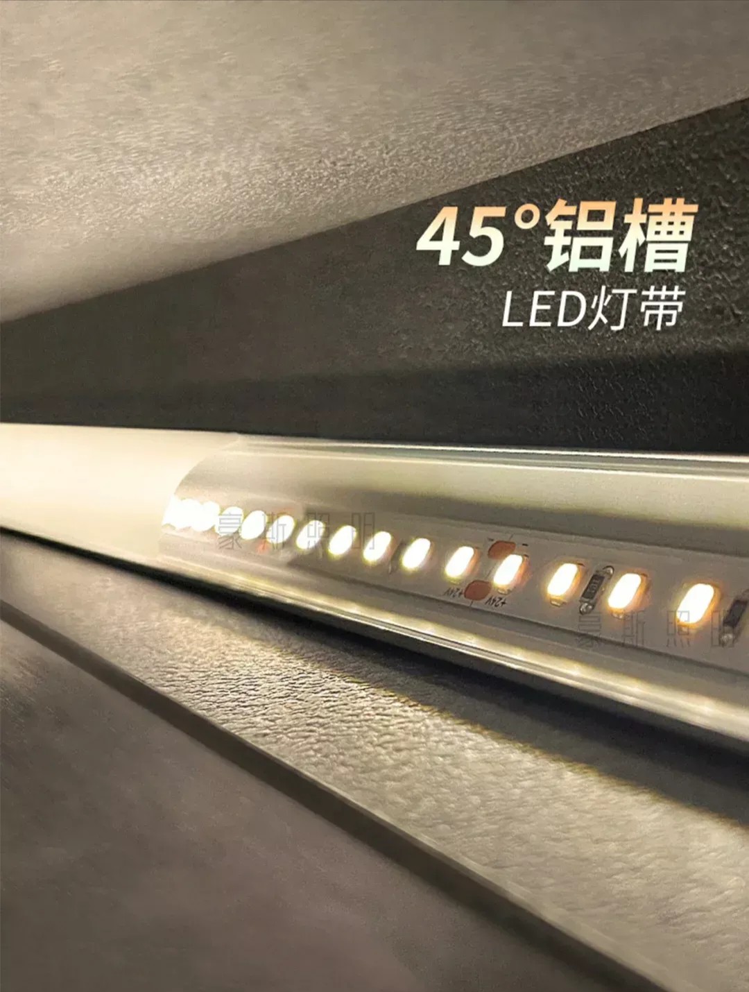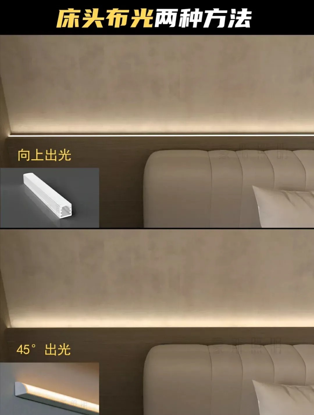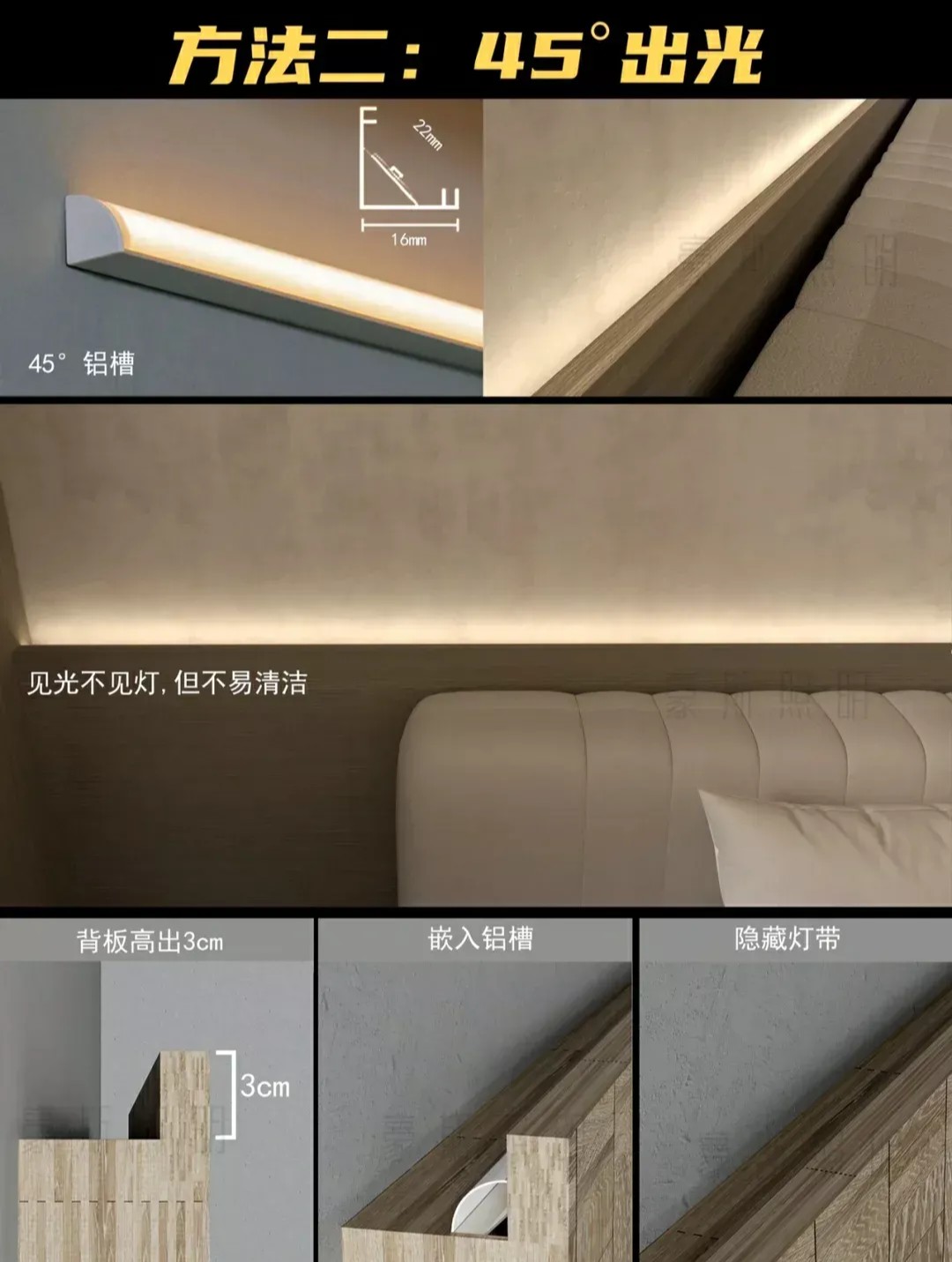 【床头布光】两种方法‼️方法一:向上出光背板开槽1cm距离墙面3cm嵌入无边框铝槽铝槽和背板形成一个平面,易清洁但可以直接看到光源.方法二:45°出光背板高出3cm嵌入45°铝槽见光不见灯但不易清洁两种方法没有好坏之分,看自己喜欢!.背板做多高?背板(h)>床(h)先把床选好背板比床高才有味道建议高度1.1m-1.2m.灯带选低压色温3000k或3500k空间统一更舒服特别注意要提前规划变压器位置