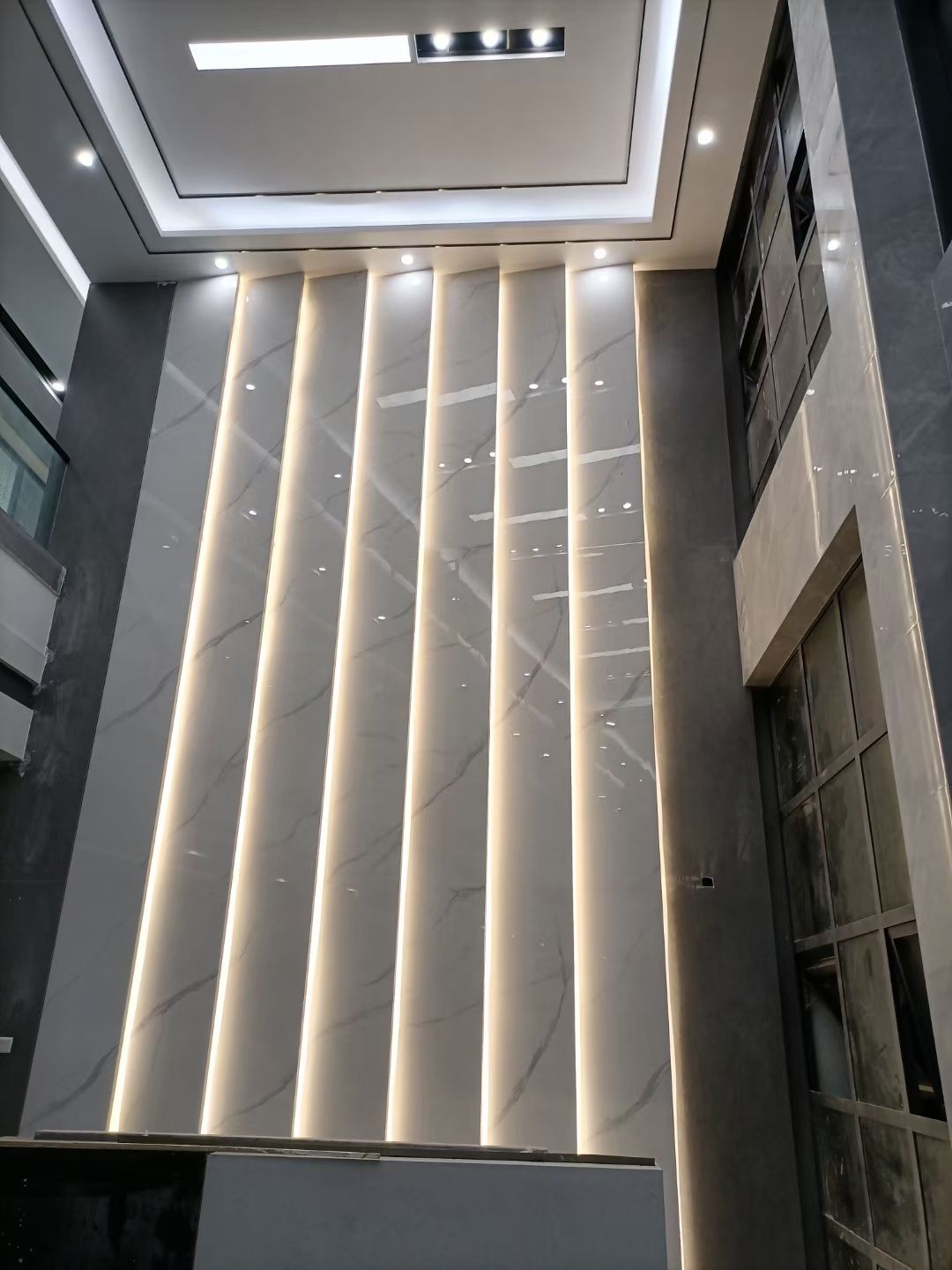 ②线性灯放在顶部,灯光从灯槽处均匀洗亮墙面。