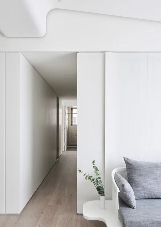 白天和黑夜,兼具开放性和私密性的空间。一楼的通道玻璃墙,与内侧可以电动扭曲翻转的白色屏风,搭建了一个通透明亮的办公创业的开放性空间。大门采用电动感应移门,白天通行无阻不占空间。而到了夜晚,屏风扭转回正、移门关闭通电变雾化玻璃,解决夜晚居住与通道的私密性。