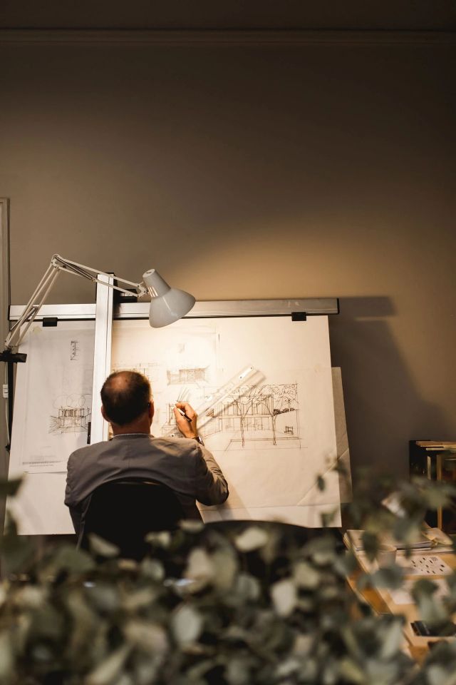 大德餐厅是一家高级寿司料理店,所在地位于成都市中心地段最好的开放式高端购物中心-远洋太古里的二层。设计师在天井最高为8米的空间中,将6个方形发光盒子以积木堆叠的形式设计,形成不同功能的正负空间。盒子内部是相对私密的包间,负空间自然形成走廊和日式景观通道。所有盒子的地面基础退于边缘之内,给人以悬浮、轻盈之感。廊道里错落台阶指引着客人进入包间,屋内略微幽暗的灯光透过和纸与各式的榉木格栅,令人感觉静谧而又温馨。每个包间下部均有玻璃窗口,包间外的日式景观尽收眼底,使内外空间产生互动。寿司吧台则设计十分质朴,整块的实木吧台保留了最自然的姿态,不作多余修饰。后方以一整面巨浪花纹大理石装饰,表现出渔夫和寿司职人强大的活力。