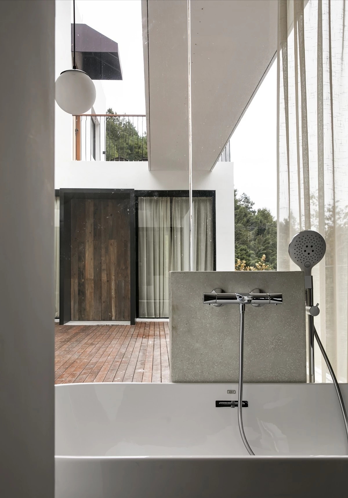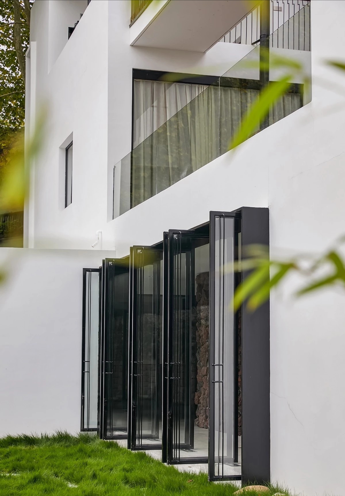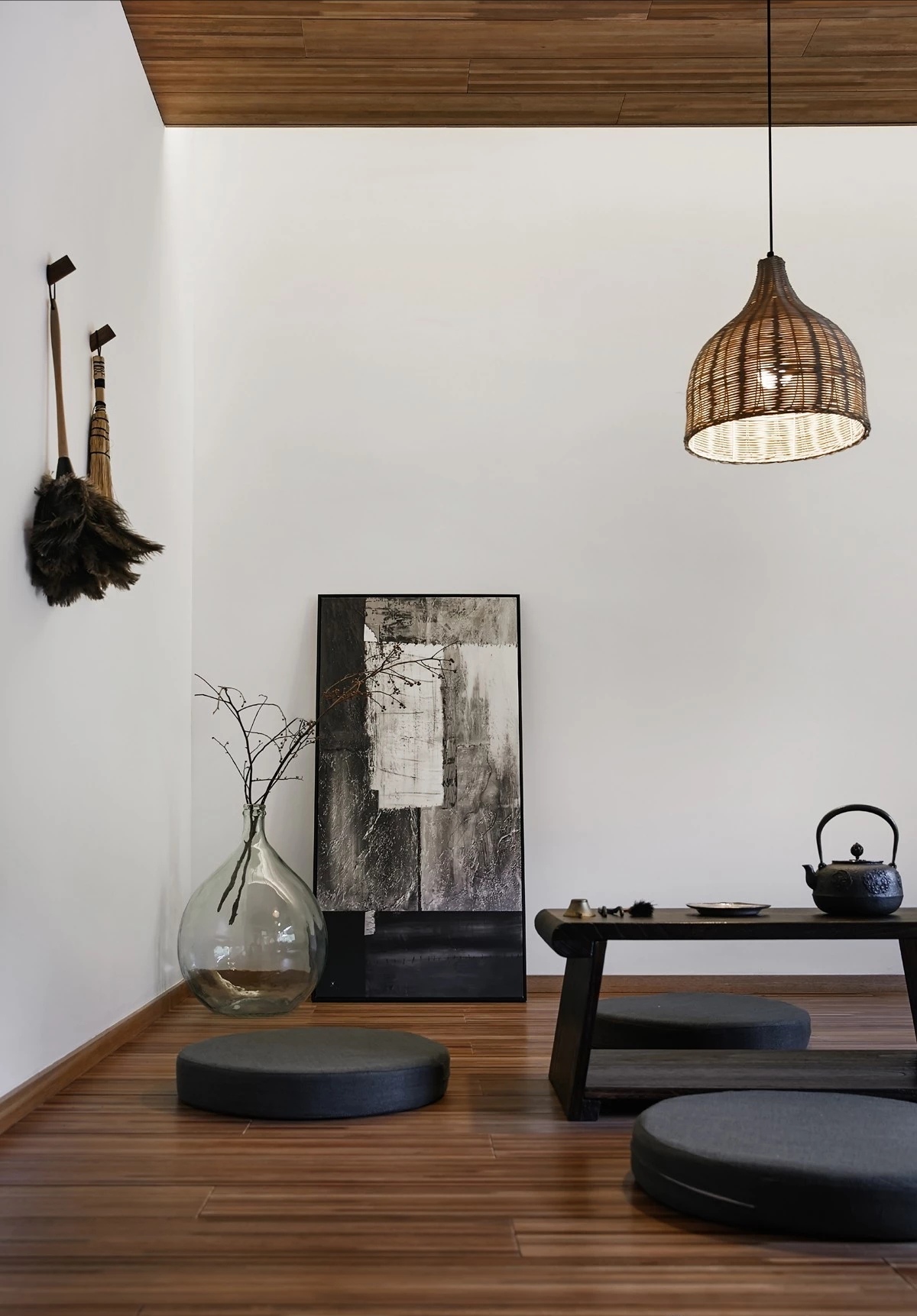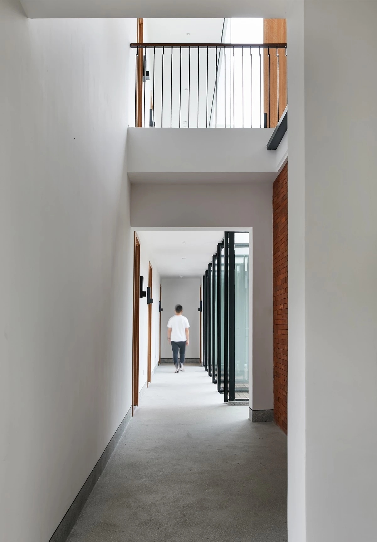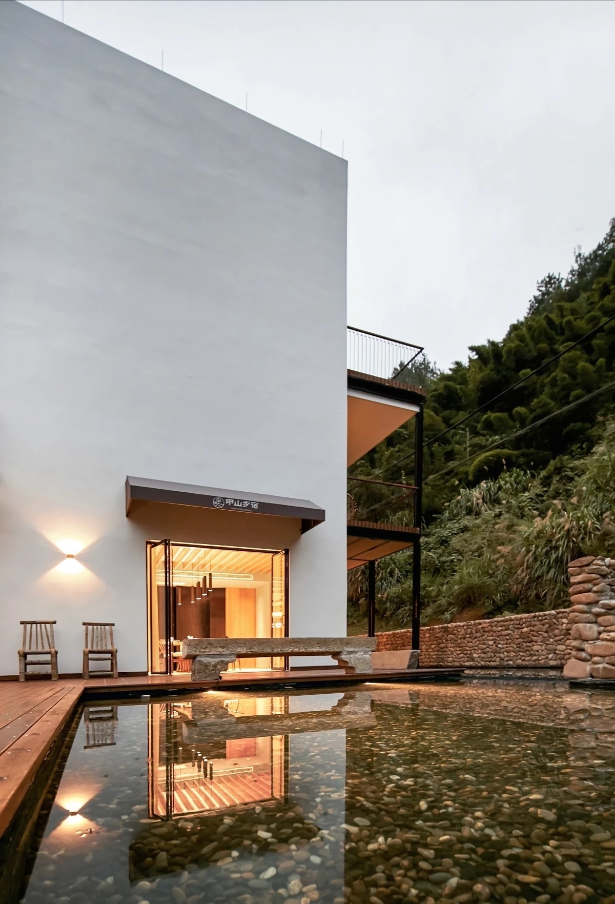 申山乡宿|室内选材大多使用原木和水磨石,呈现自然的质感,主调是纯粹的白,黑色框线作为辅助、勾勒。项目保留了楼梯采光的人字型窗格,选择旧木板和自行车作为装饰,编织工艺的淳朴韵味与金属制品的现代格调相辅相成,在富有年代感的细节中,品味当下生活的不凡意趣。床铺、茶座在布置中显得较为低矮,陈设也偏于简洁,饰物虽少却很细致,能烘托起应景的氛围,以此营造出亲近自然、享受当下的舒适感。