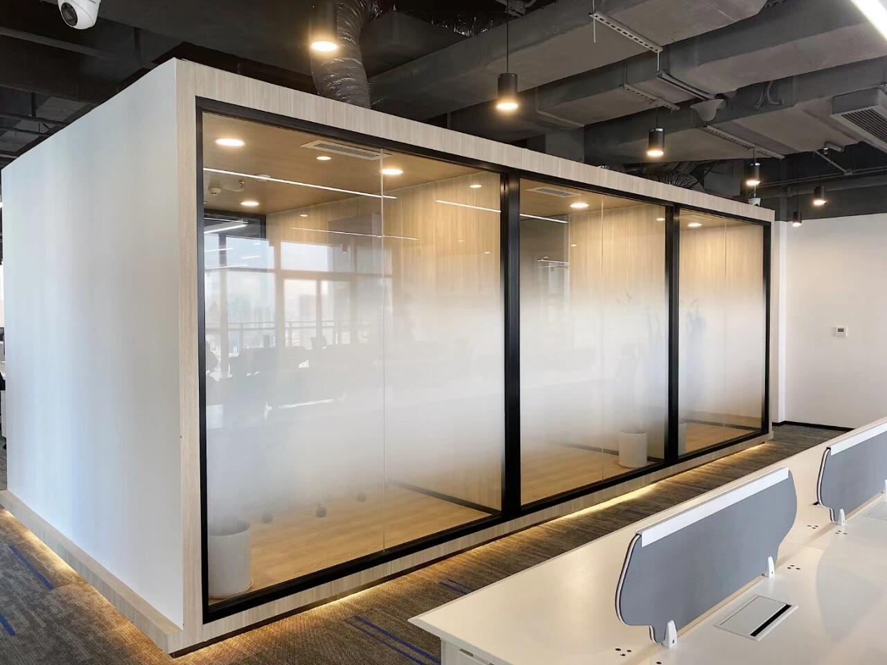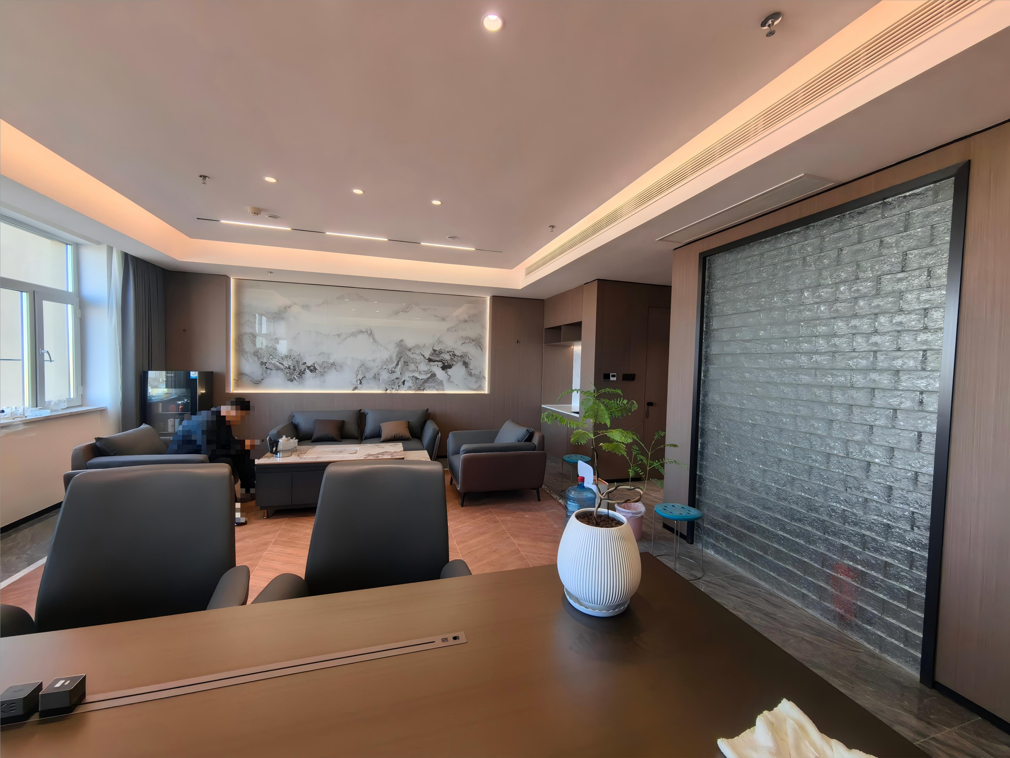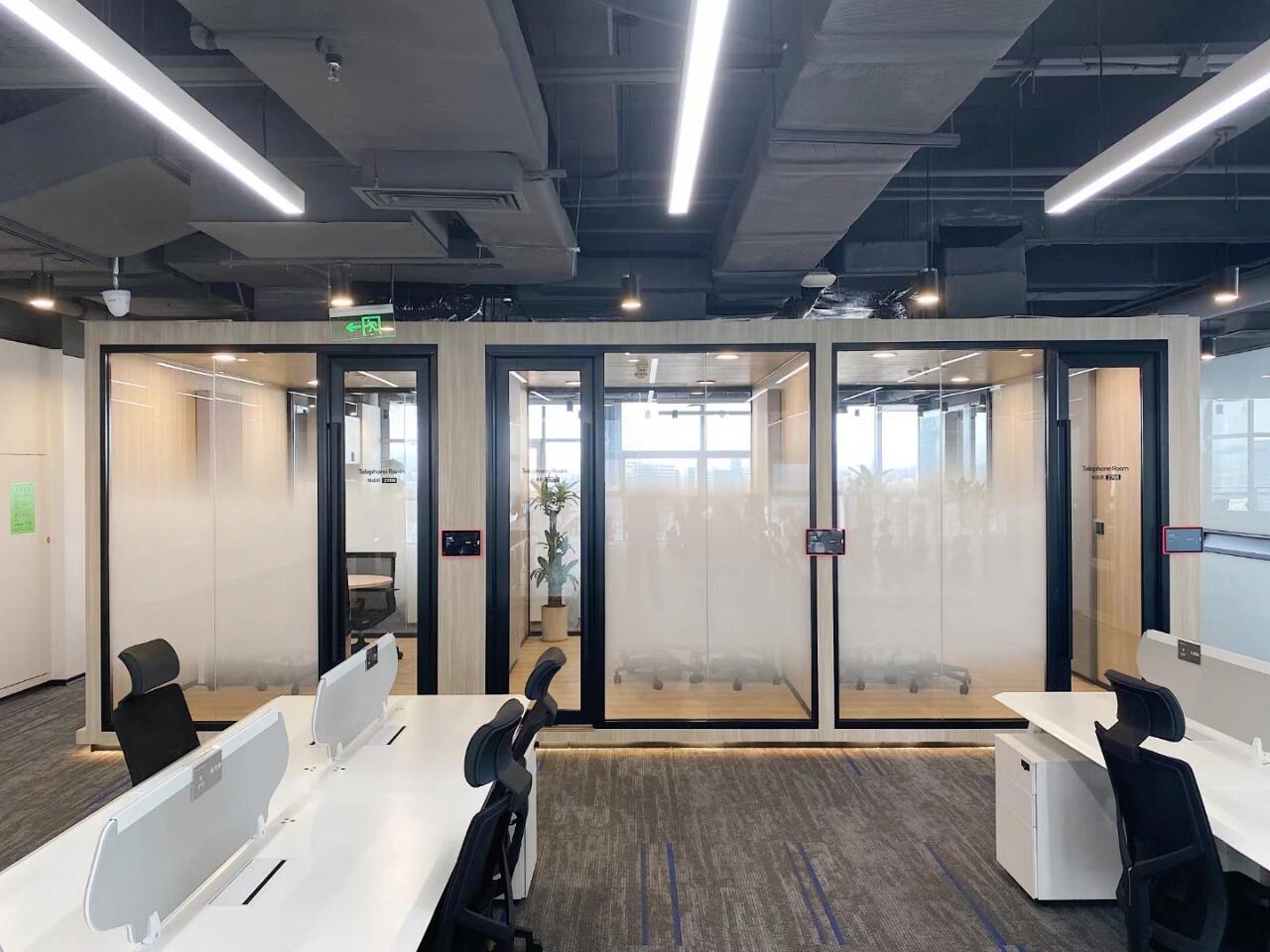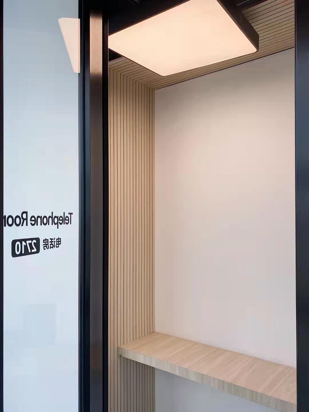 沿窗嵌入5个「太空舱式电话亭」,配备智能雾化玻璃兼顾隐私与采光;复合摄影棚实现直播/产品拍摄模式秒切换,波纹吸音墙解决开放办公声场痛点。