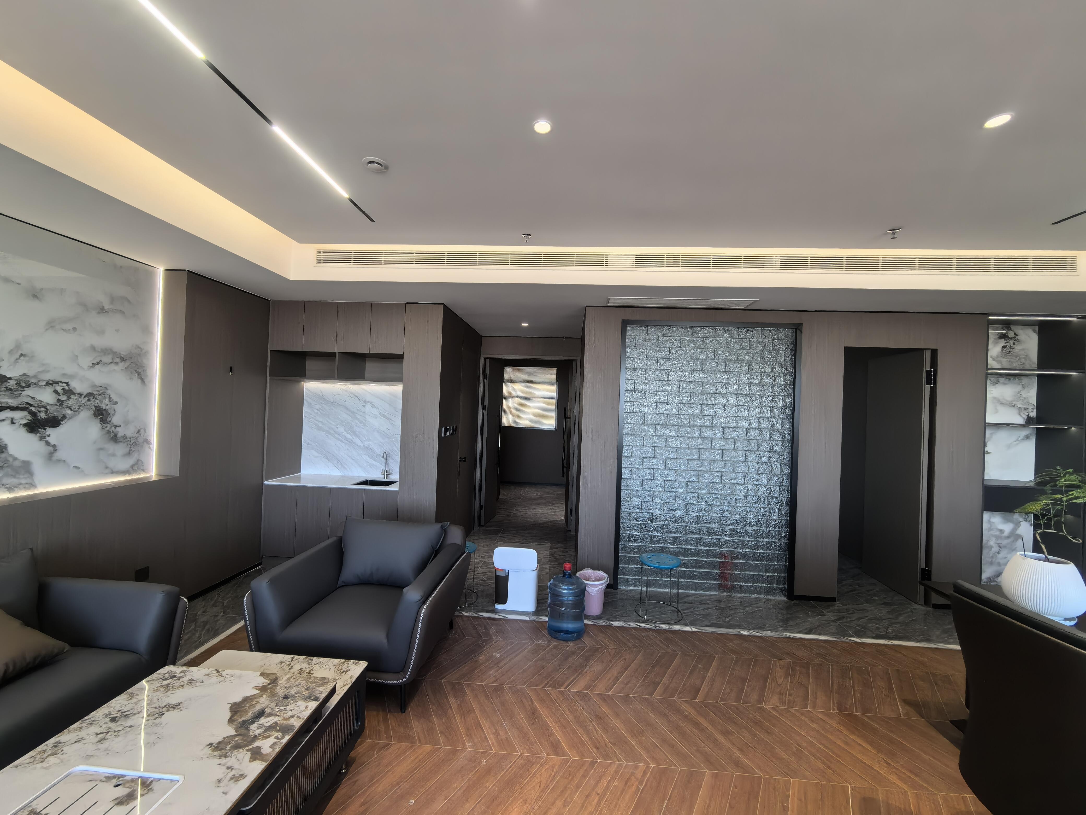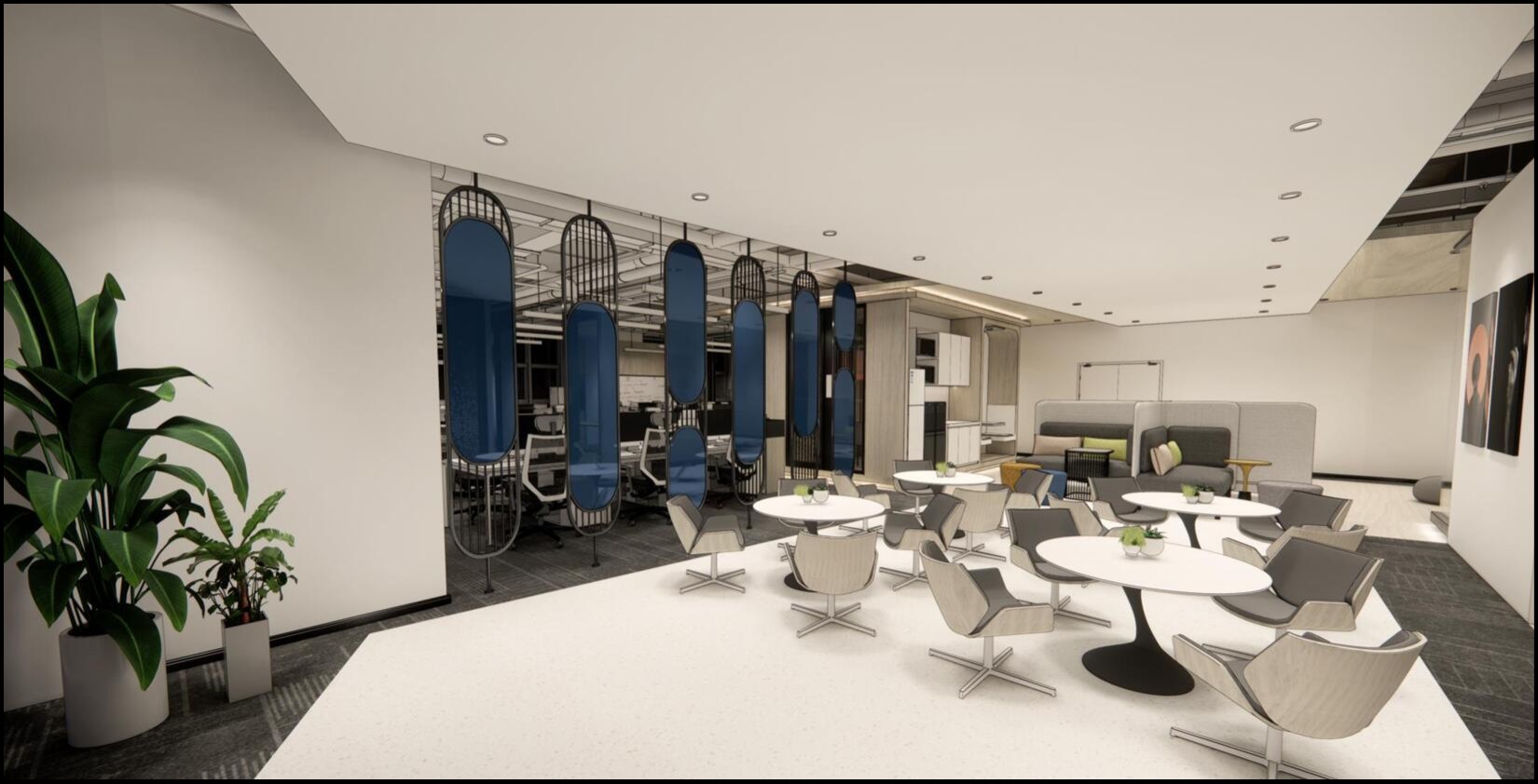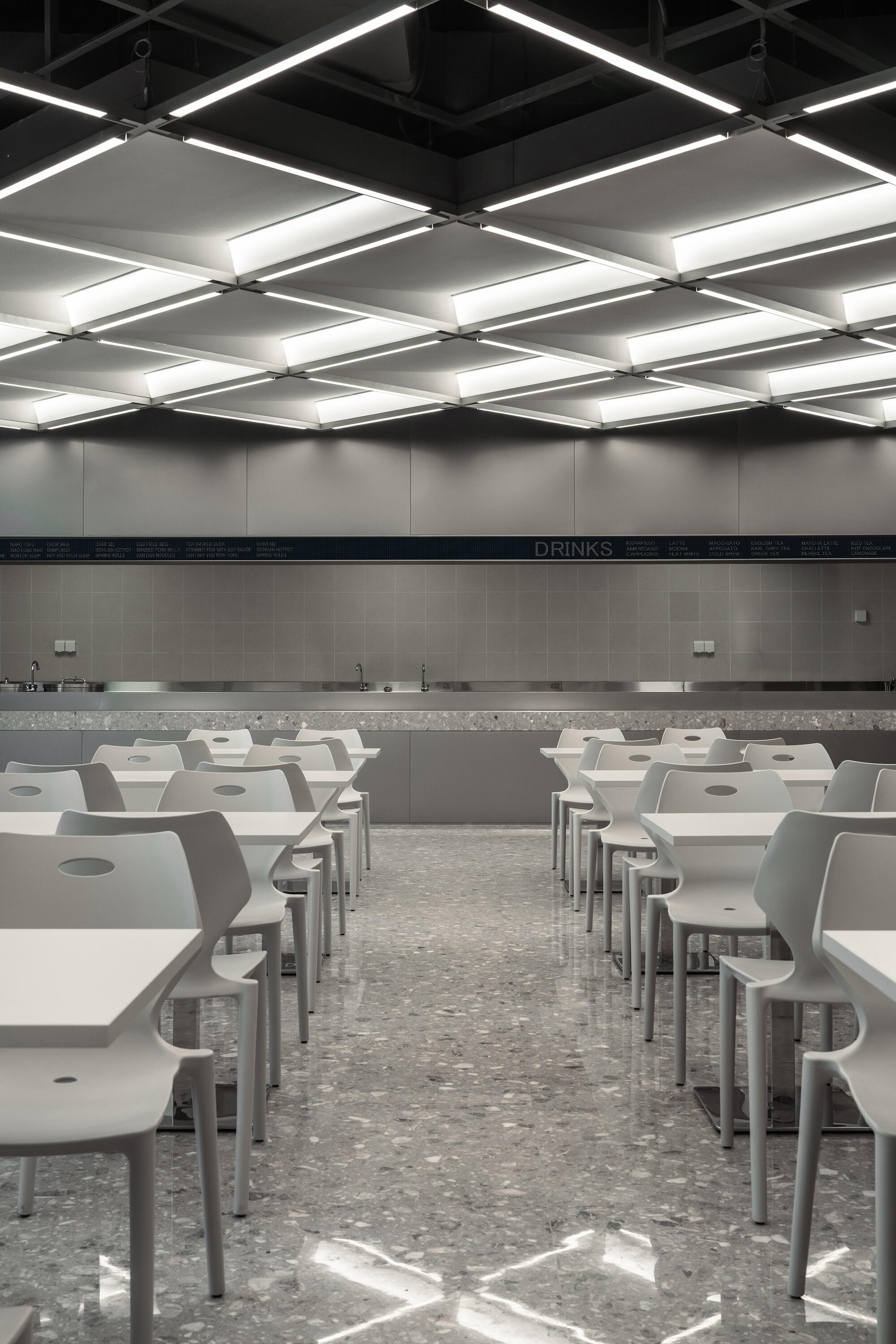 沿窗嵌入5个「太空舱式电话亭」,配备智能雾化玻璃兼顾隐私与采光;复合摄影棚实现直播/产品拍摄模式秒切换,波纹吸音墙解决开放办公声场痛点。