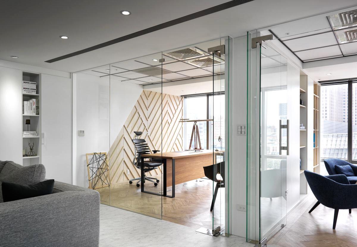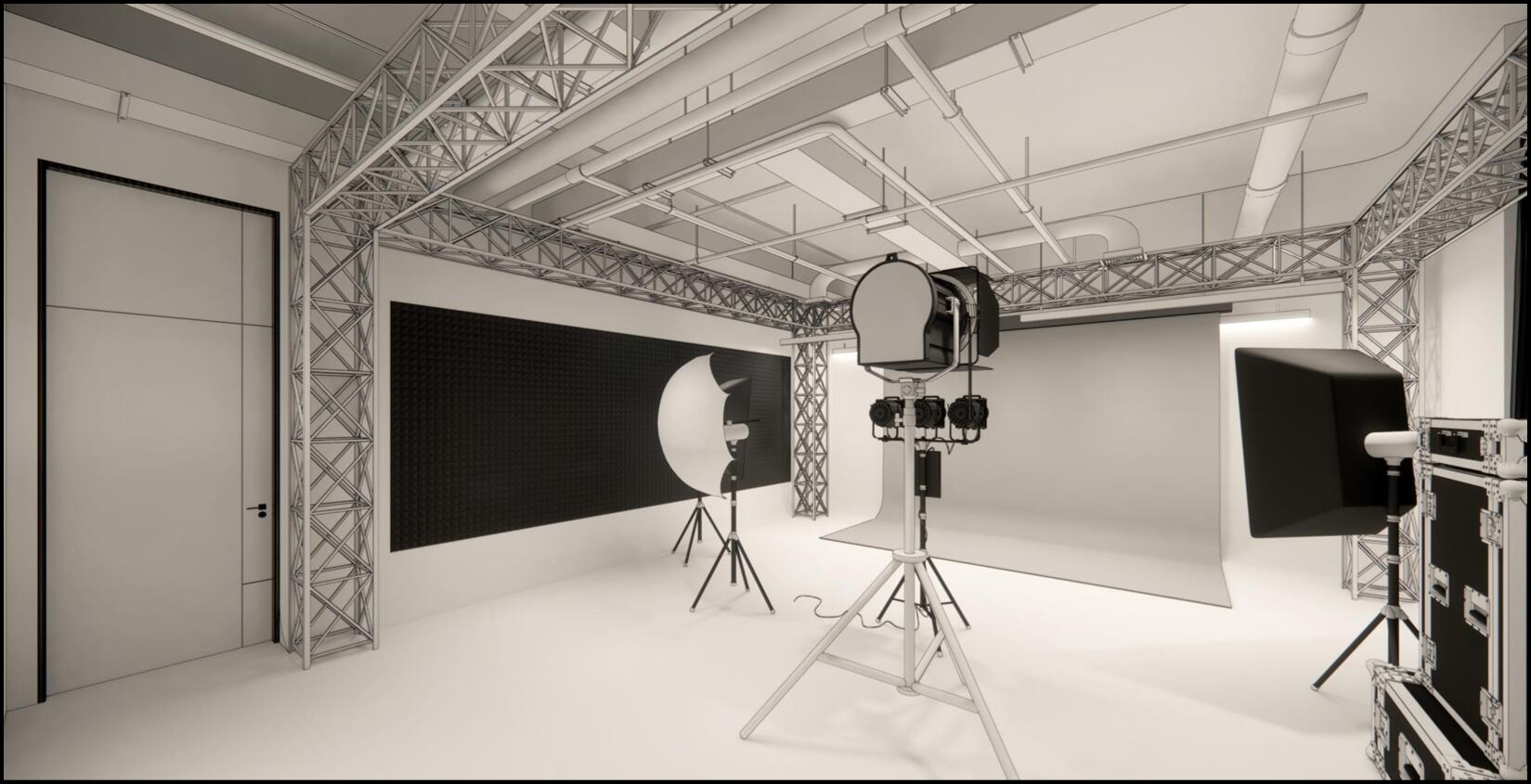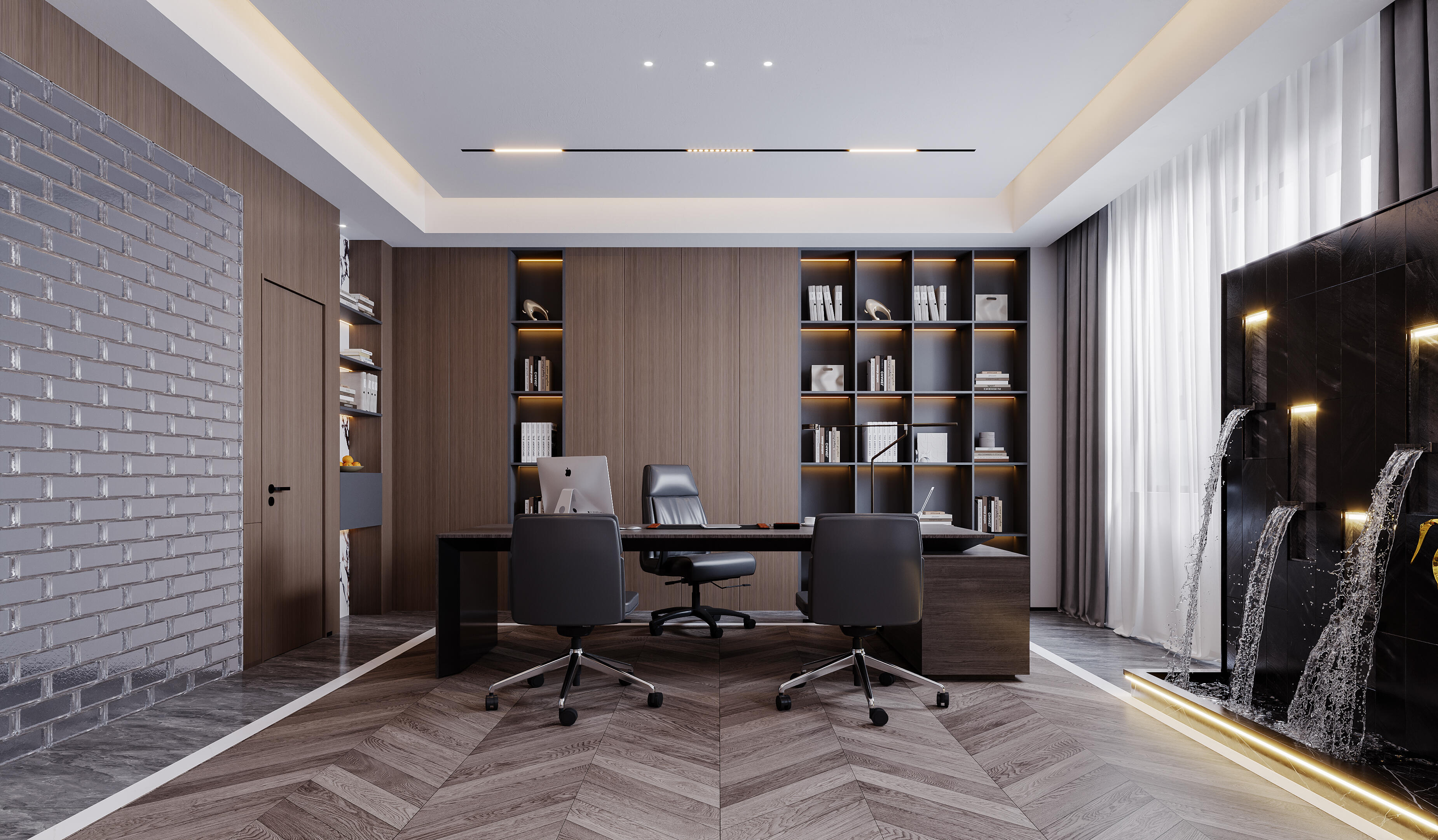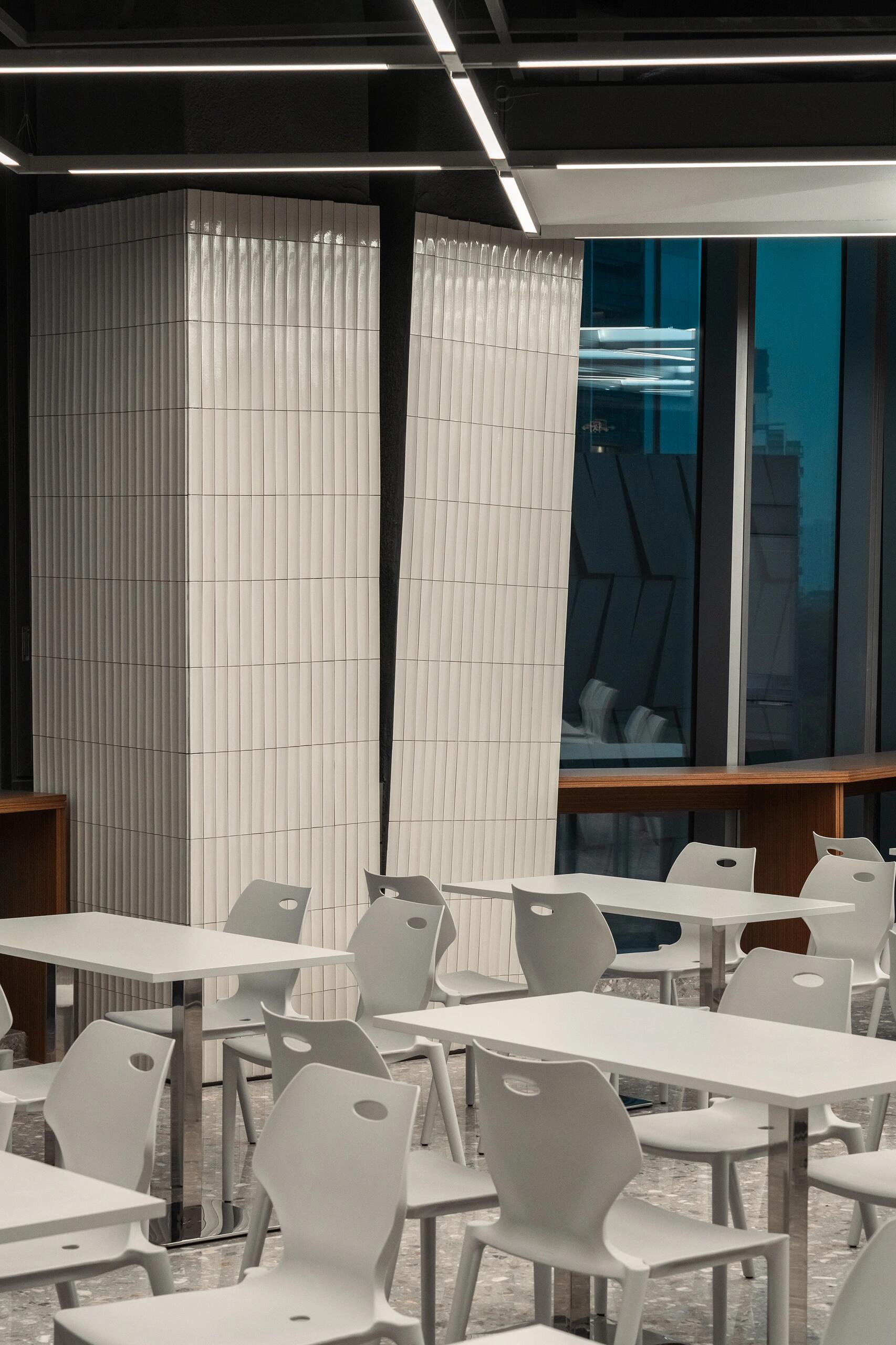 沿窗嵌入5个「太空舱式电话亭」,配备智能雾化玻璃兼顾隐私与采光;复合摄影棚实现直播/产品拍摄模式秒切换,波纹吸音墙解决开放办公声场痛点。