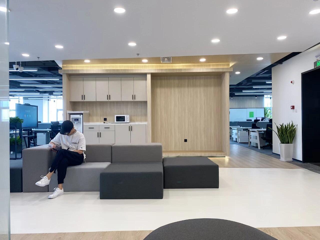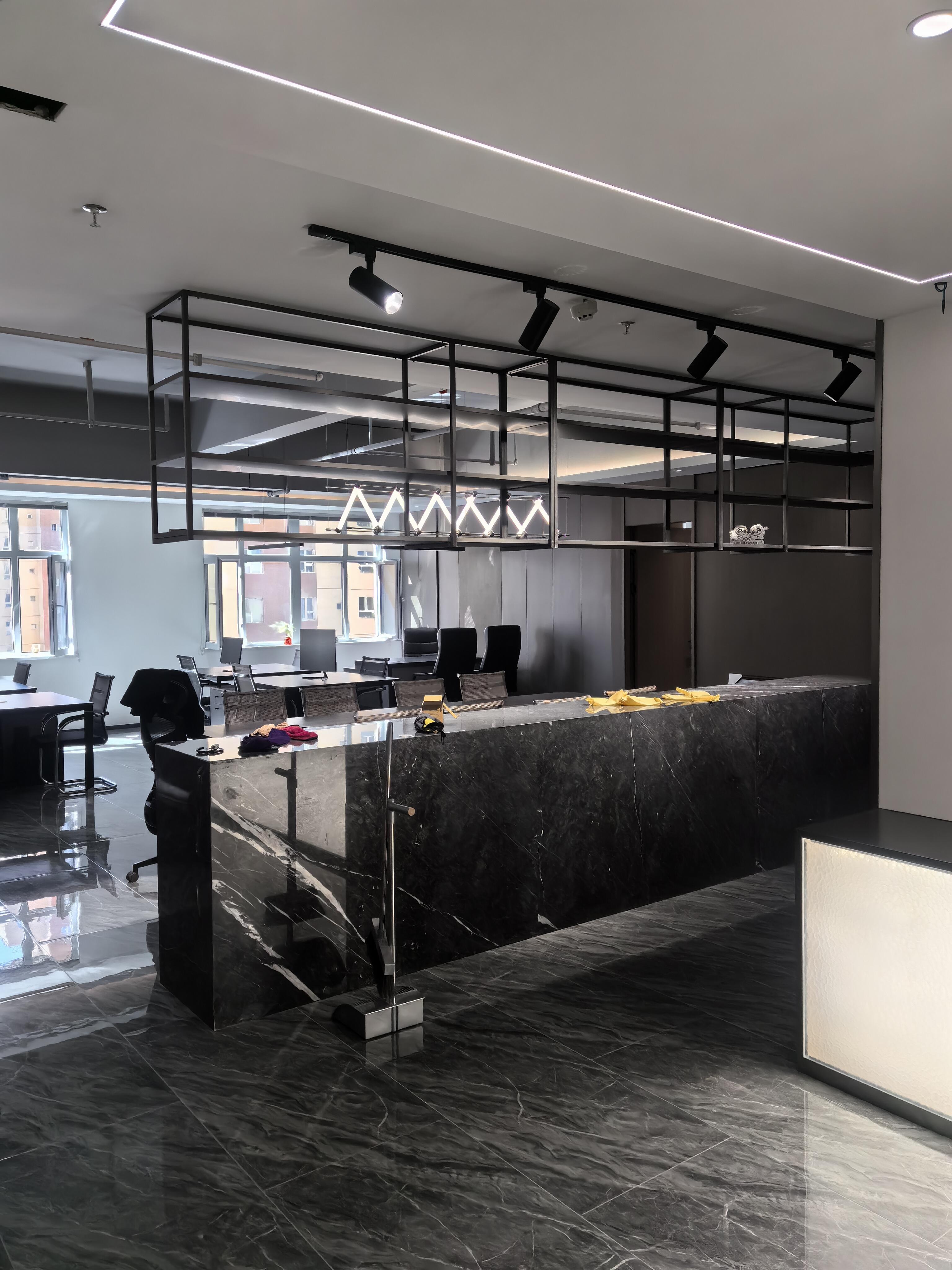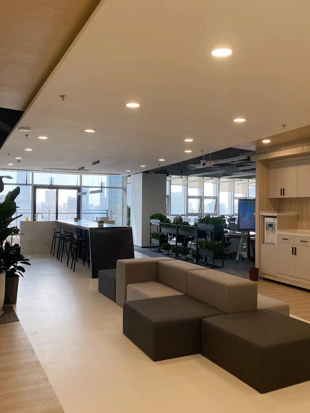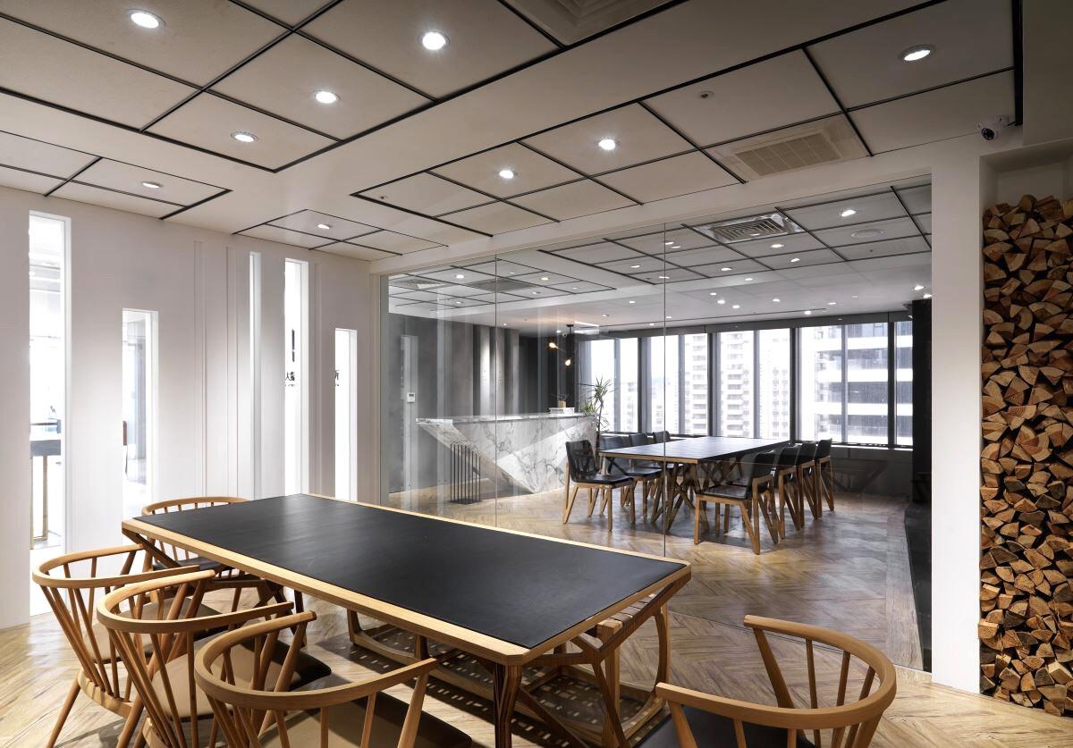 拆除传统格子间,以原木色系工位岛台串联整层。黑灰色天花轨道系统暗藏灵活分区逻辑,满足200+工位的同时,预留30%可扩展空间应对团队扩张。