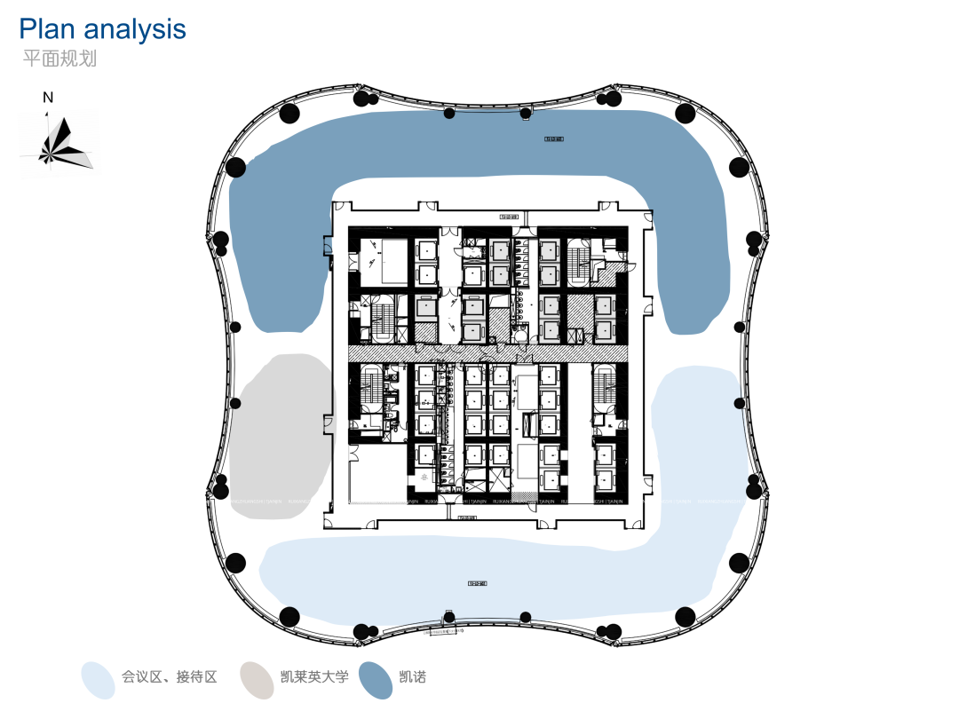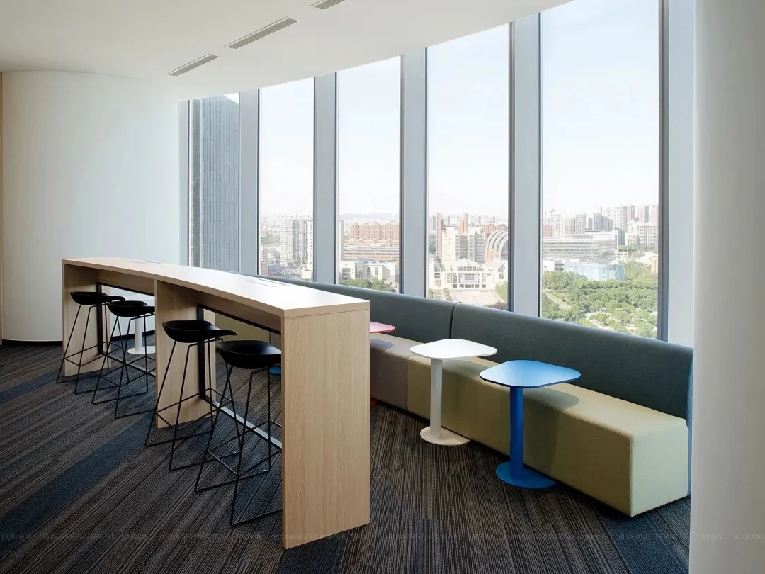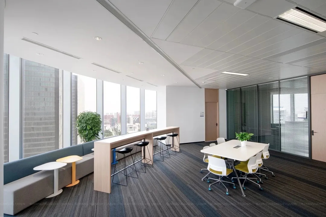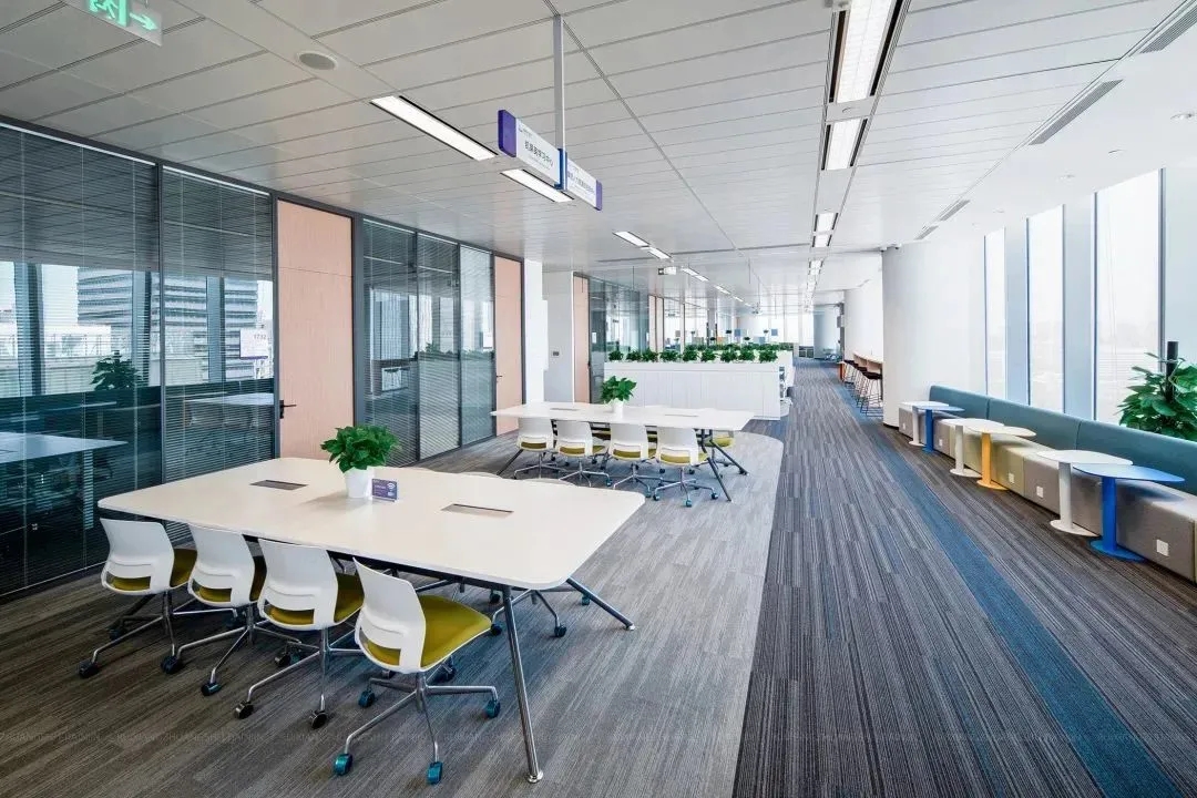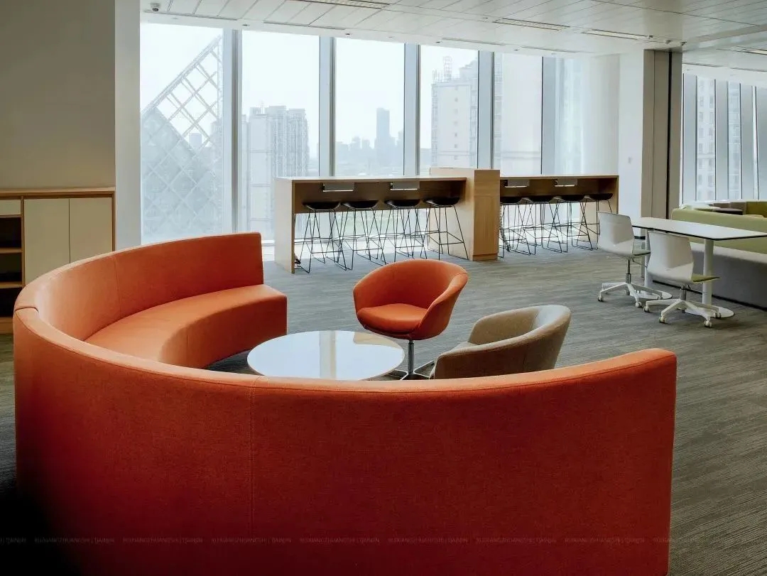 为了实现不同团队之间的讨论和合作,对不同的空间区域进行分区设计,如开放式沙发区、会议桌区等。