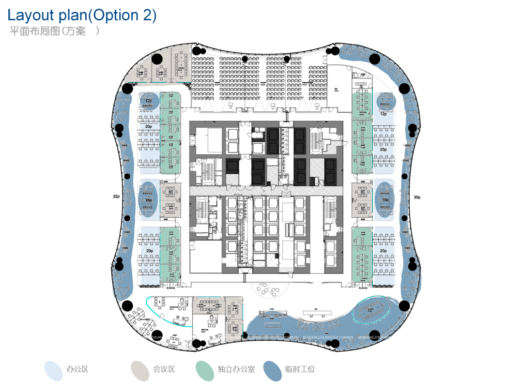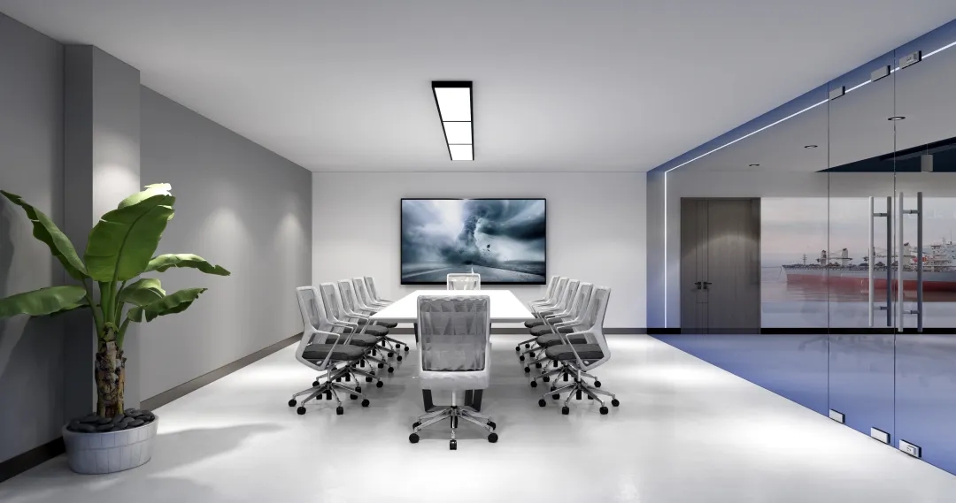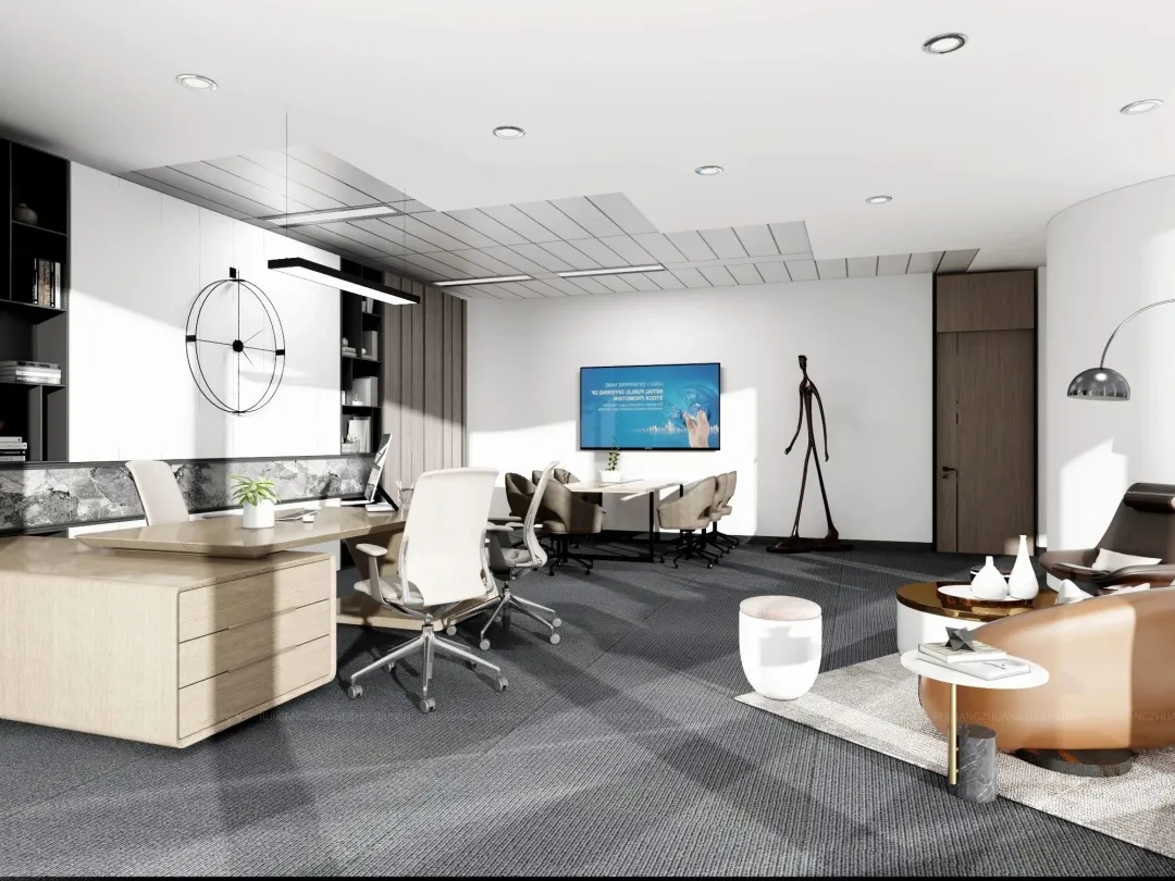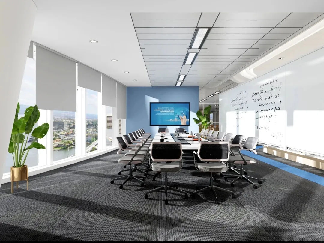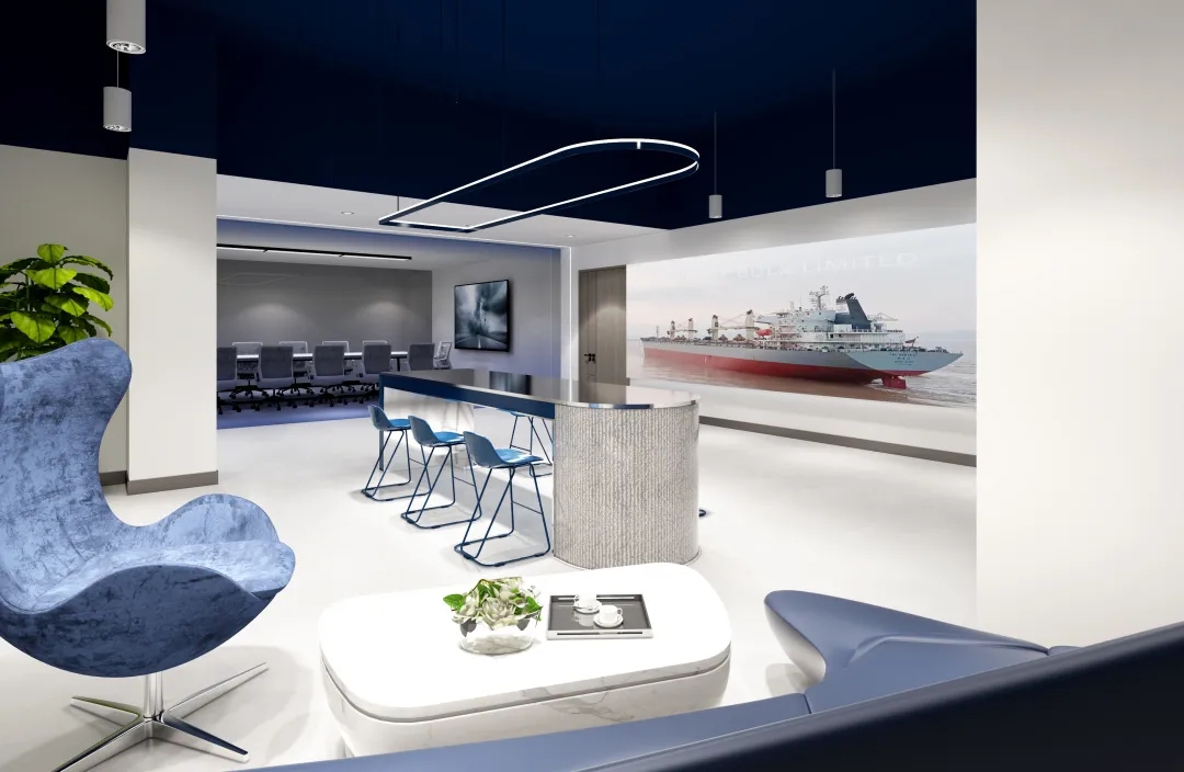 装修设计意在展现企业的品牌形象和企业文化。以蓝色点缀色调,使人们联想到创新和前瞻性,也一种非常充满活力和新鲜感的颜色组合,为办公室带来现代感和精神振奋。