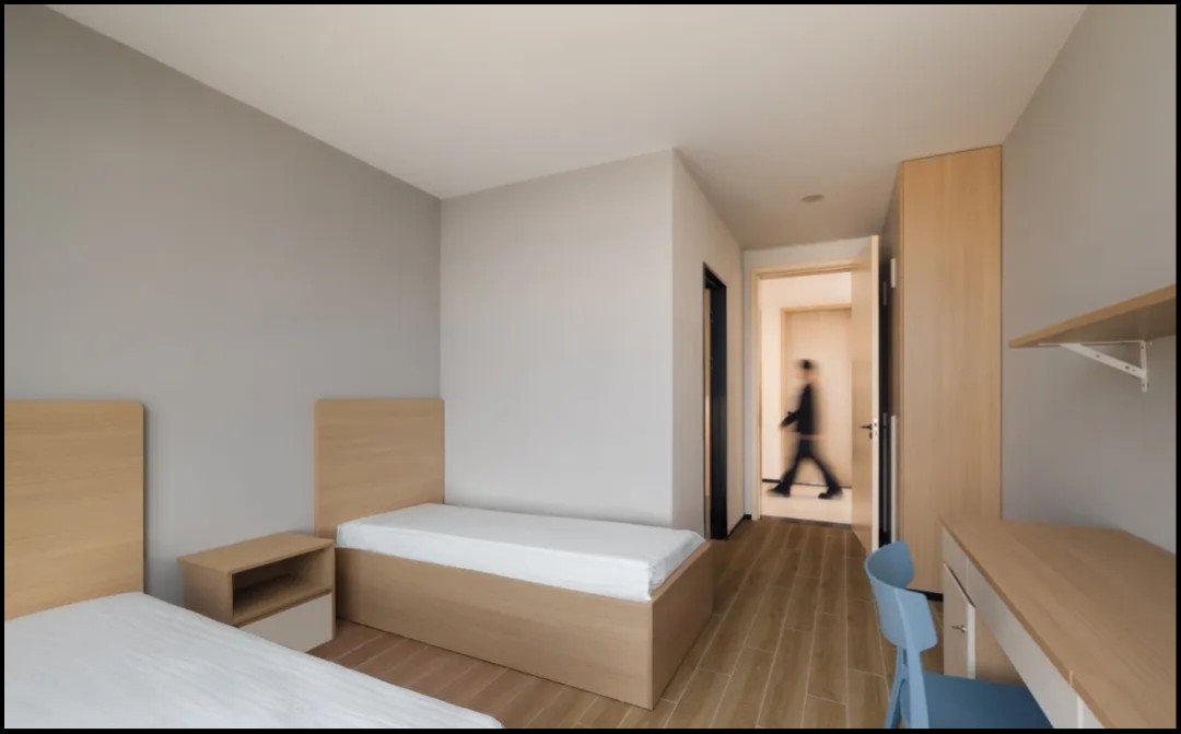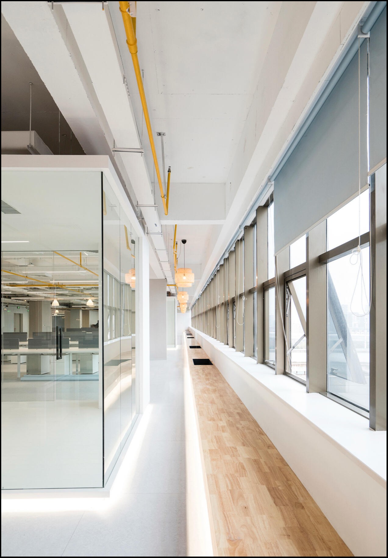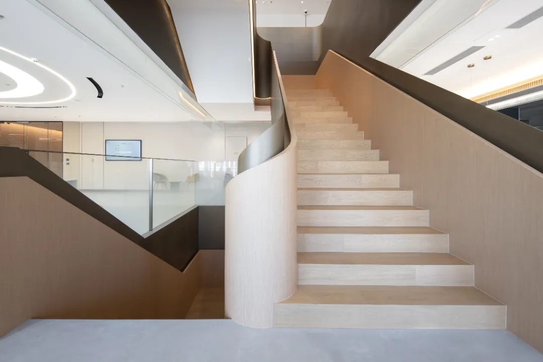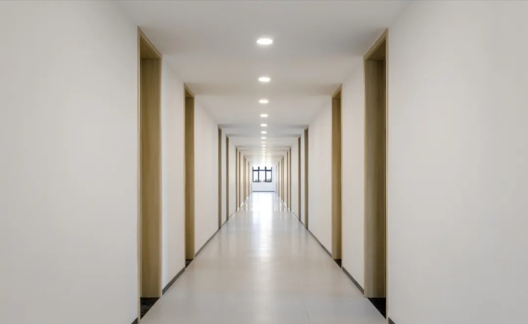 走廊两侧超白玻璃隔断的运用,不仅减少了房间之间视觉上的阻挡,也使得走廊更加通透干净,又保证了空间使用的隐私。空间中大篇幅“木”元素的运用,不仅为空间增添了温暖,还赋予了空间更丰富的细腻质感。