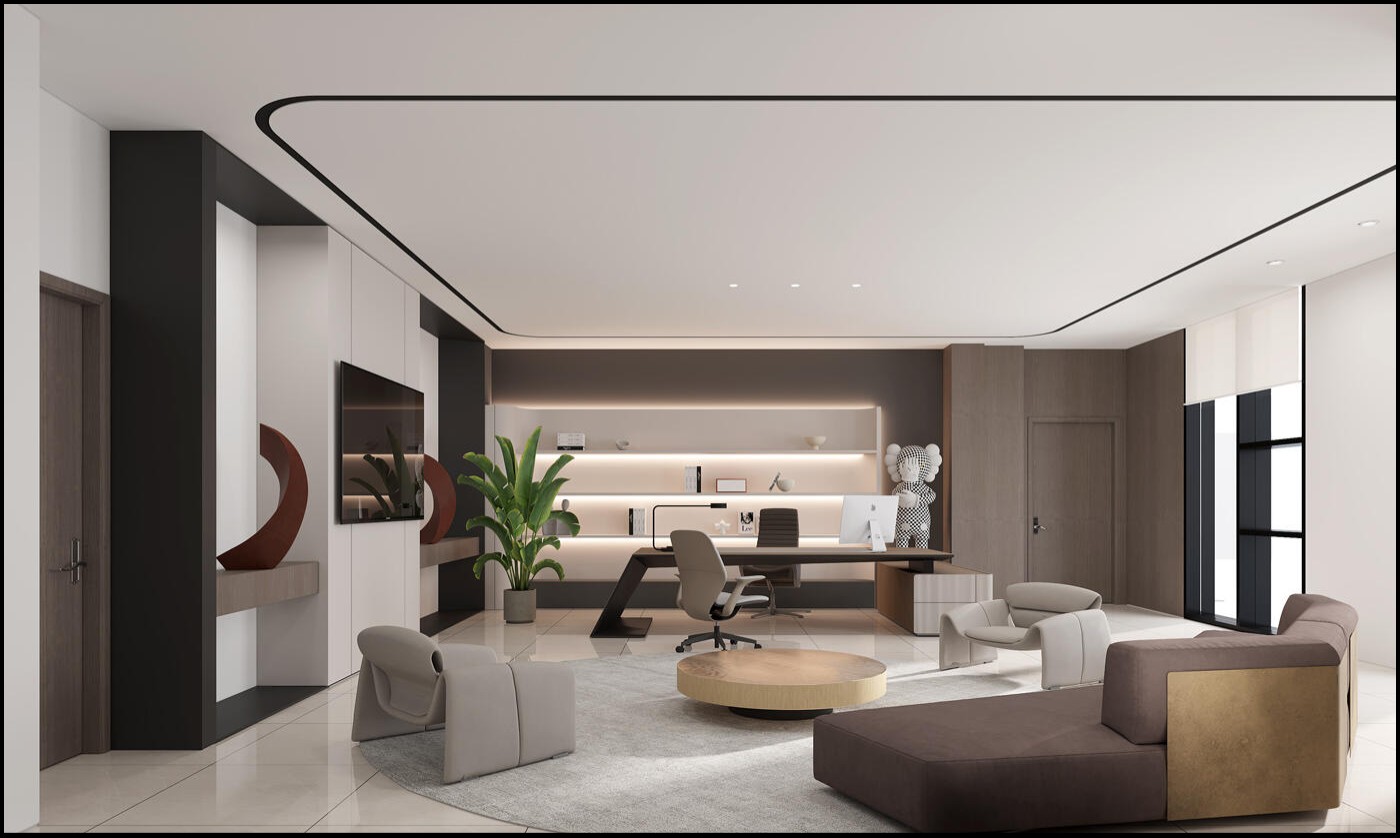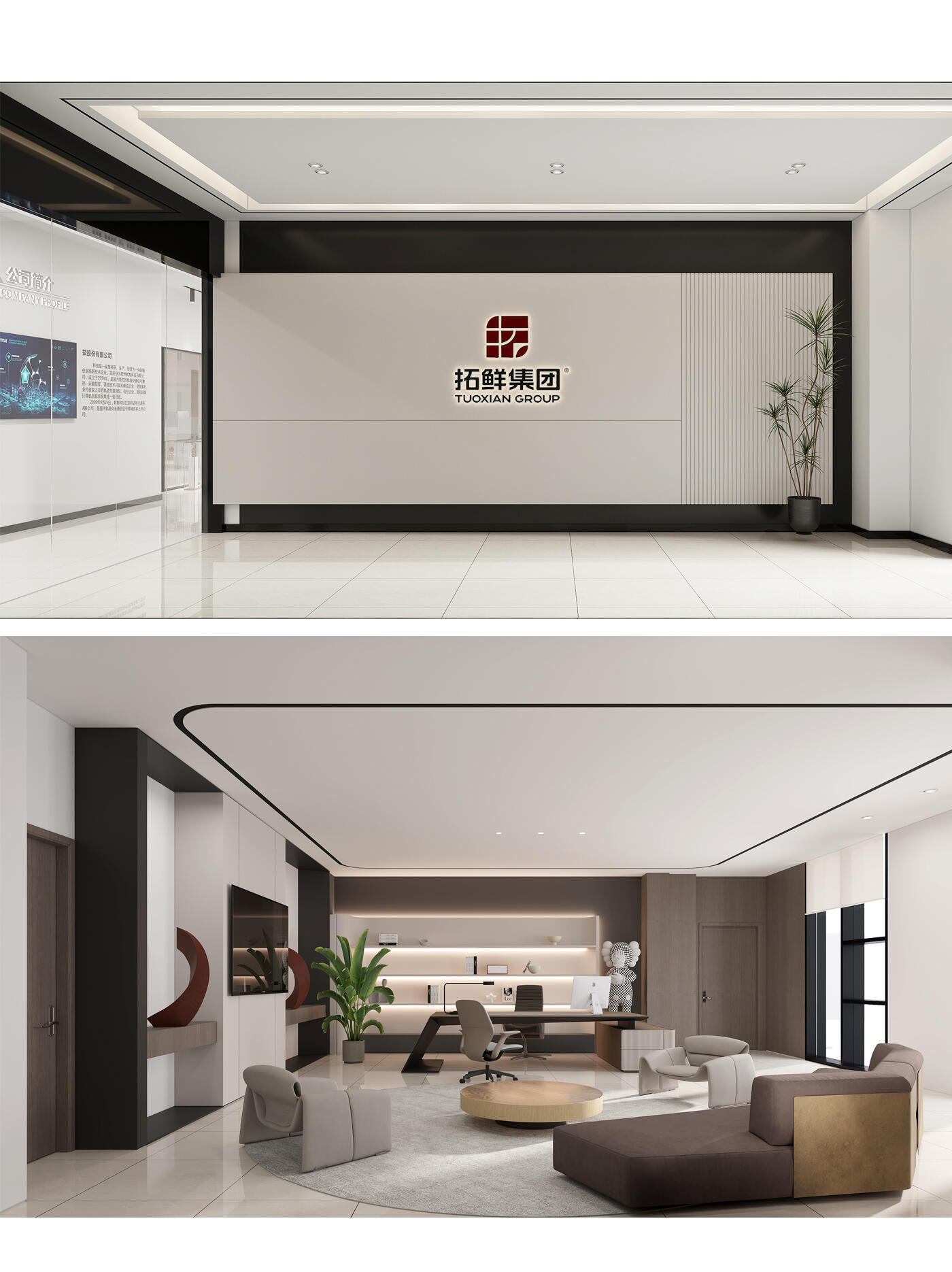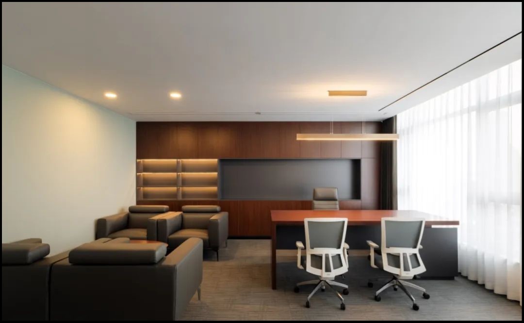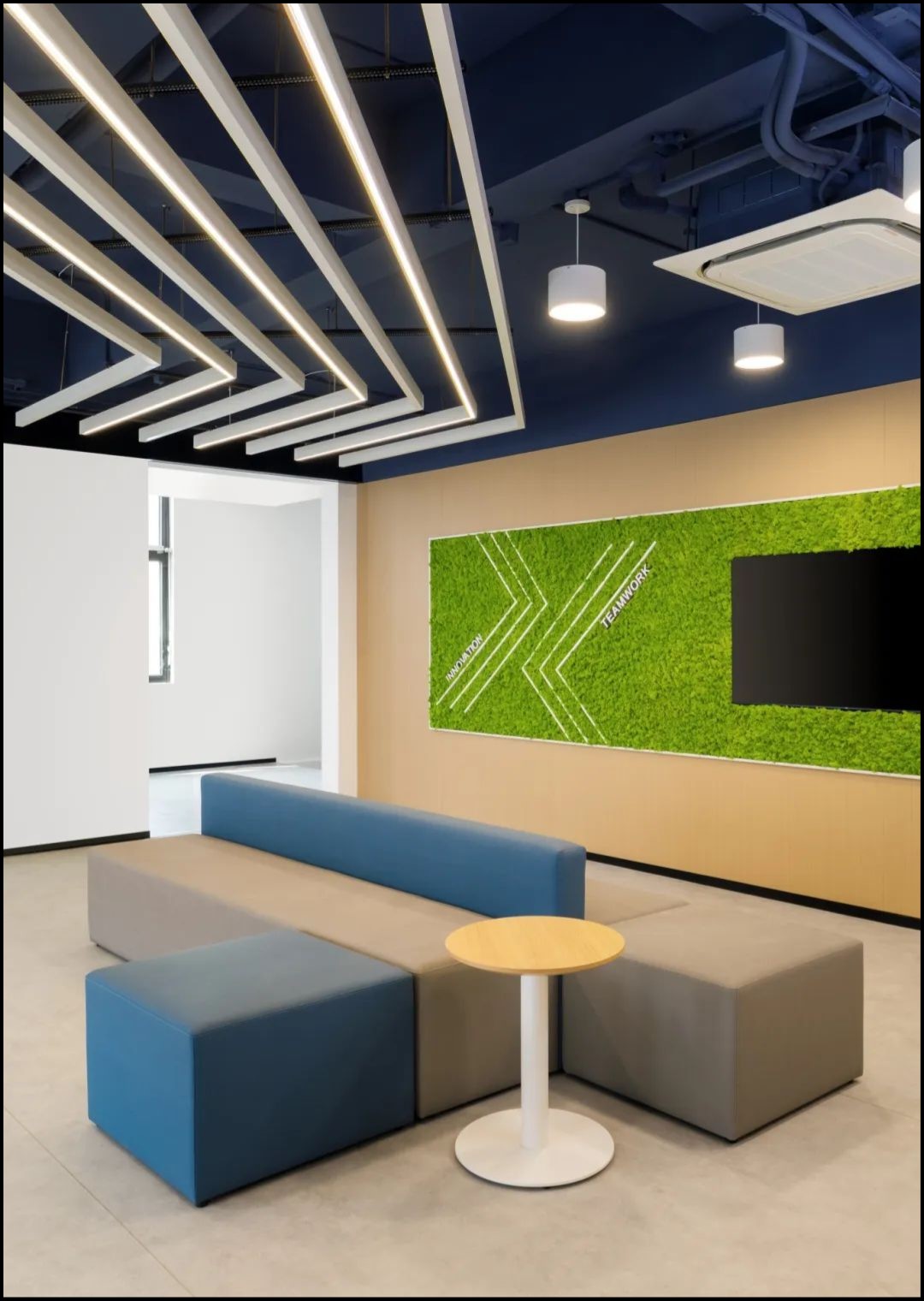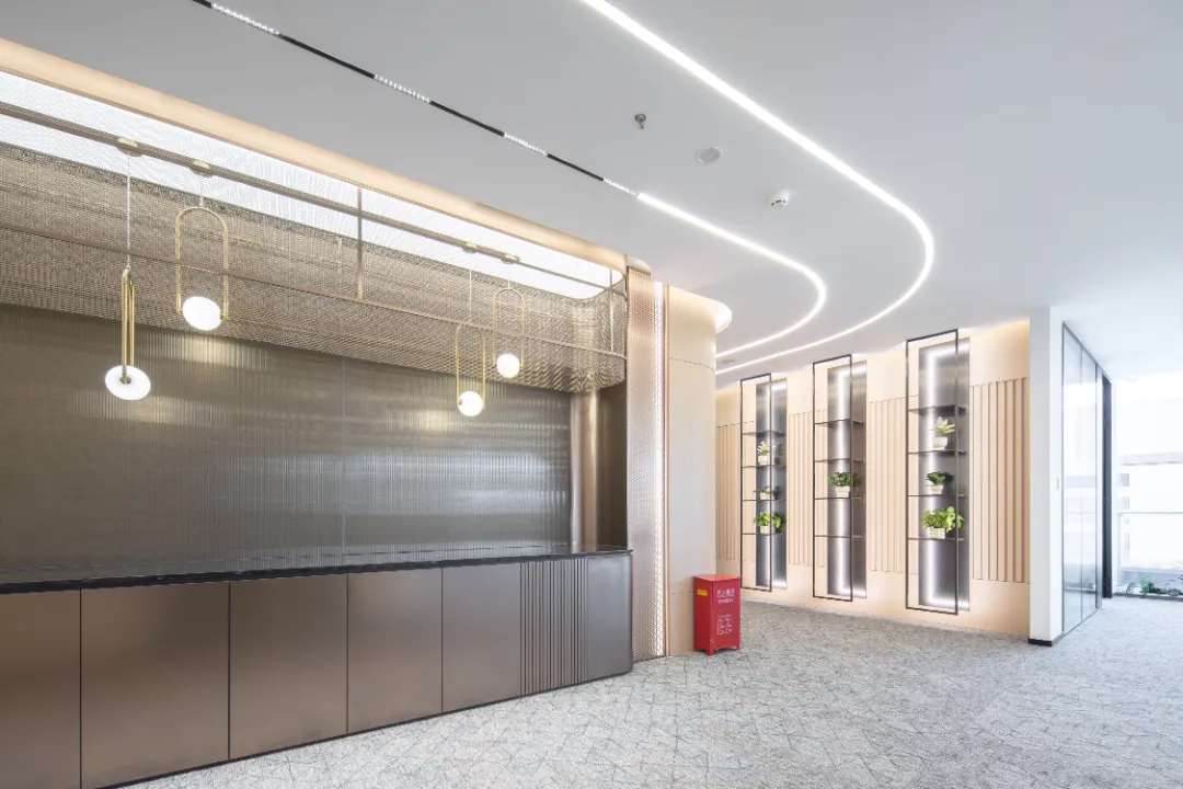 接待区融入绿植与艺术装置,为访客营造舒适通透的视觉印象。半开放式设计兼顾私密与开放,配备灵活移动家具与智能投屏设备,满足商务洽谈、客户沟通等多场景需求。暖色调灯光与绿植墙,营造轻松高效的交流氛围;顶面流线型灯带与企业LOGO线条相呼应,LED线性灯光随空间纵深渐次延展,于光影律动中构建极具未来感的视觉张力。