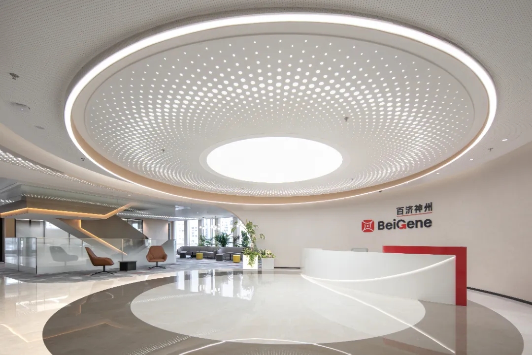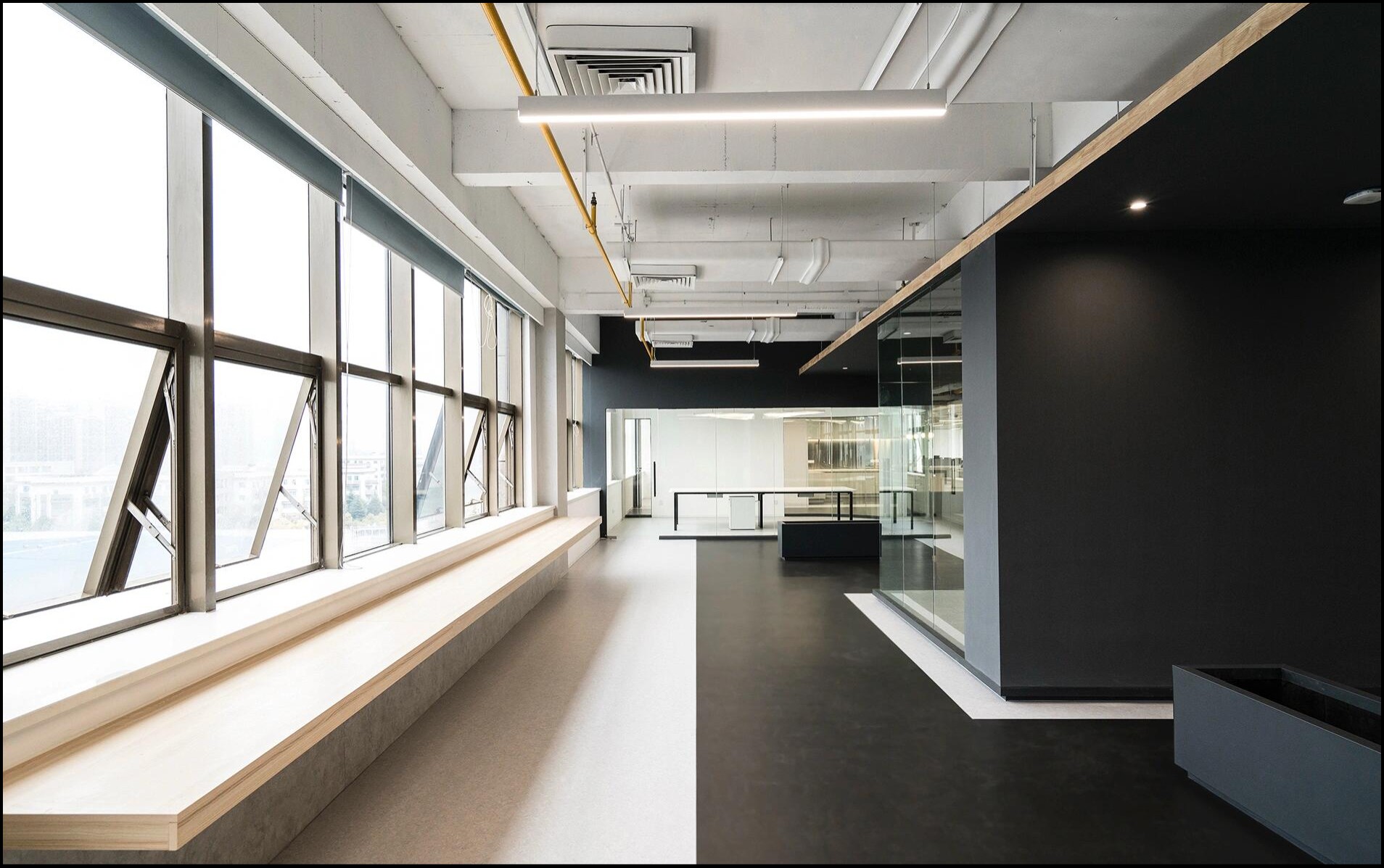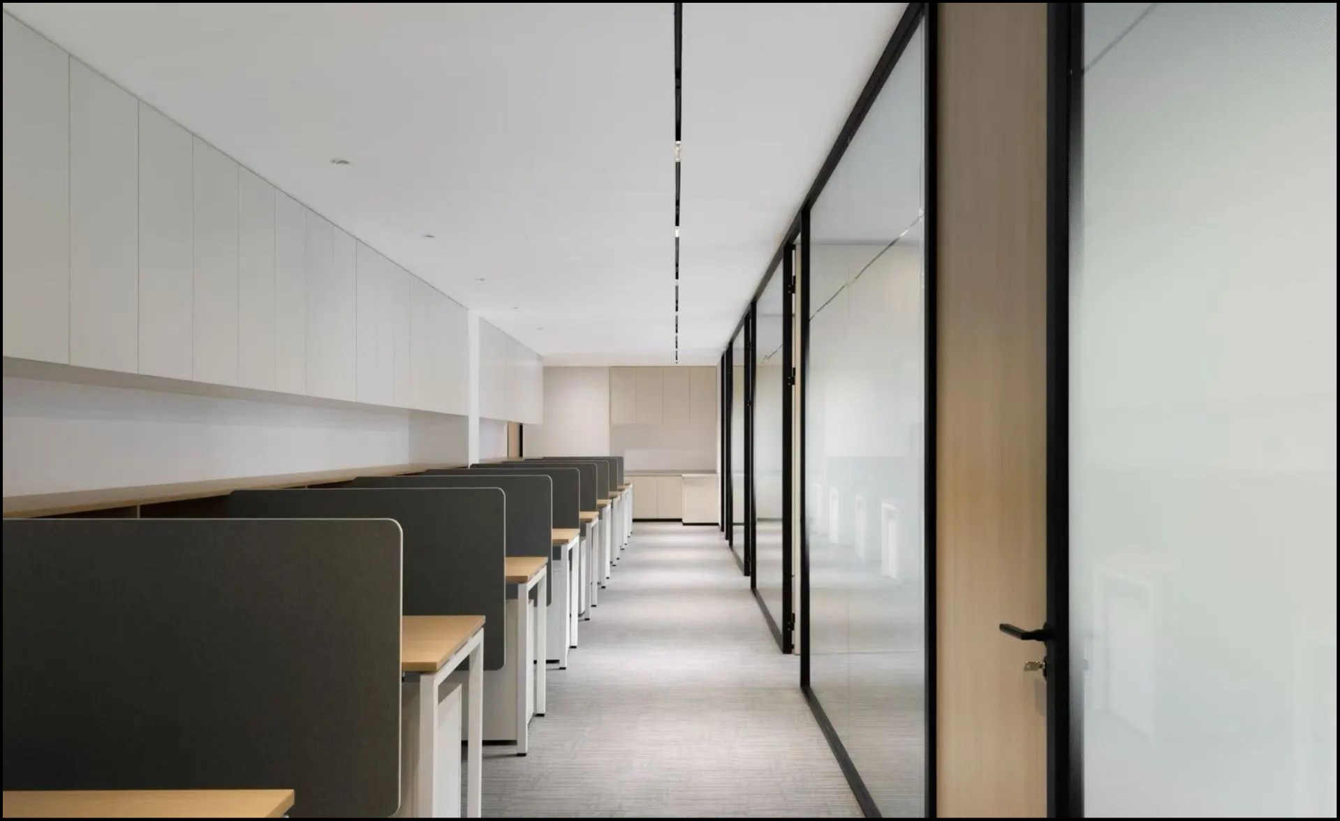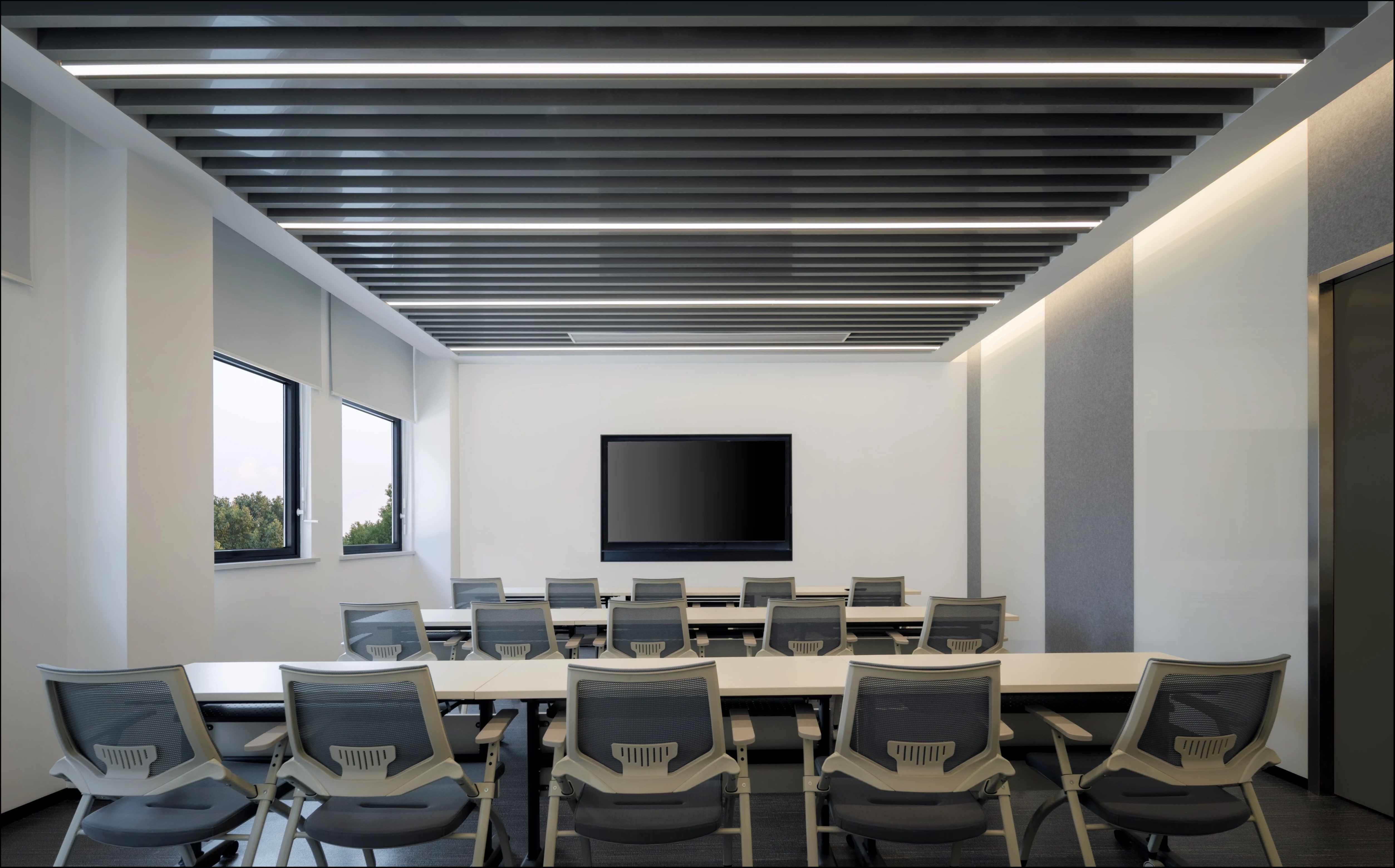 接待区融入绿植与艺术装置,为访客营造舒适通透的视觉印象。半开放式设计兼顾私密与开放,配备灵活移动家具与智能投屏设备,满足商务洽谈、客户沟通等多场景需求。暖色调灯光与绿植墙,营造轻松高效的交流氛围;顶面流线型灯带与企业LOGO线条相呼应,LED线性灯光随空间纵深渐次延展,于光影律动中构建极具未来感的视觉张力。