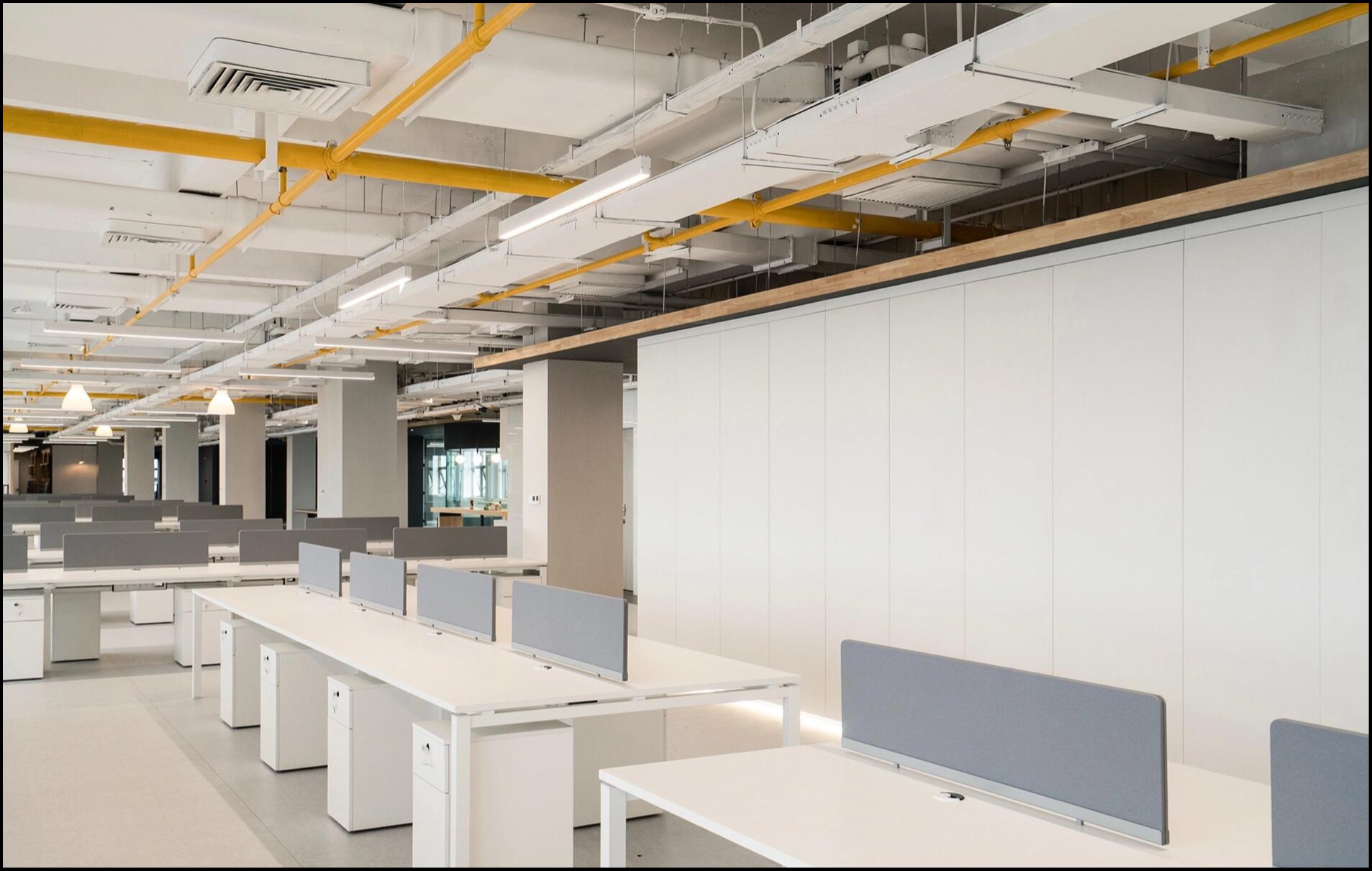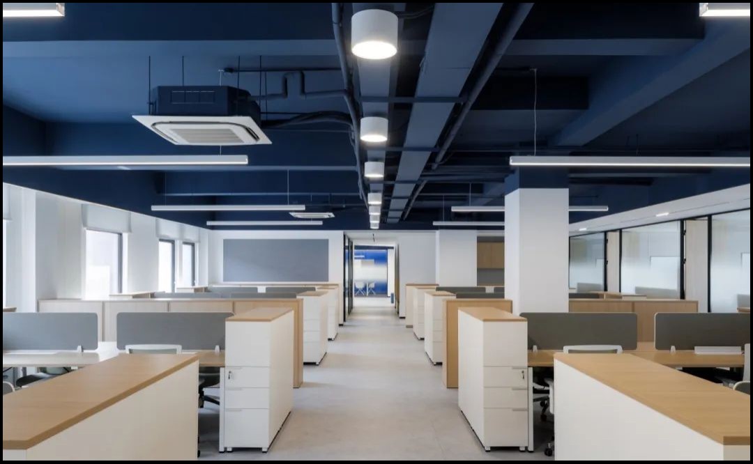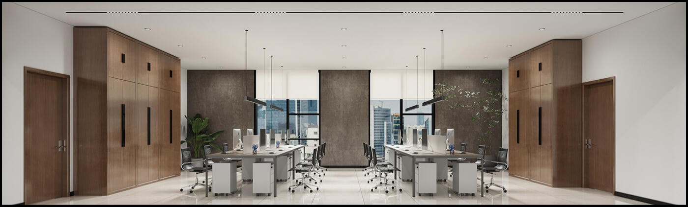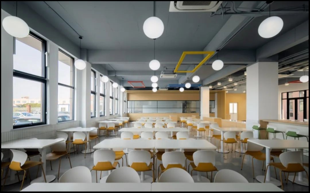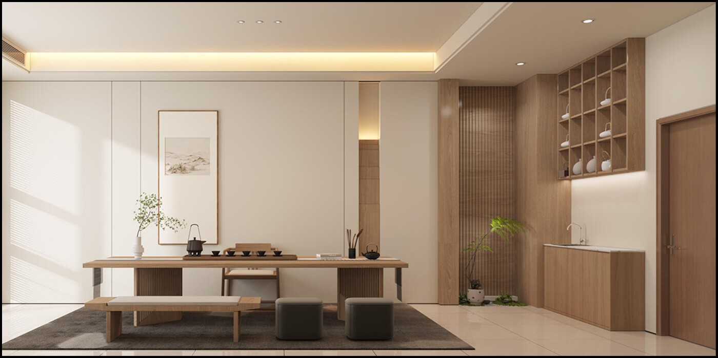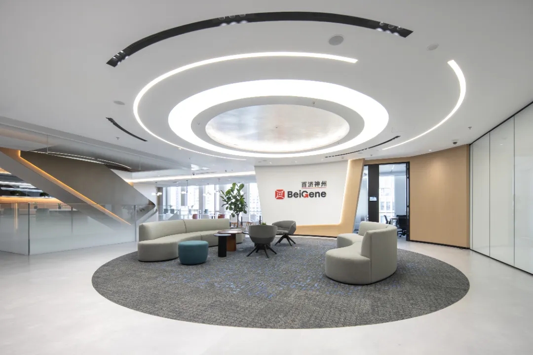 接待区融入绿植与艺术装置,为访客营造舒适通透的视觉印象。半开放式设计兼顾私密与开放,配备灵活移动家具与智能投屏设备,满足商务洽谈、客户沟通等多场景需求。暖色调灯光与绿植墙,营造轻松高效的交流氛围;顶面流线型灯带与企业LOGO线条相呼应,LED线性灯光随空间纵深渐次延展,于光影律动中构建极具未来感的视觉张力。