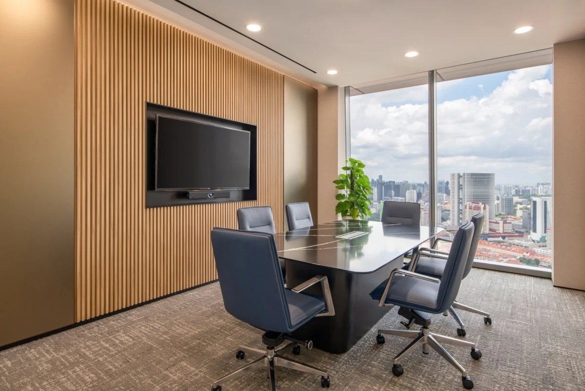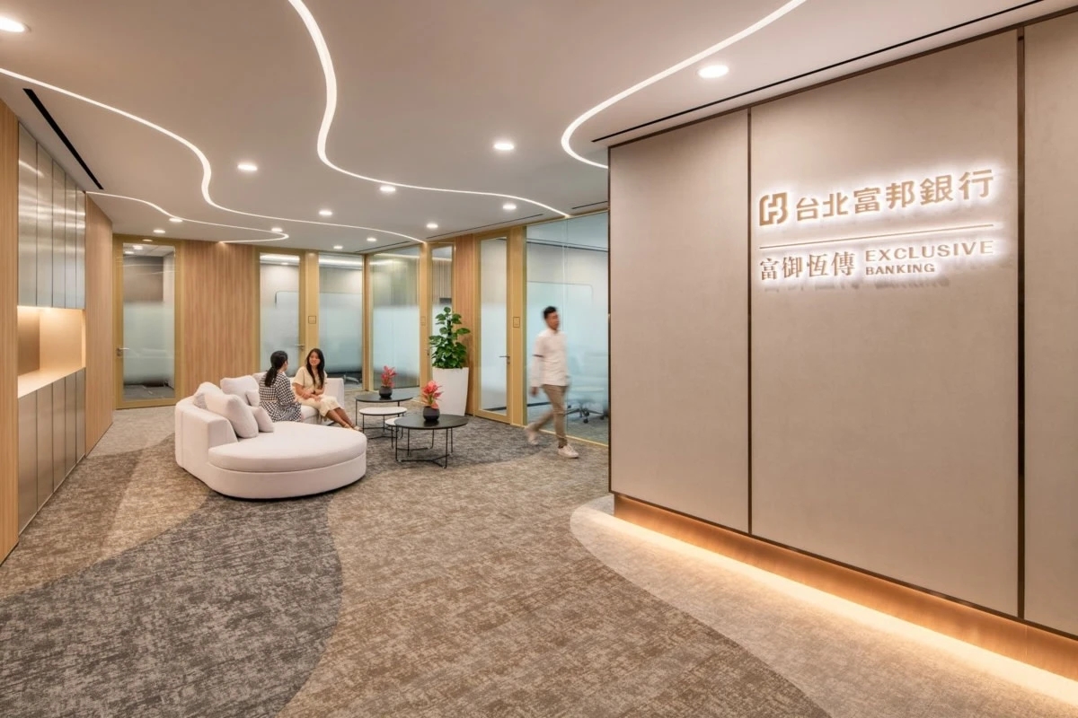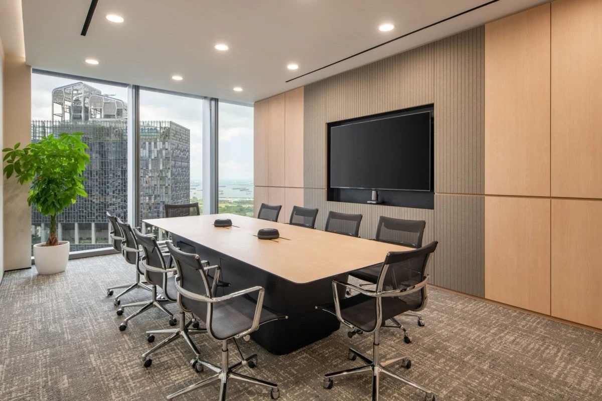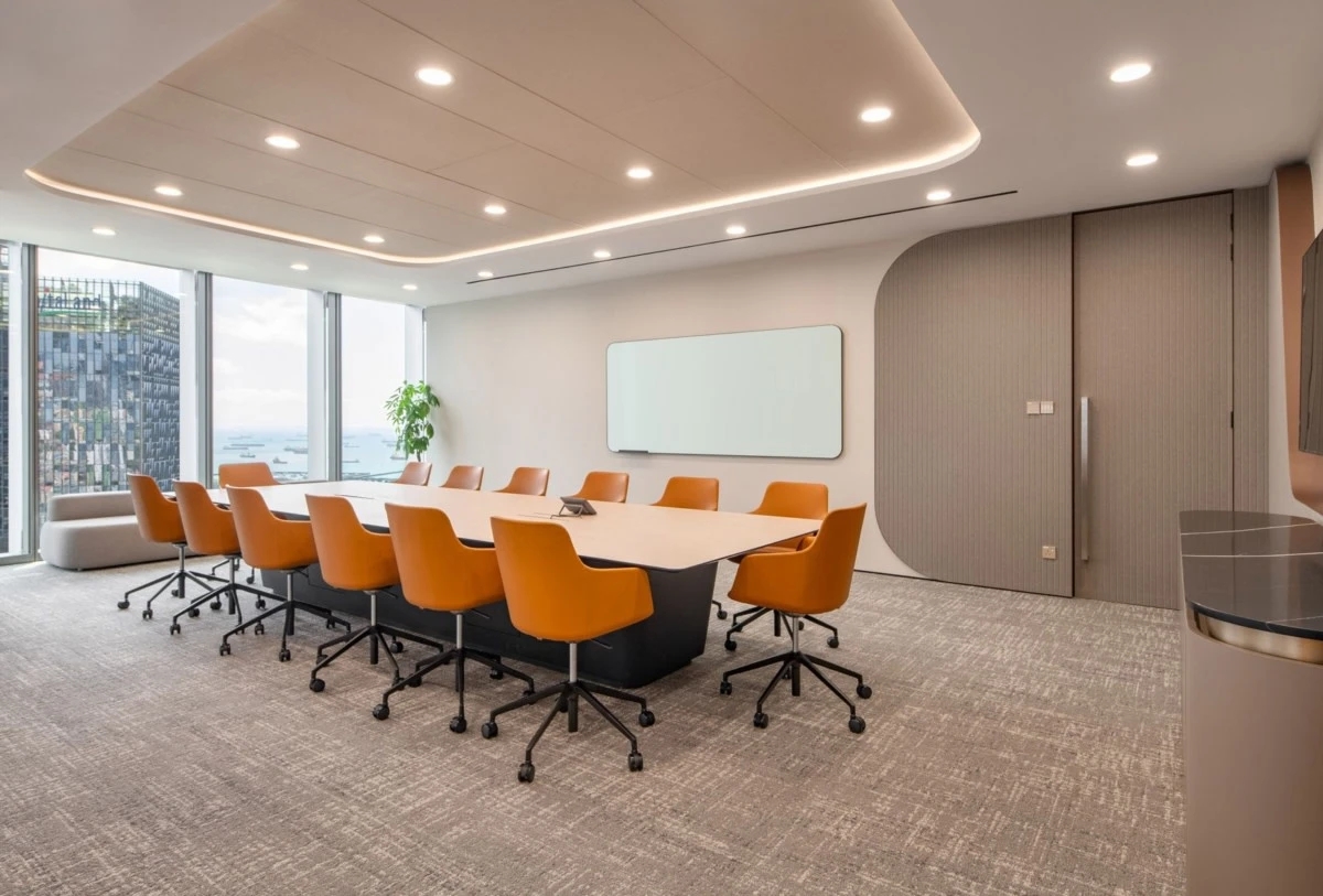 与充满活力的休息区形成对比,董事会的设计则偏向正式与优雅。橙色皮椅围绕中央桌子,营造出既舒适又不失风格的空间。极简主义的设计使得外部城市景观成为空间的视觉焦点,而圆角和柔和的灯光则进一步增强了董事会区域的复杂氛围。台北富邦银行的新加坡办公室特别注重可持续设计原则,通过绿色网格系统和自然元素的引入,反映了银行在环保解决方案方面的承诺。办公室内的苔藓墙、生物墙和室内植物有效提升了空间的自然氛围,为员工提供了一个更加健康、舒适的工作环境。自然元素与现代设计的结合,完美地体现了银行对员工福祉的关怀以及对可持续发展的承诺。