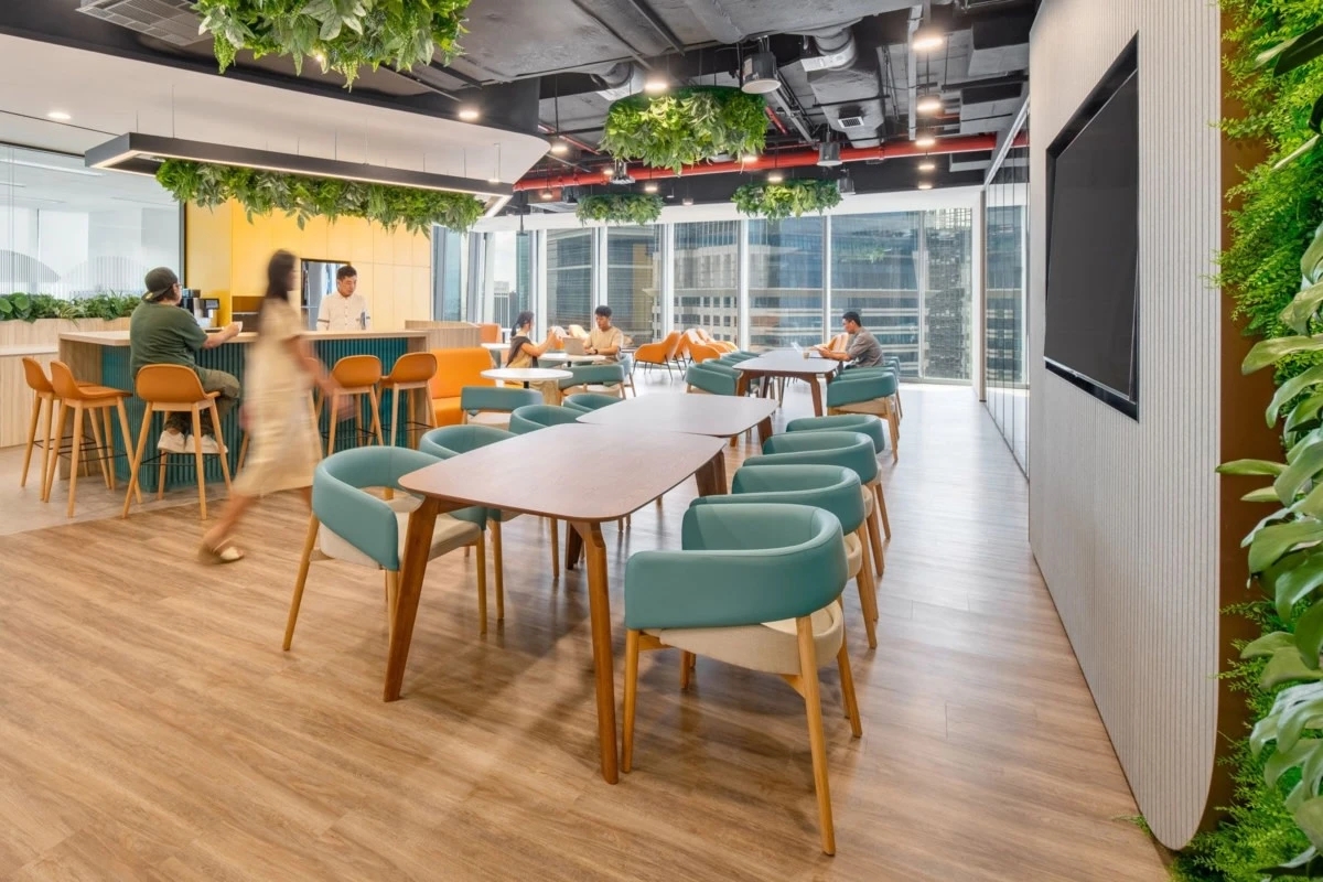 设计师巧妙地利用色彩为空间注入活力,形成了一个既现代又舒适的工作环境。在食品室和休息区,橙色和青色的座椅与浅色木材饰面搭配,营造出温馨且现代的氛围。此外,岛上酒吧上方悬挂的绿色植物不仅为空间增添了清新气息,还为员工的非正式聚会提供了一个轻松的社交场所。