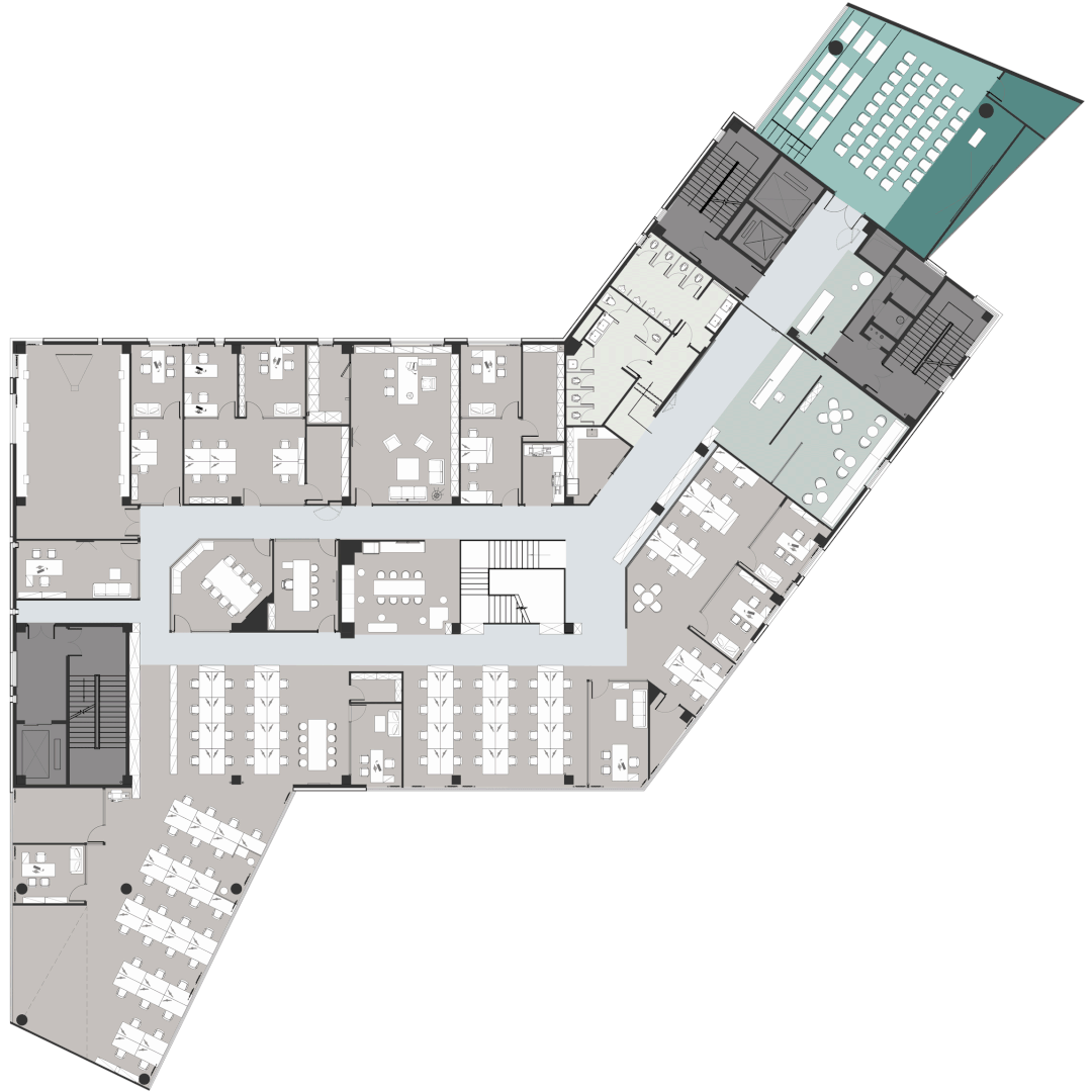 设计团队认为现代办公室不应该是一个处理「待办事项清单」的地方,而是一个协作、创造力和学习的地方,员工感到有勇气和归属感,建筑、楼层、区域、色彩或空间的名称都应反映这一指向。如我们用「学习中心」或「静思室」等名词传达了此类新的空间价值视角。