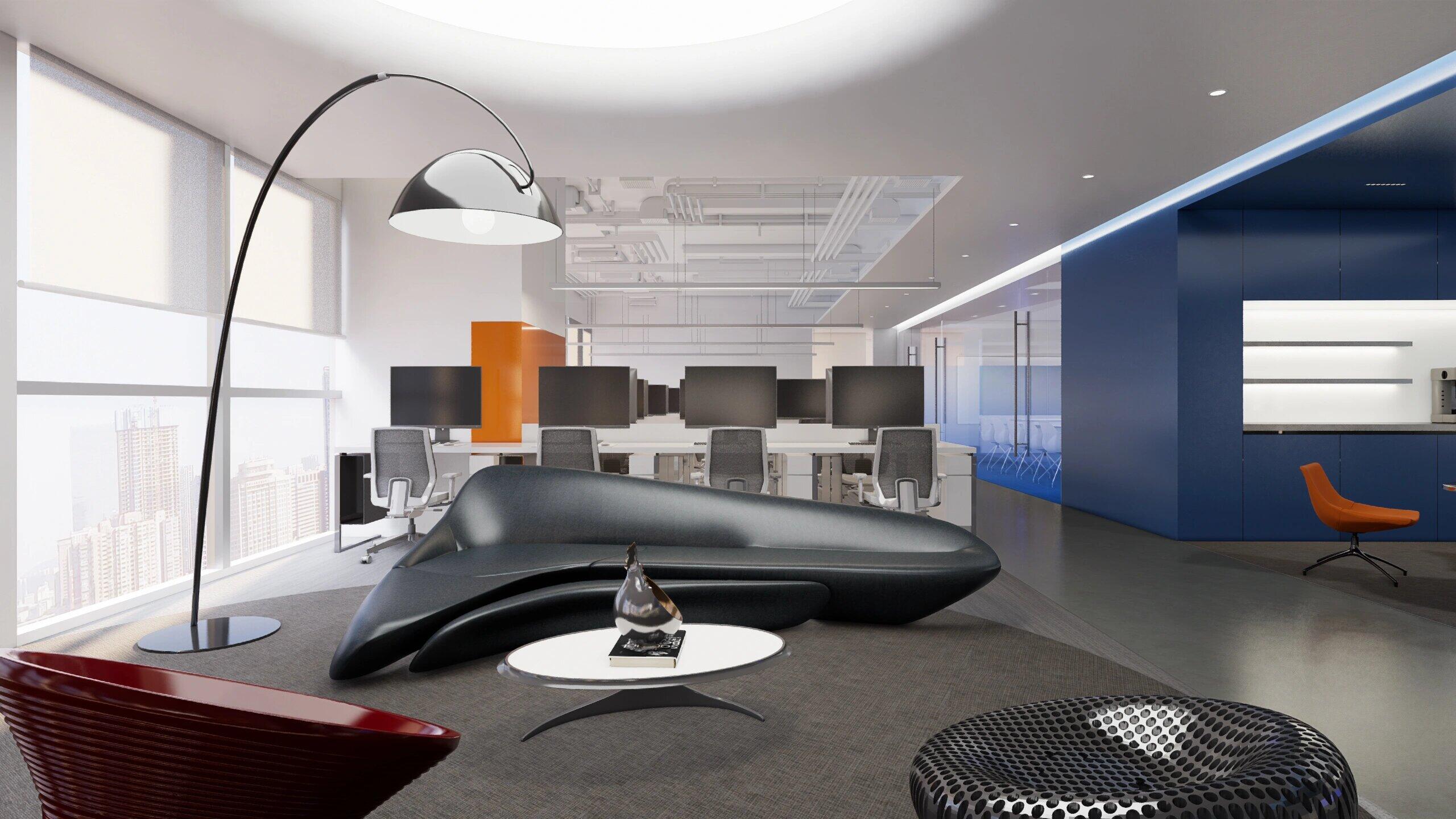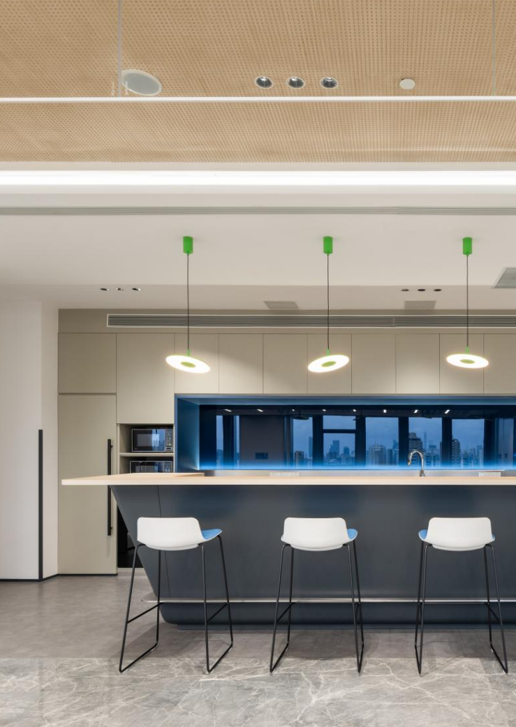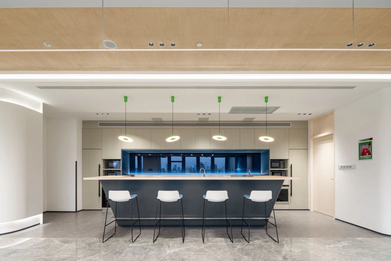 这里作为重要的中心枢纽,形成接待区、协作区和员工区三个空间的视线延伸。于此同时,蓝色玻璃打造的隐约隔断,既放大了空间感官体验,又营造了静谧灵动的空间氛围。