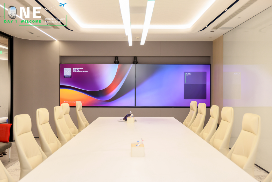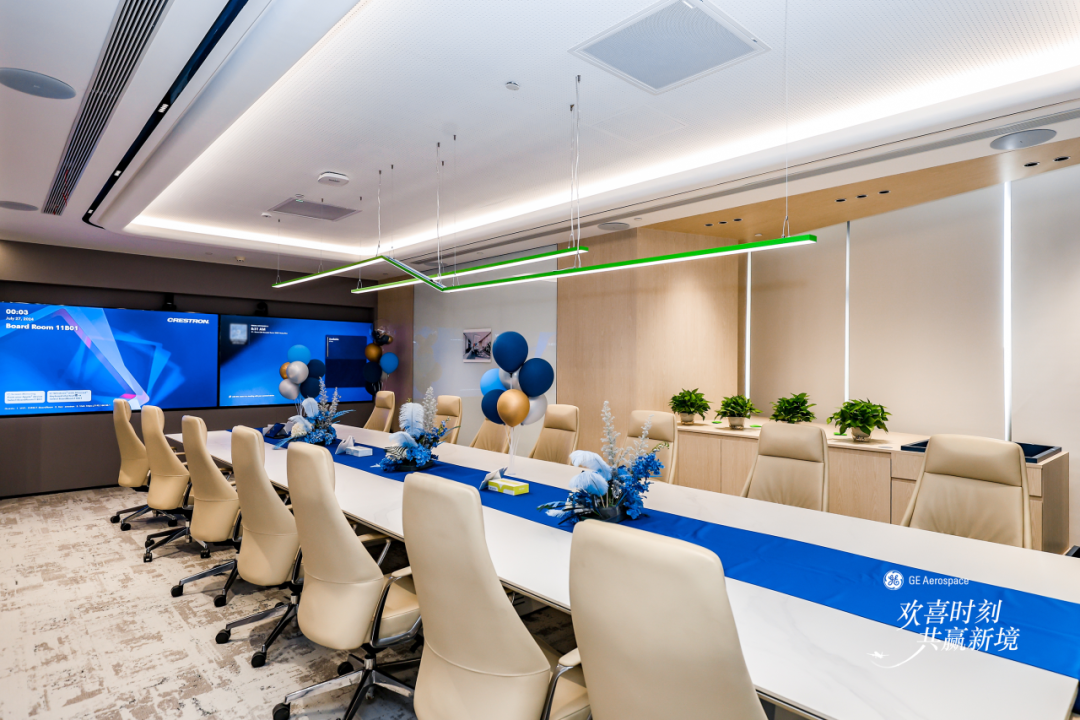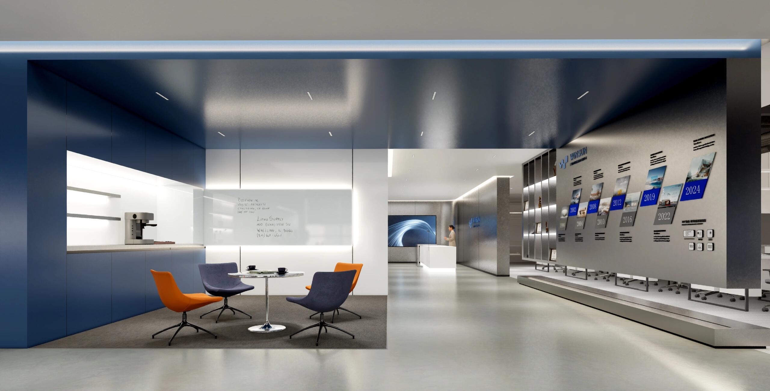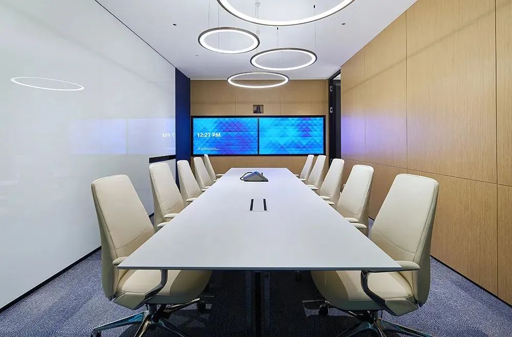会议空间设计手法极为简约,以简胜繁,抛弃了繁杂与琐碎的设计元素,用干净利落的线条和设计语言,让整个空间呈现一种舒适又充满质感的状态。细节处,选择的“轻盈、简约”软装—素雅质感的白色桌面、简约轻奢的金属桌腿、触摸细腻的皮质座椅,打造多维感官舒适体验。蓝色代表的是天空,是深度和无限,昭示着自由和生命。犹如浩瀚星辰的神秘蓝色,瞬间点燃了空间的个性表达,「白云升远岫,摇曳入晴空」,何尝不在应和着蓝天白云的深邃与轻盈。