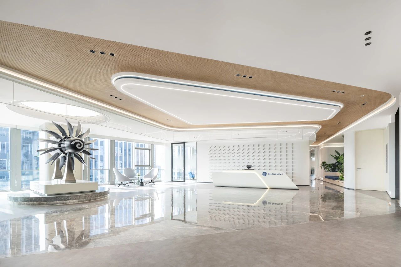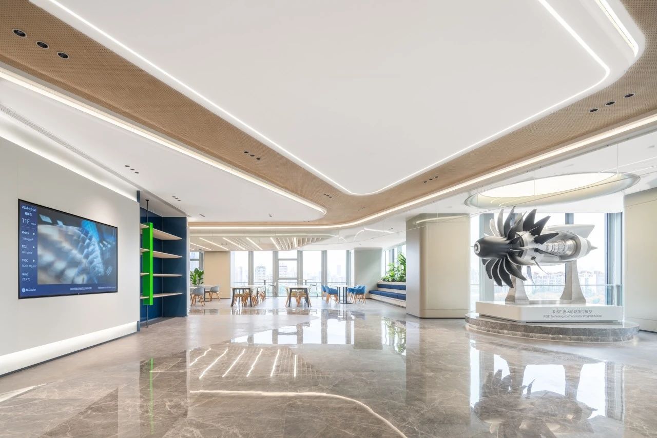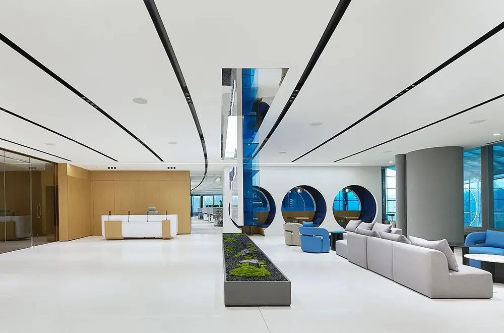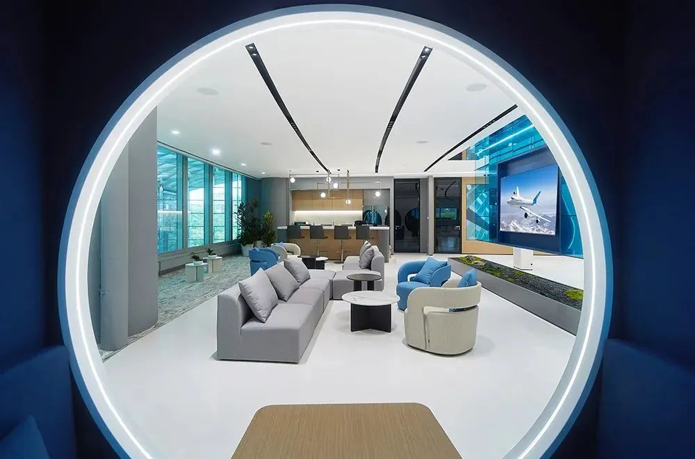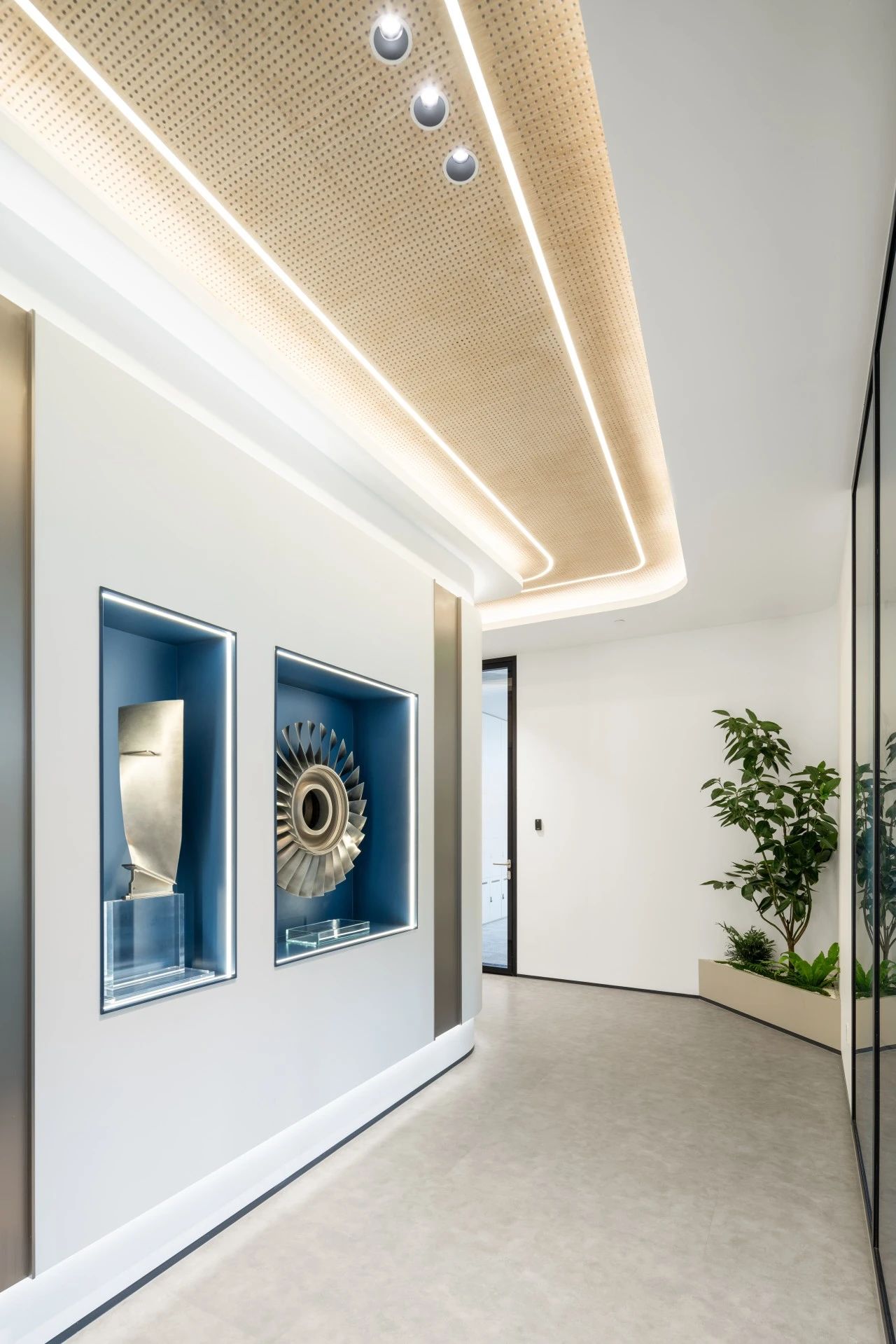 天花设计则以航空跑道的线条元素渗透其中,一直延伸至内部的工作区域,增加空间的流动性和连接性,同时也将企业文化融入其中。宛若飞机带着呼啸声从跑道起飞,直射蓝天。