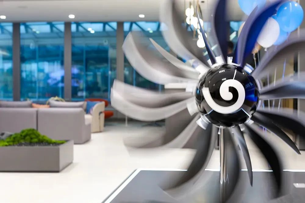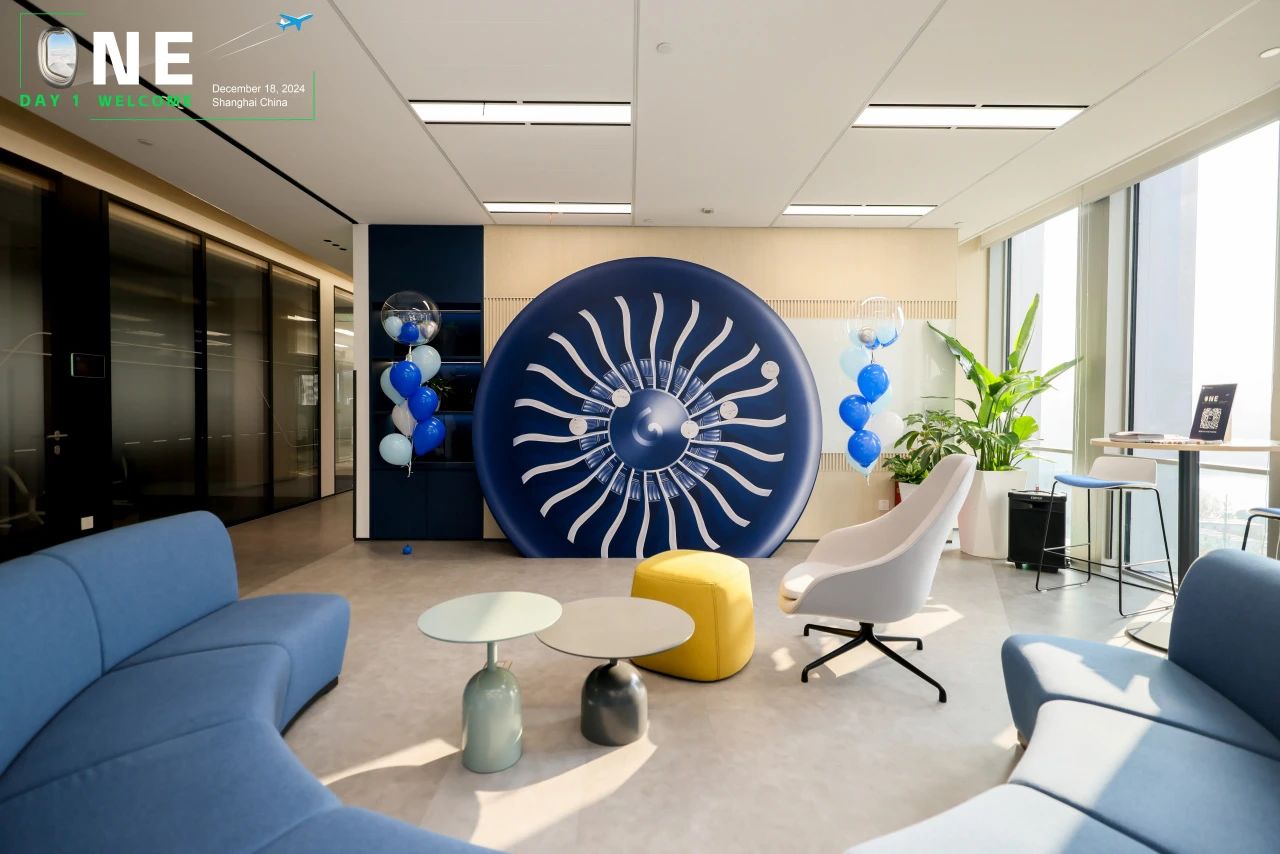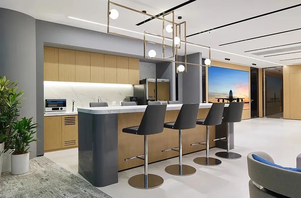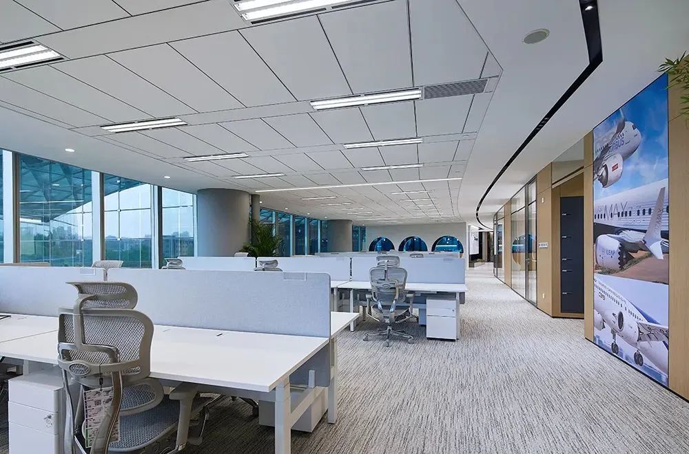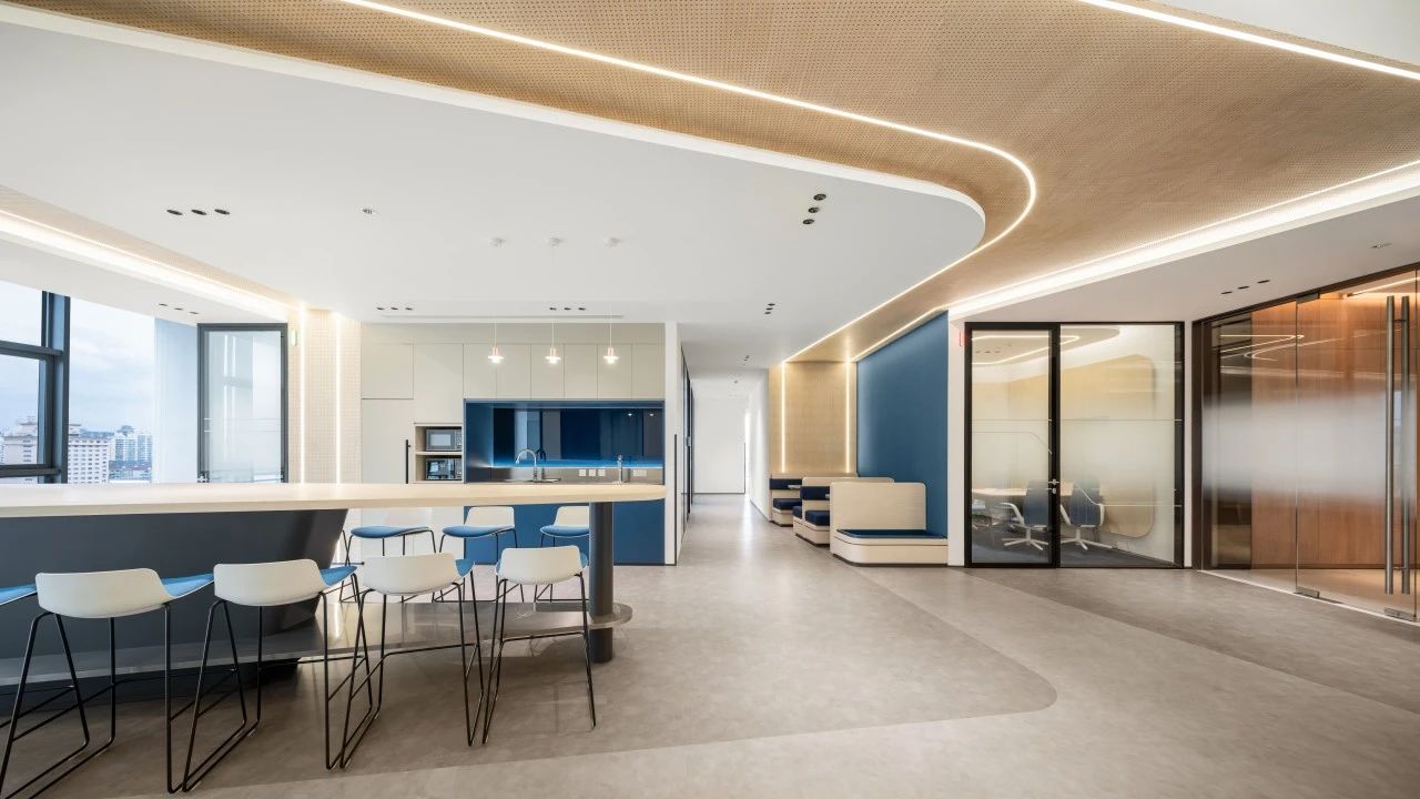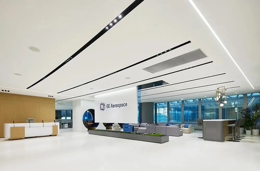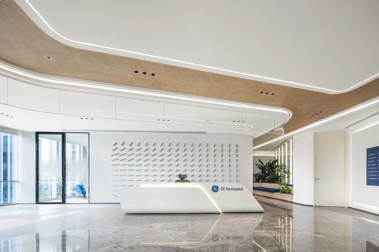 天花设计则以航空跑道的线条元素渗透其中,一直延伸至内部的工作区域,增加空间的流动性和连接性,同时也将企业文化融入其中。宛若飞机带着呼啸声从跑道起飞,直射蓝天。