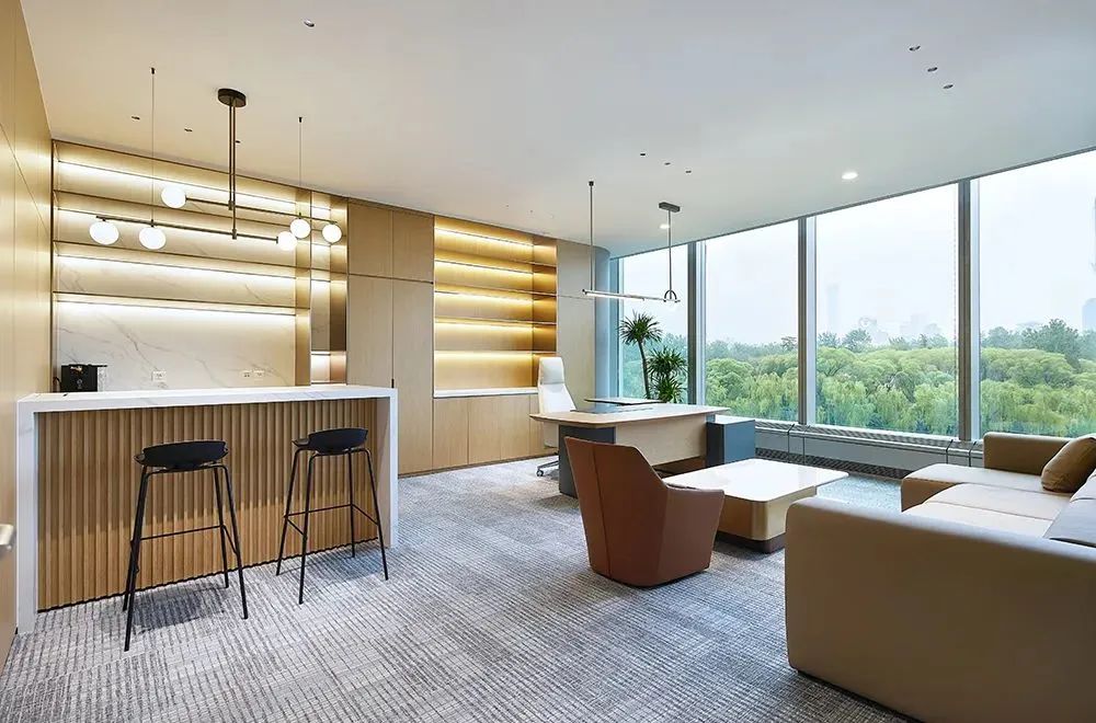 CEO办公室采用沉稳低调的设计风格,轻简布局减轻视觉负担,米色为底叠加木质元素,透过材质本身质感传递空间调性,让空间简练之中不乏品质。