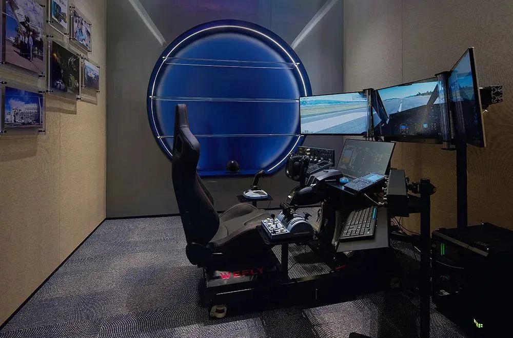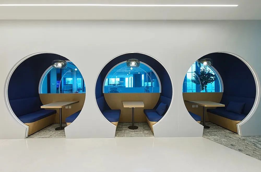圆弧形发动机机舱造型卡座,置于开放区与员工区之间,光影透过机舱玻璃,仿若云端之上。
