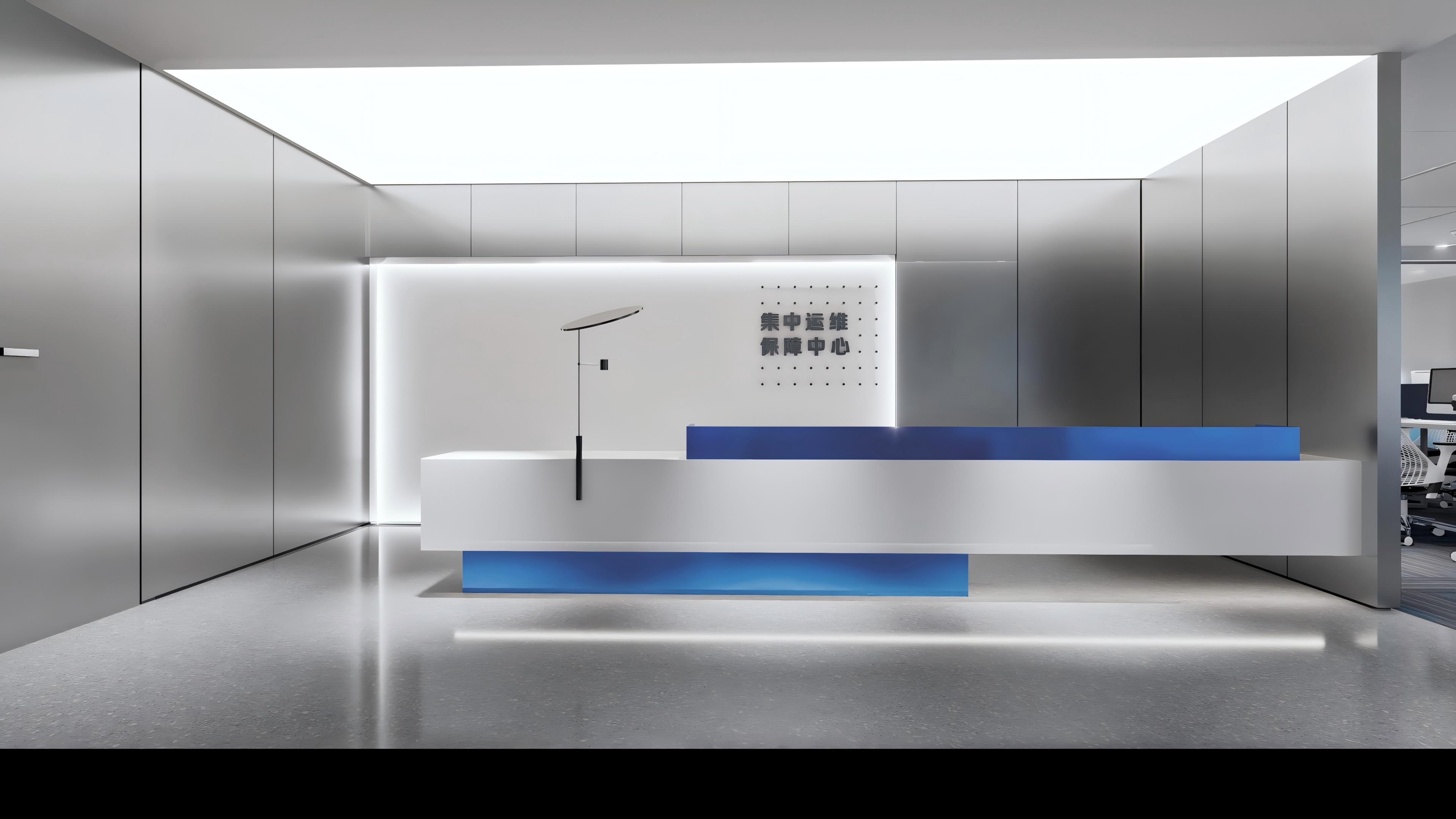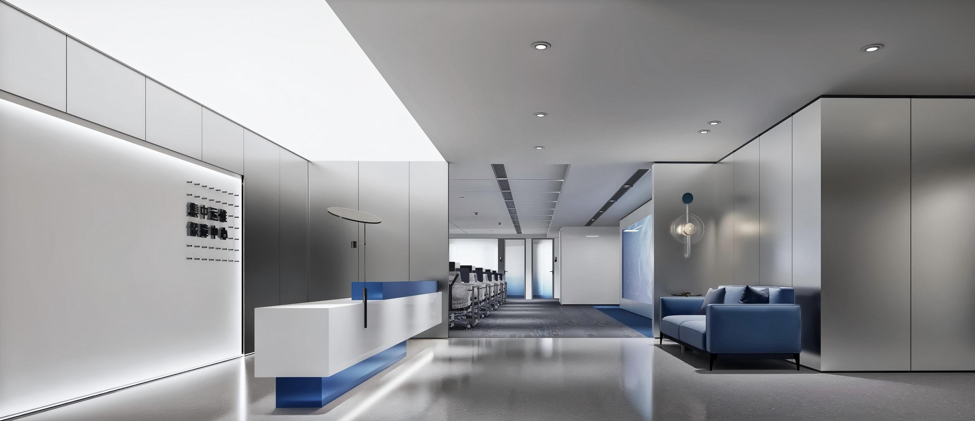 空间抽取网络光纤元素,配合建筑多层分割的手法,使用代表网络的蓝色调性以及代表科技的金属铝板为空间主要构成点,规整而富有层次感的空间规划,营造一个科技,年强又具有时尚感的空间环境。融入企业理念和价值观,体现企业的高新属性。
