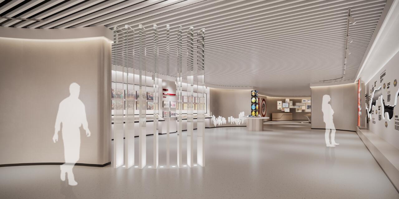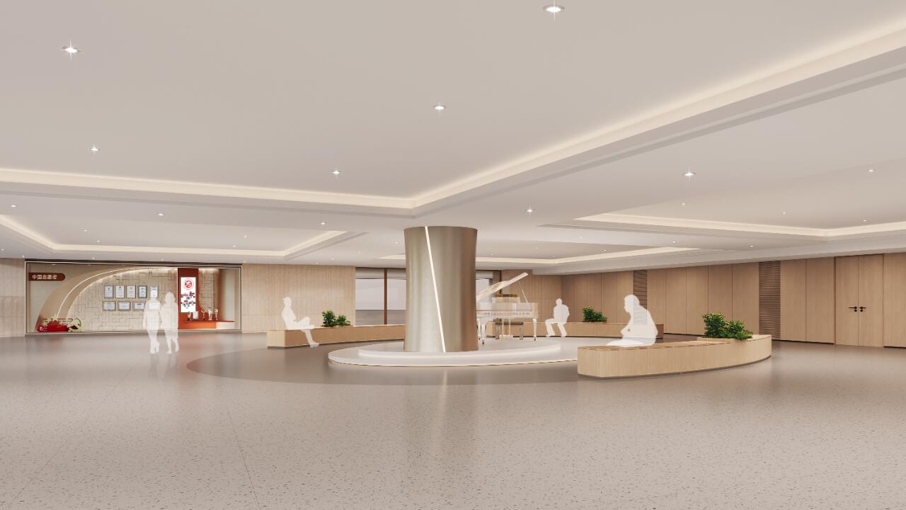 室内空间主要分为志愿服务主题展厅及培育孵化区两大板块,主题展厅的空间以中国志愿的标志“爱心放飞梦想”的标志性的“心”彩带的形态作元素引入空间,以彩带的形态变换成空间线条,打破常规方正布局,让空间感觉更活跃灵动。