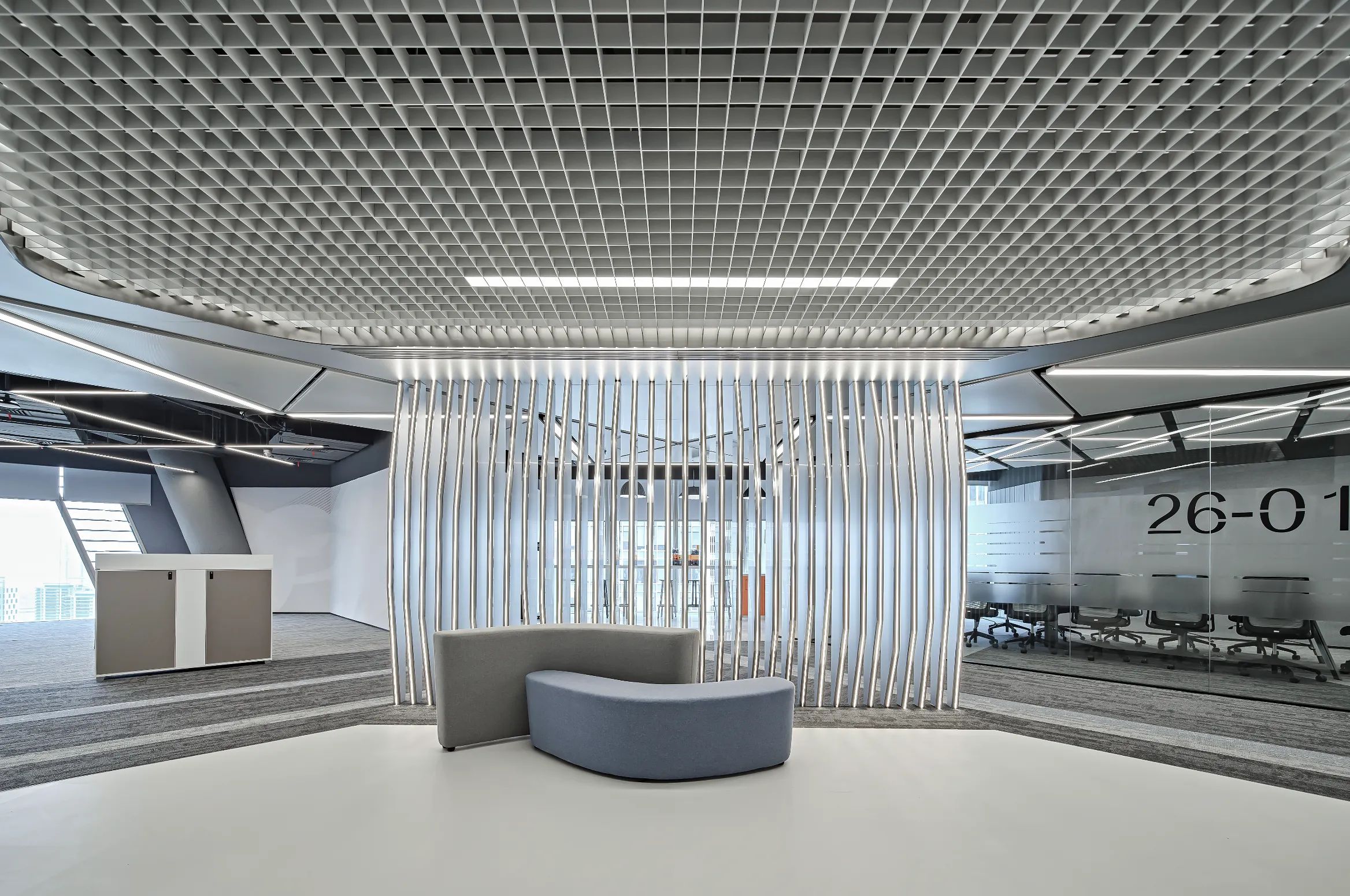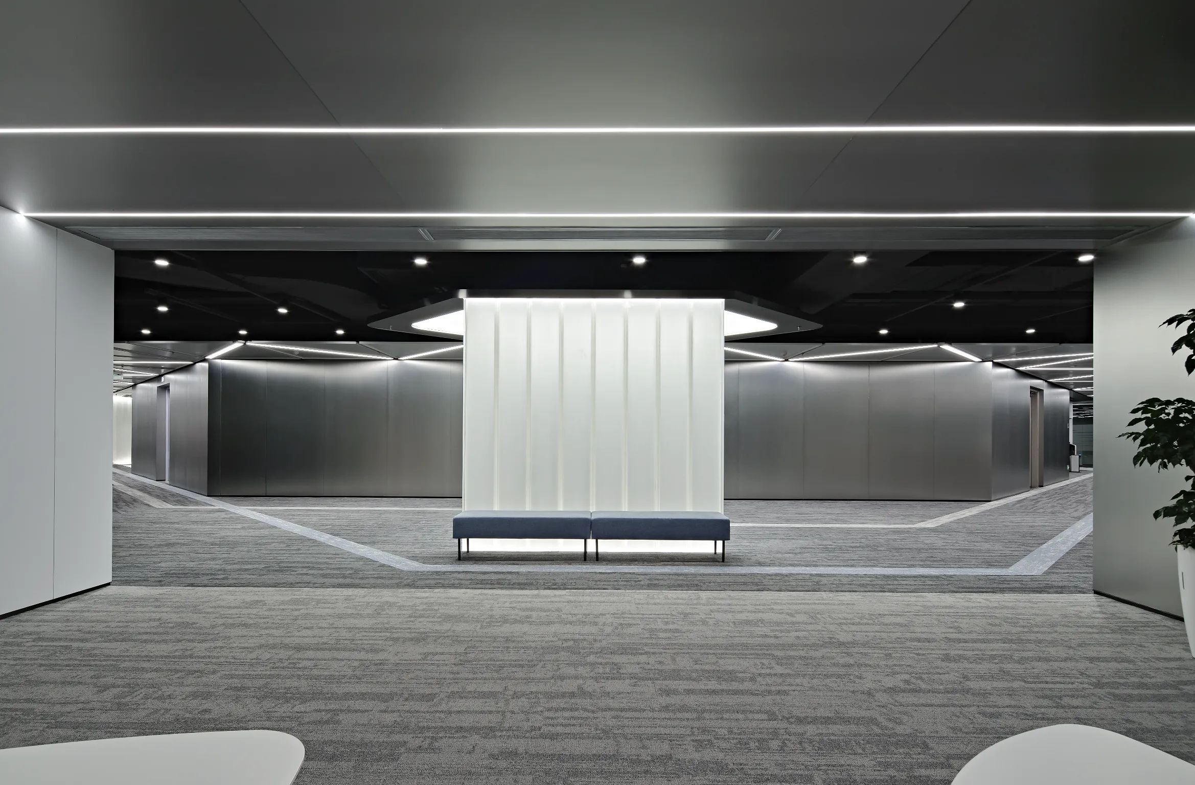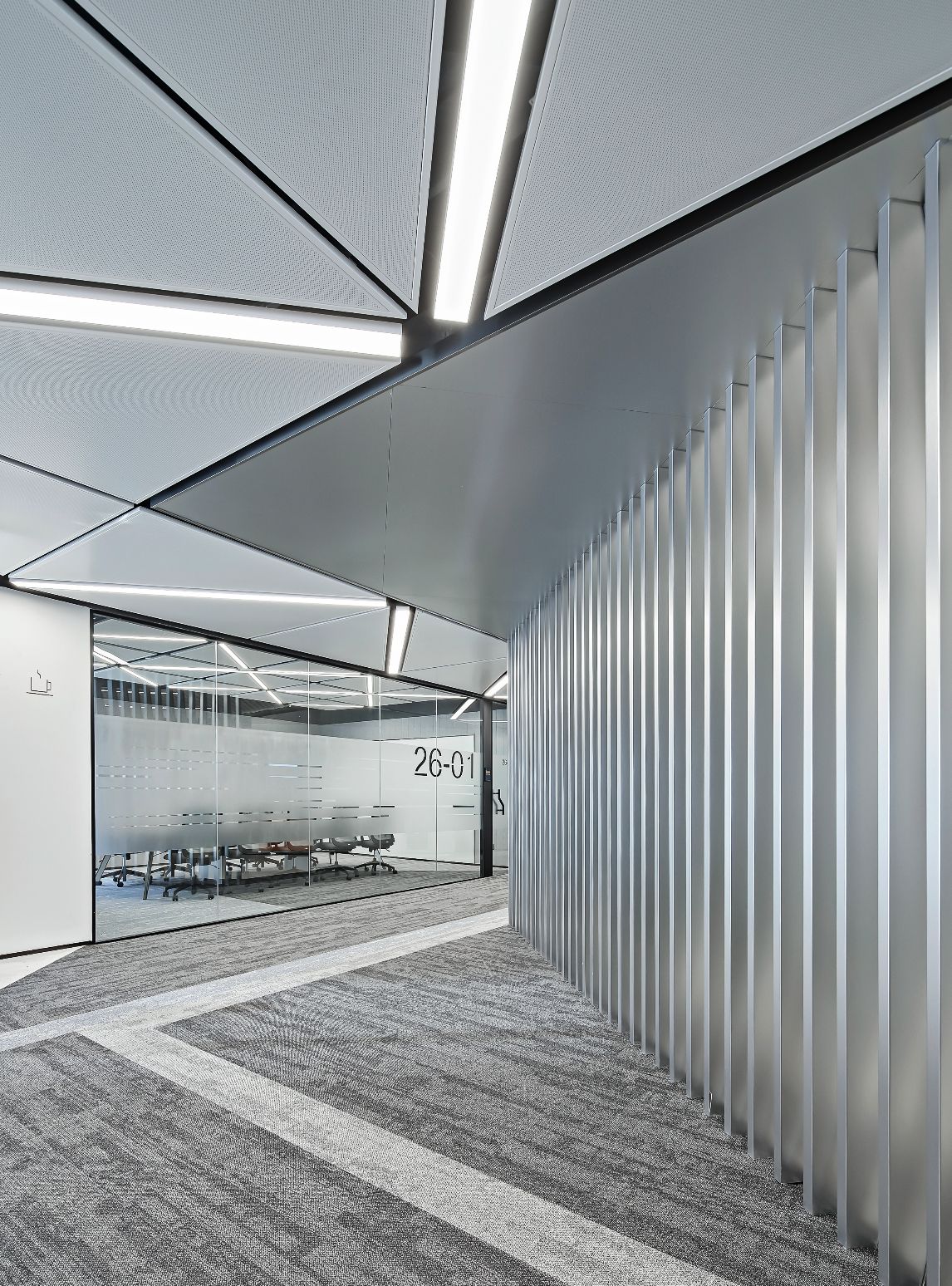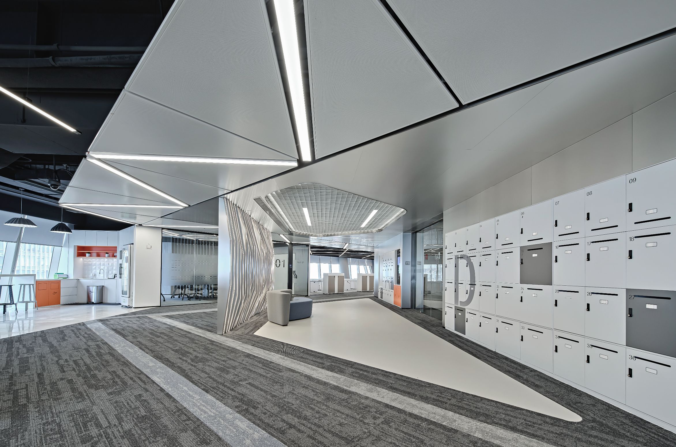 四区作为另一个主要办公区和综合功能区,活动场景丰富,人员流动大,设计采用“水”的流畅舒缓的流线型元素,为员工提供一个活泼舒适、疏解紧张情绪的办公环境。