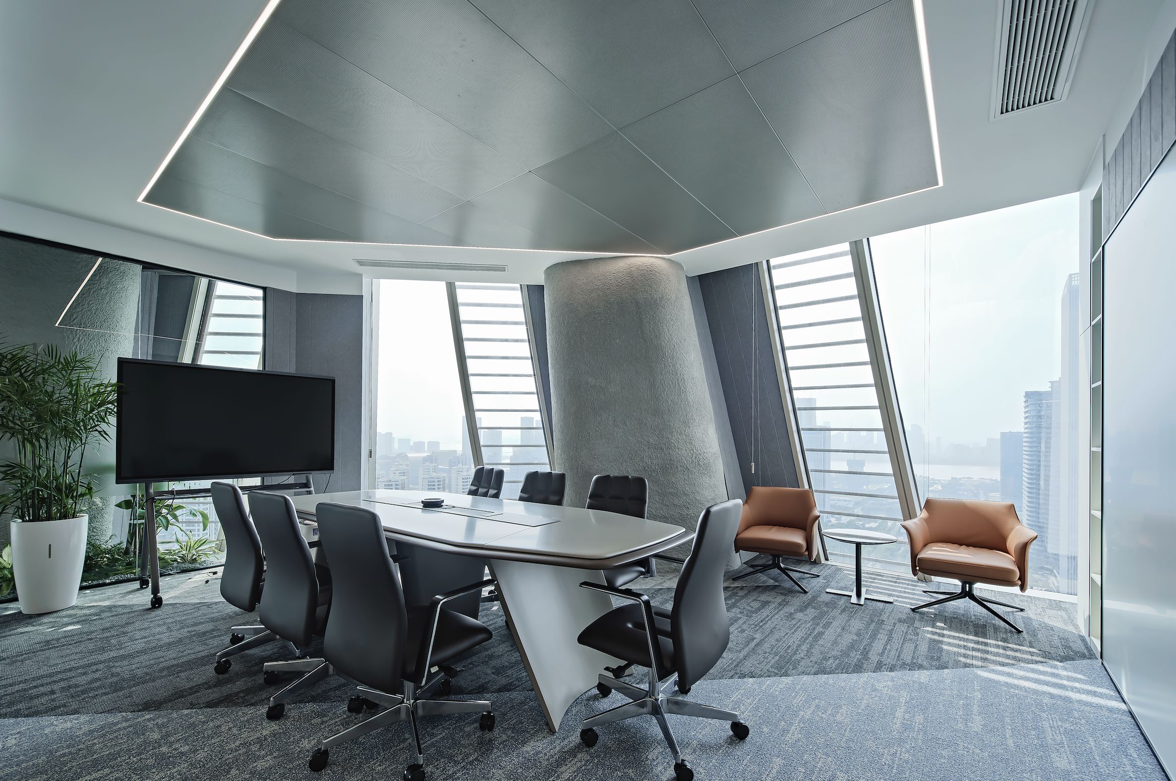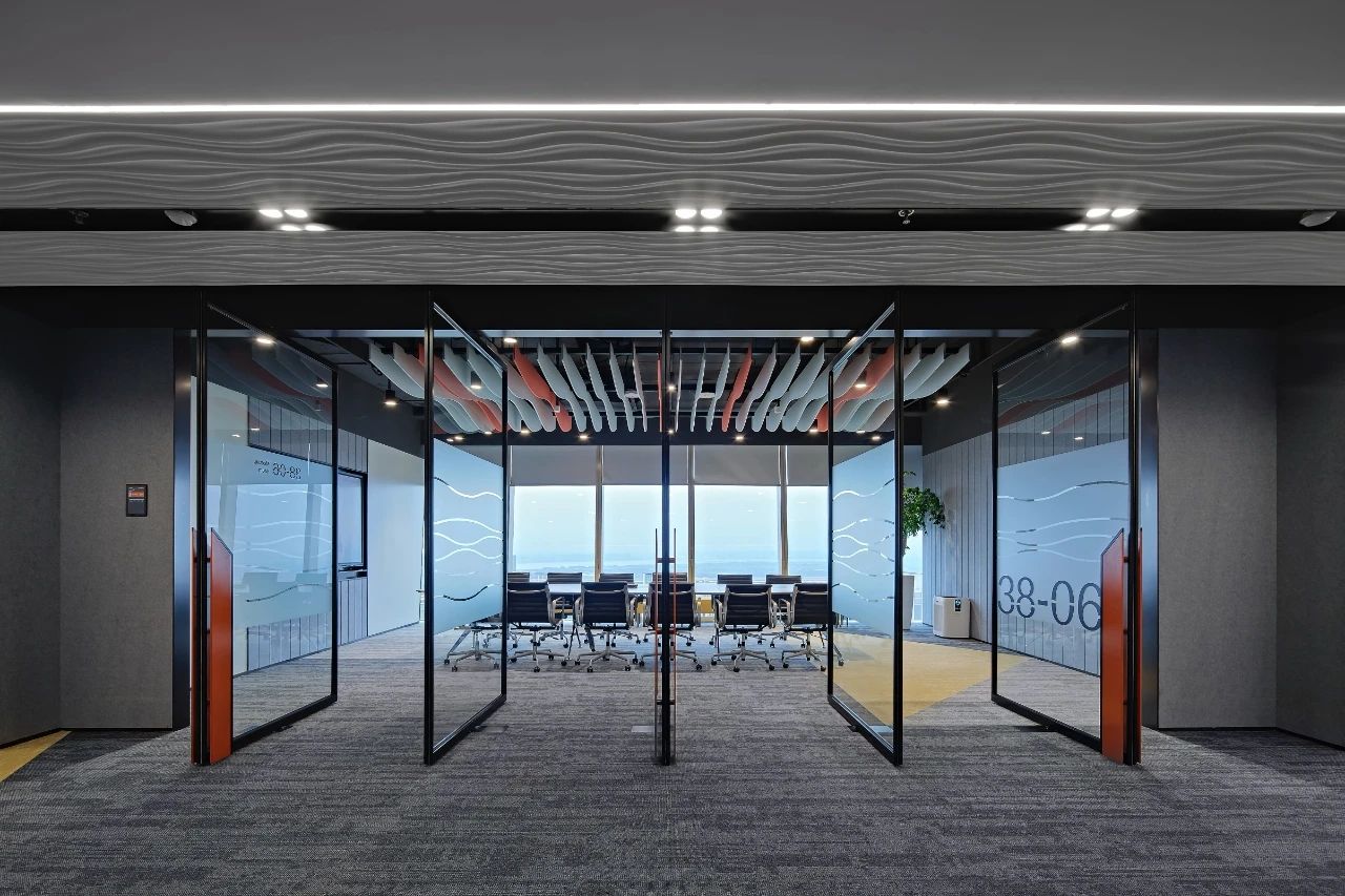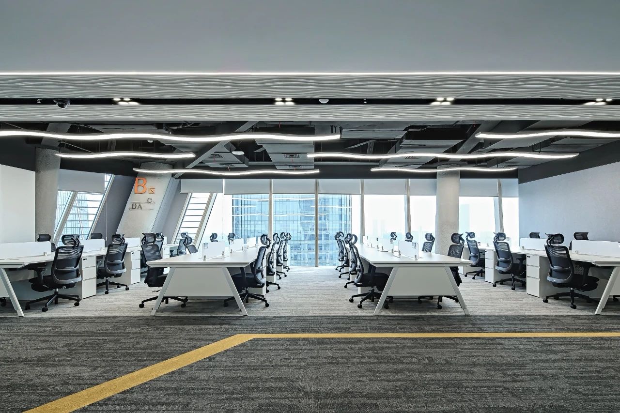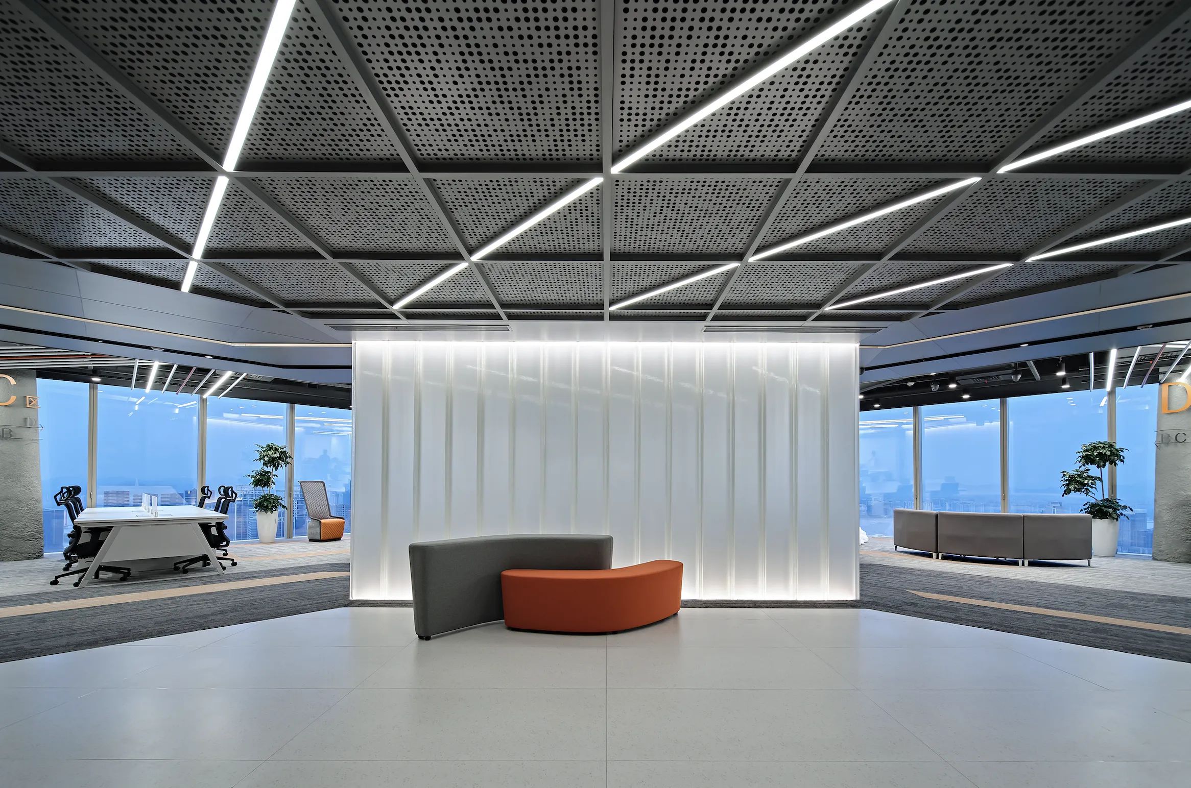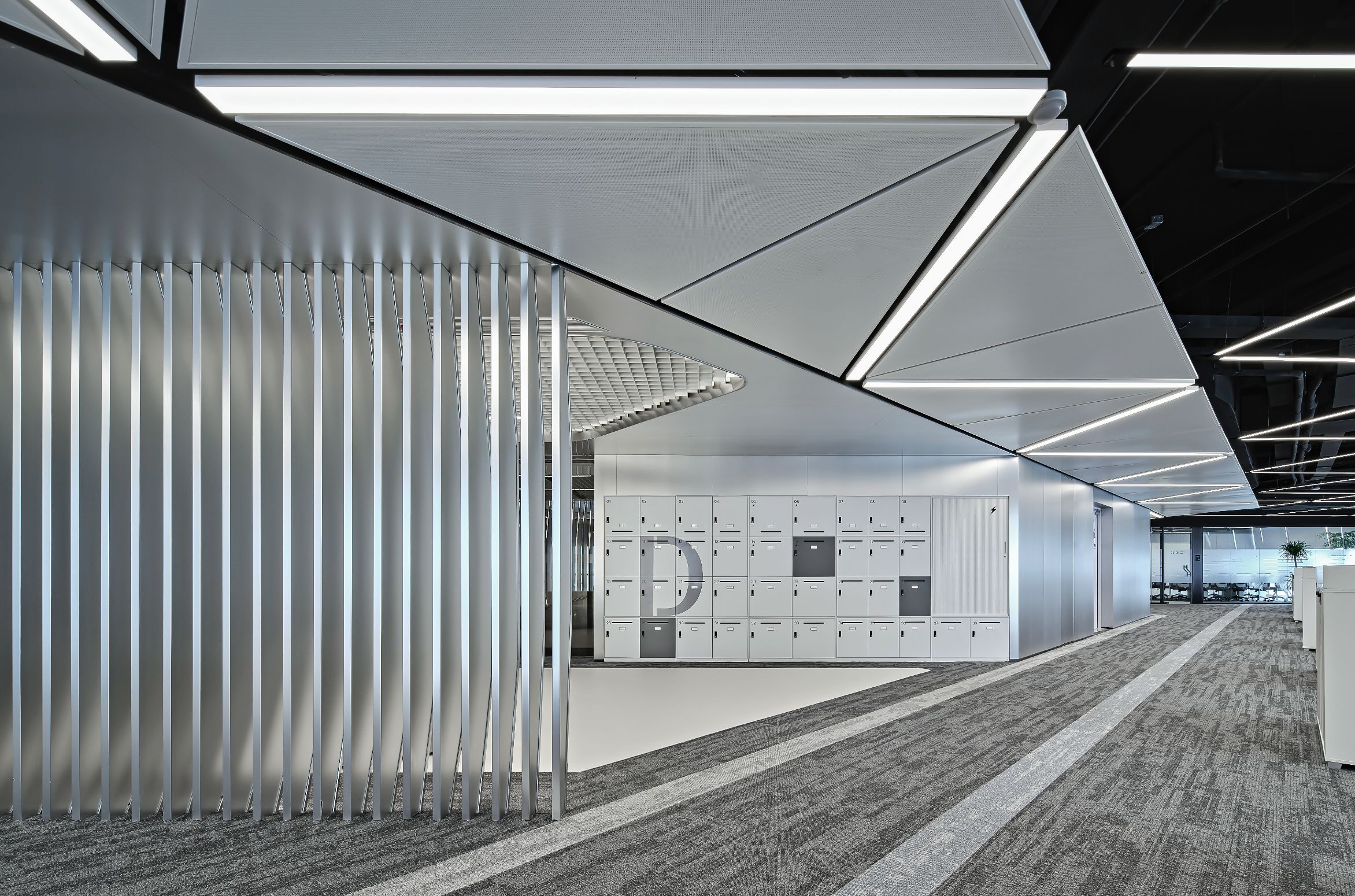 四区作为另一个主要办公区和综合功能区,活动场景丰富,人员流动大,设计采用“水”的流畅舒缓的流线型元素,为员工提供一个活泼舒适、疏解紧张情绪的办公环境。