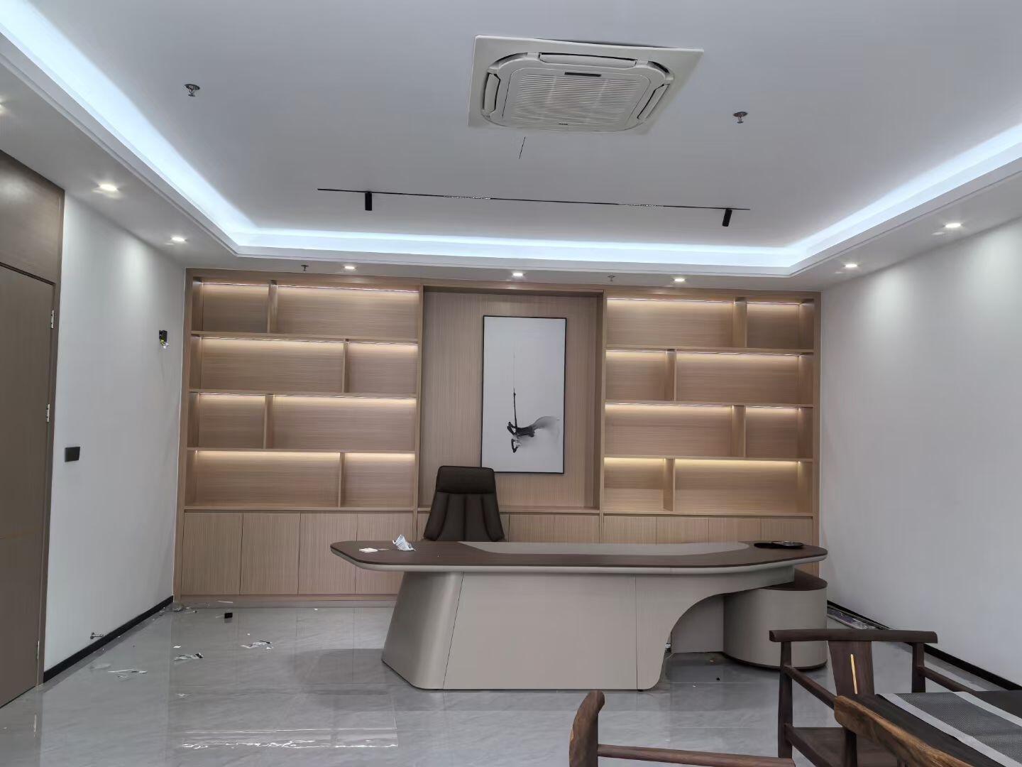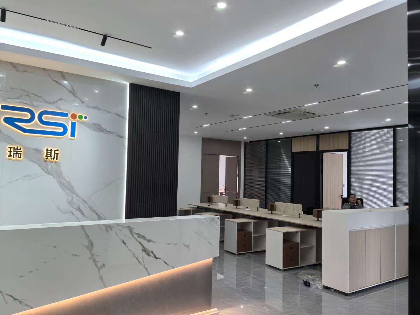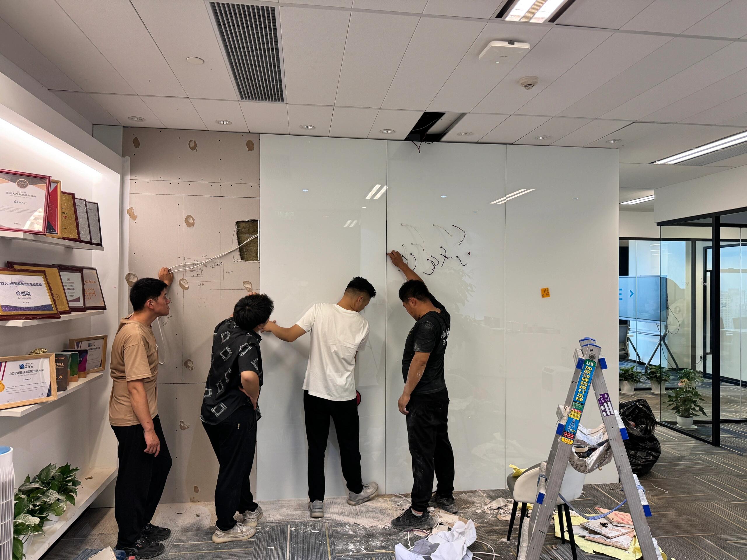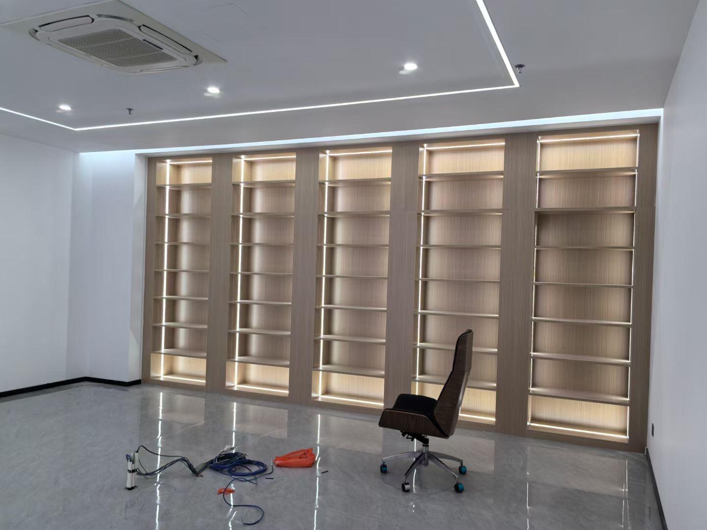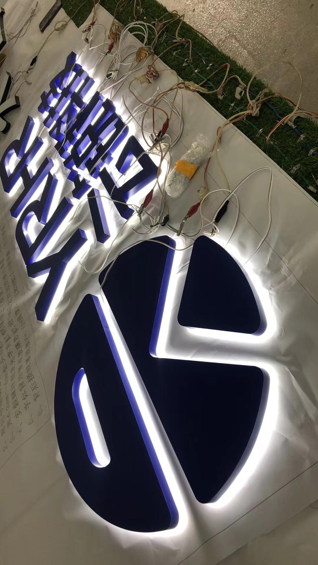 基础采用轻钢龙骨框架,搭配木工板,表面钢化烤漆玻璃贴面打孔穿线 logo 内嵌Led灯带,不锈钢烤漆内嵌亚克力背光字