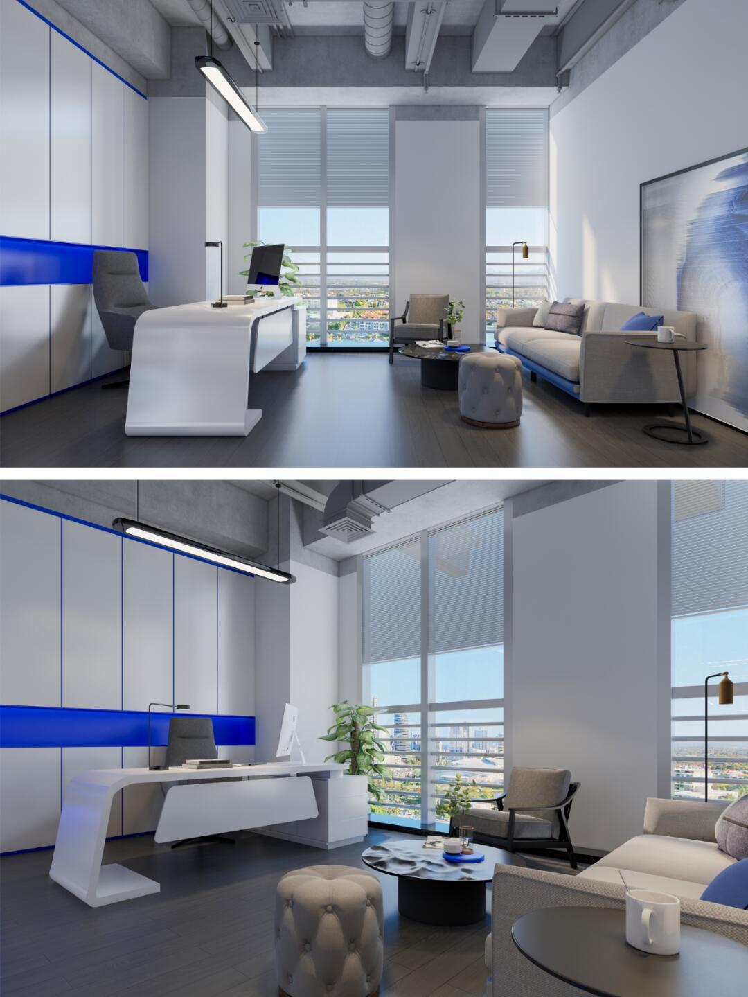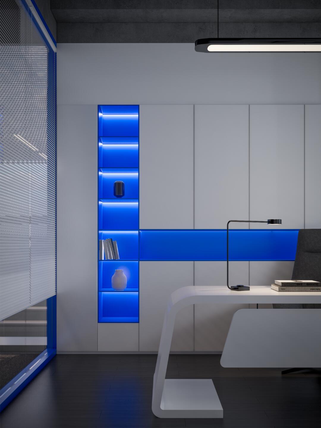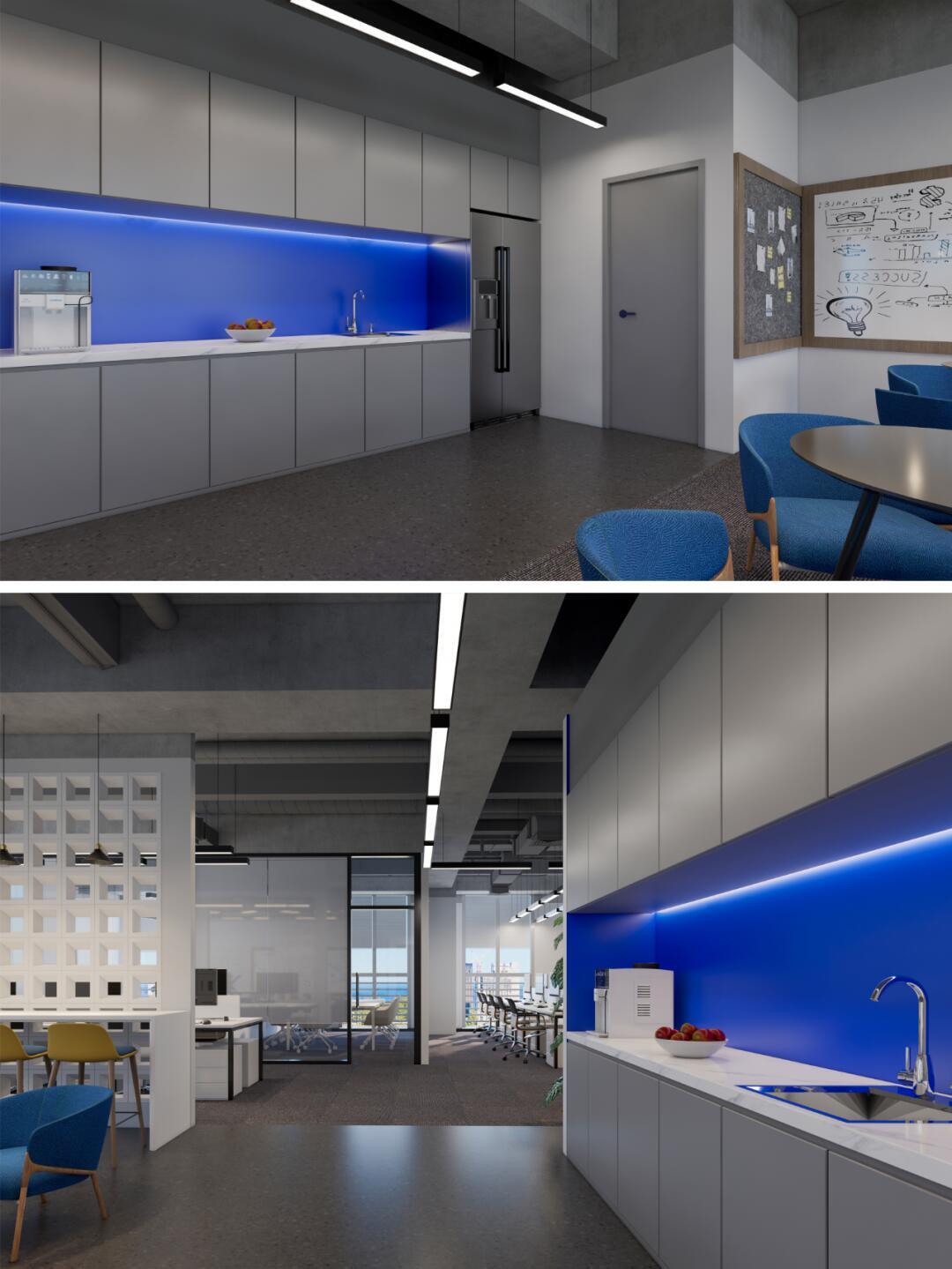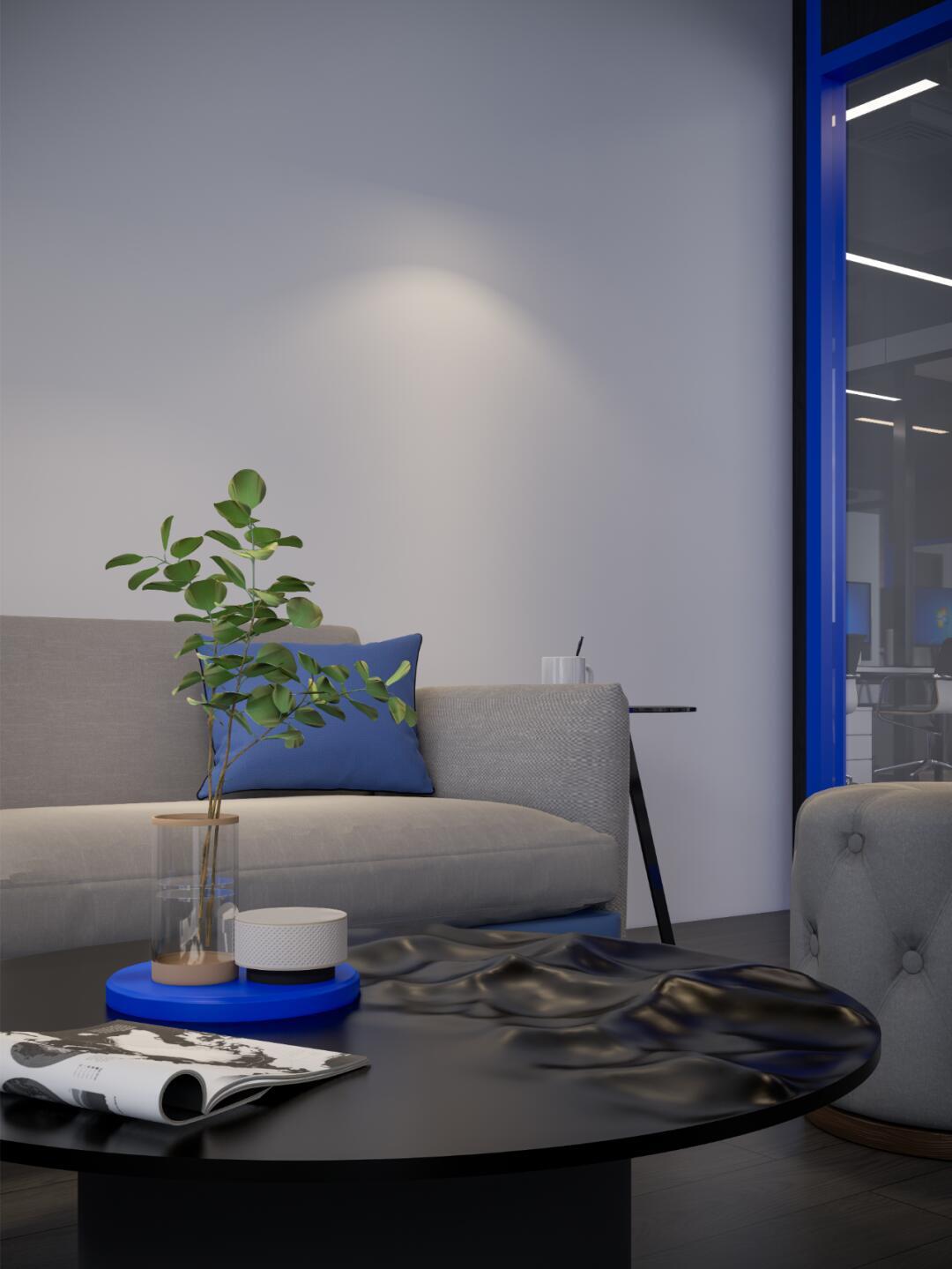 整个空间以明亮的蓝色为主色调,这种色彩既代表了沉稳与信任,又充满了活力与创新。我们通过在蓝色基调中加入温暖的木质色和灰色调,来平衡整个空间的色彩,使之更富有层次感。