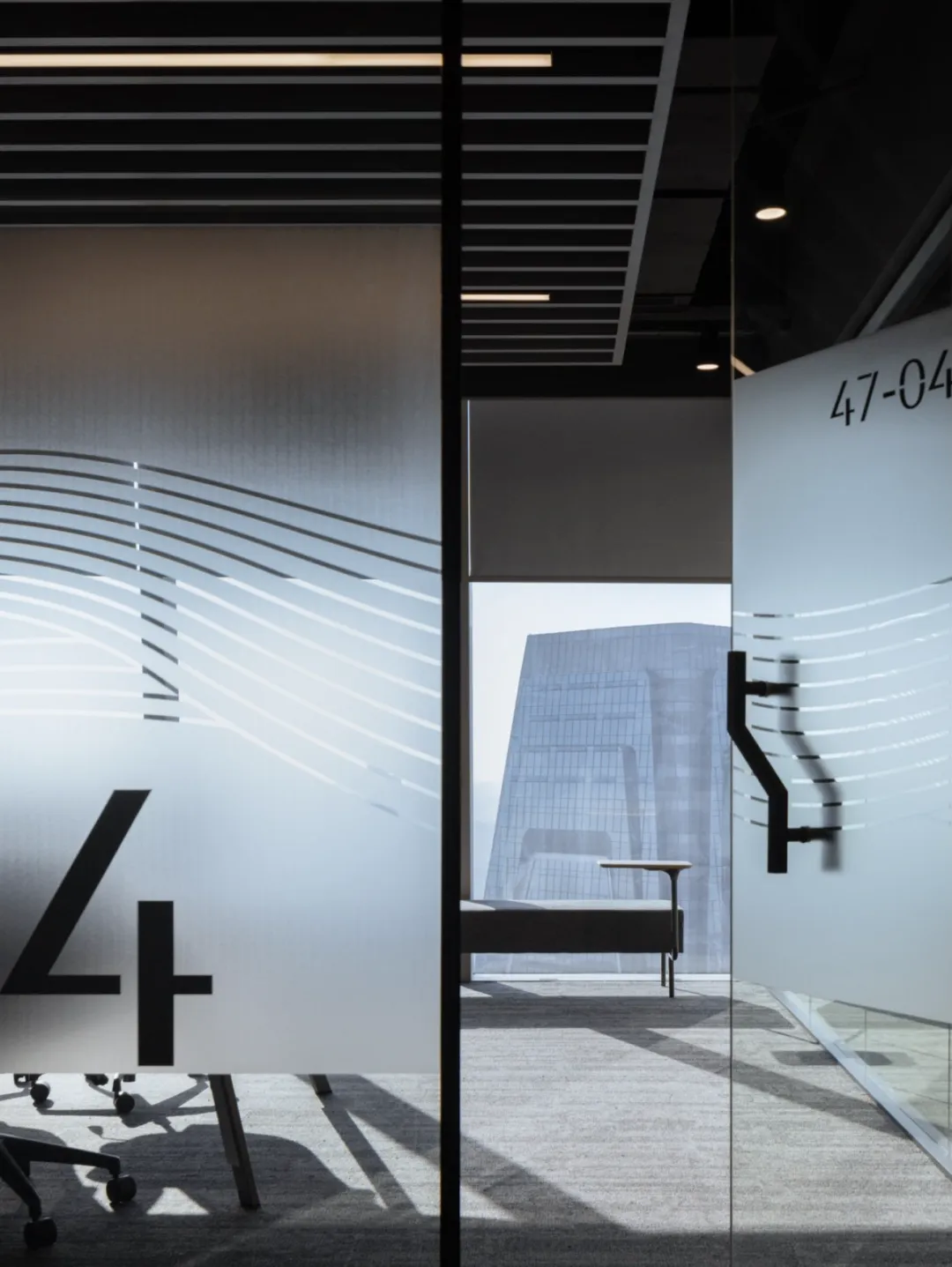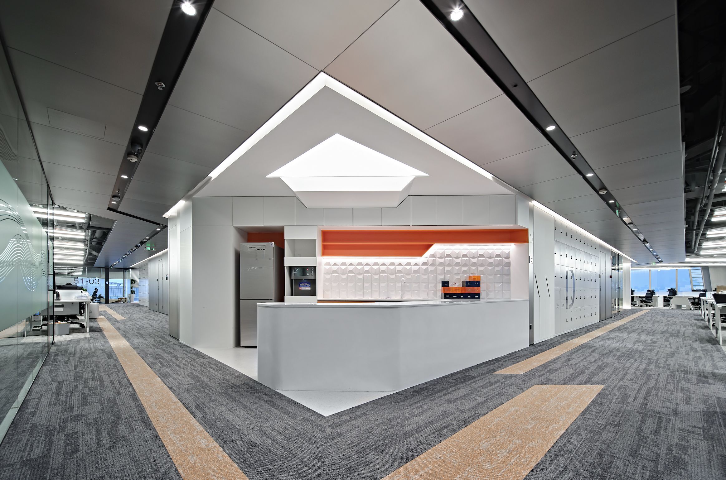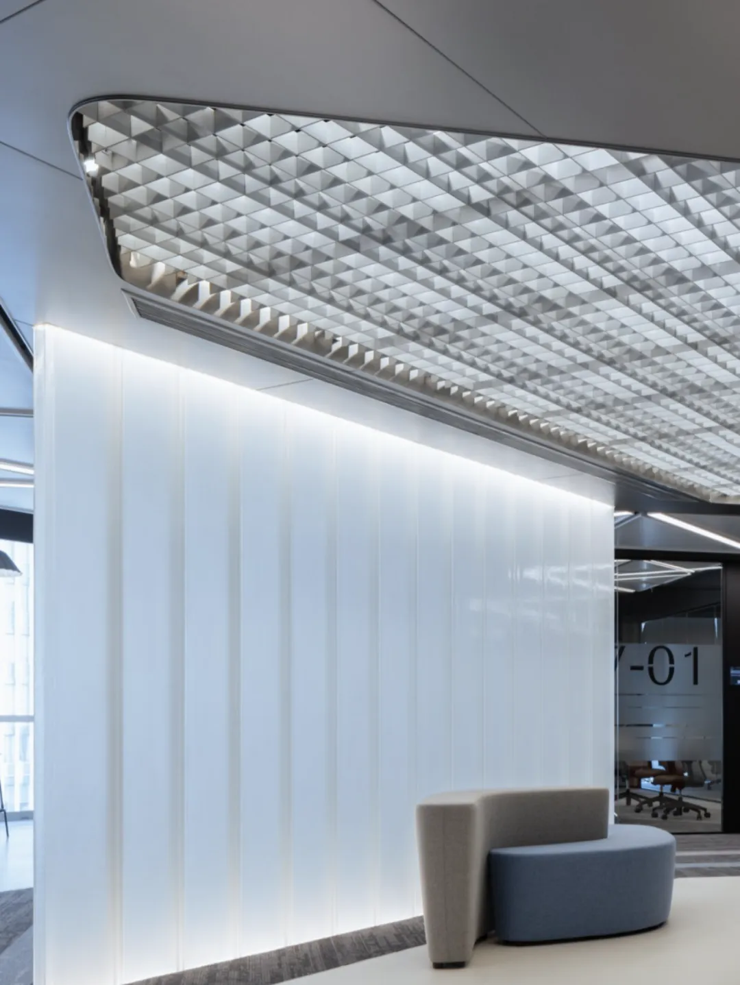 行政中心不仅是一个功能强大且开敞对外的办公空间,还通过室内设计呈现极氪品牌主旨,金属感材料、反光材料、线条光和彩色点缀的应用,让办公室成为具有未来感和个性的总部办公场所,给来访者留下深刻的第一印象,我们将行政中心打造为一个信息中转和存储的空间站。