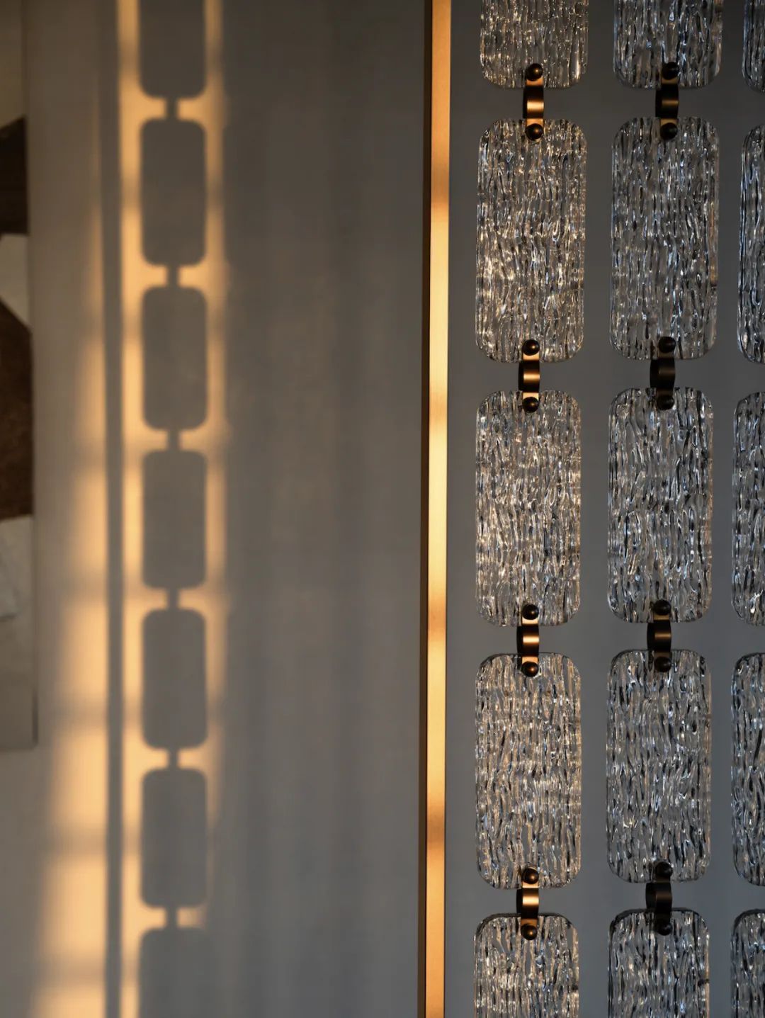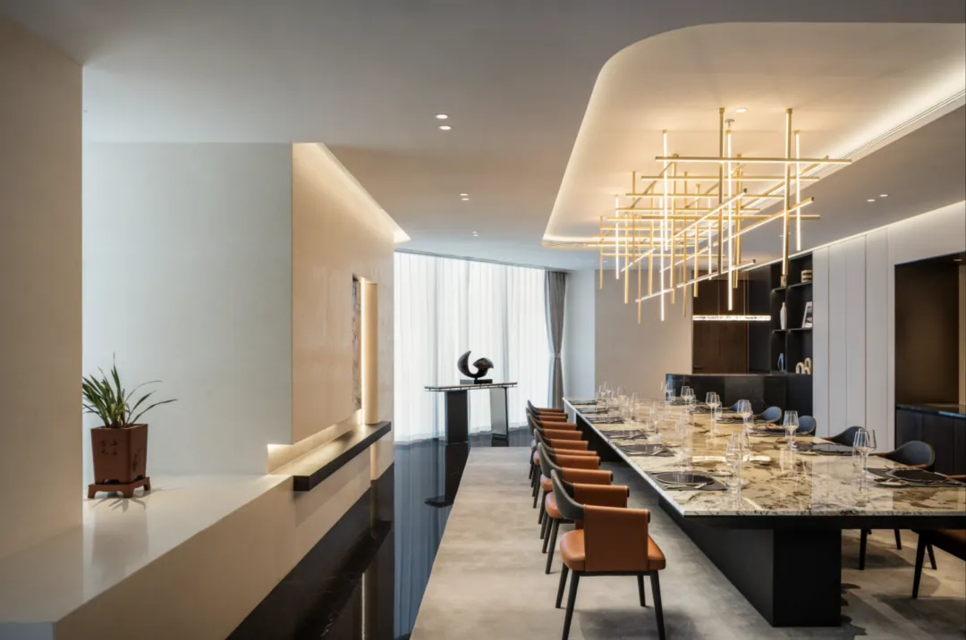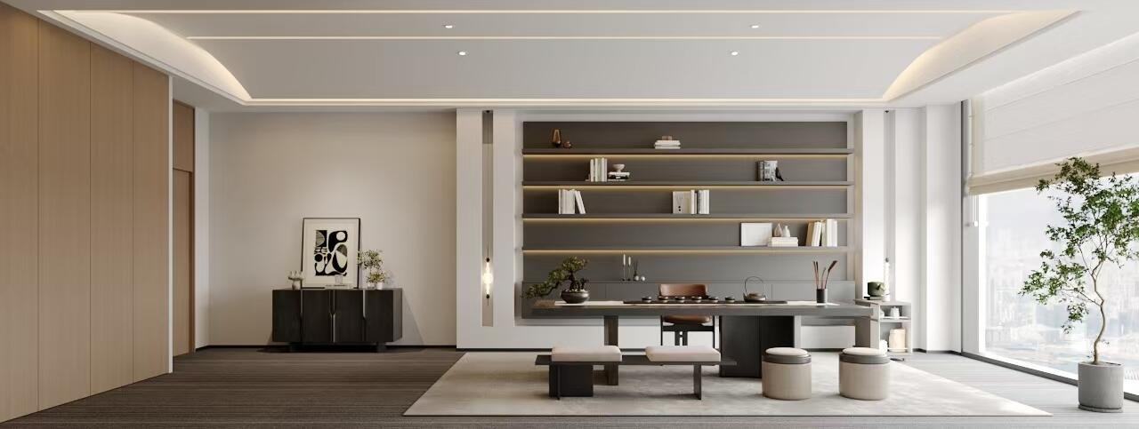 将宋瓷的形态元素融入空间细节中。宋瓷的弧形线条优美而富有变化,我们巧妙地将这些元素运用在天花造型、墙面收口等多个细节之处。这些弧形元素的运用,不仅强化了空间的整体性,还丰富了细部的视觉效果,使人在其中能够感受到一种流动而和谐的美感。