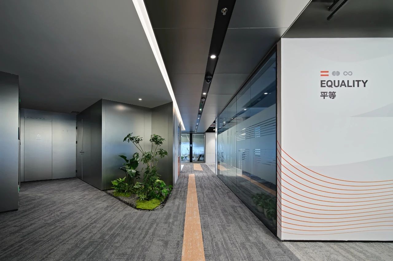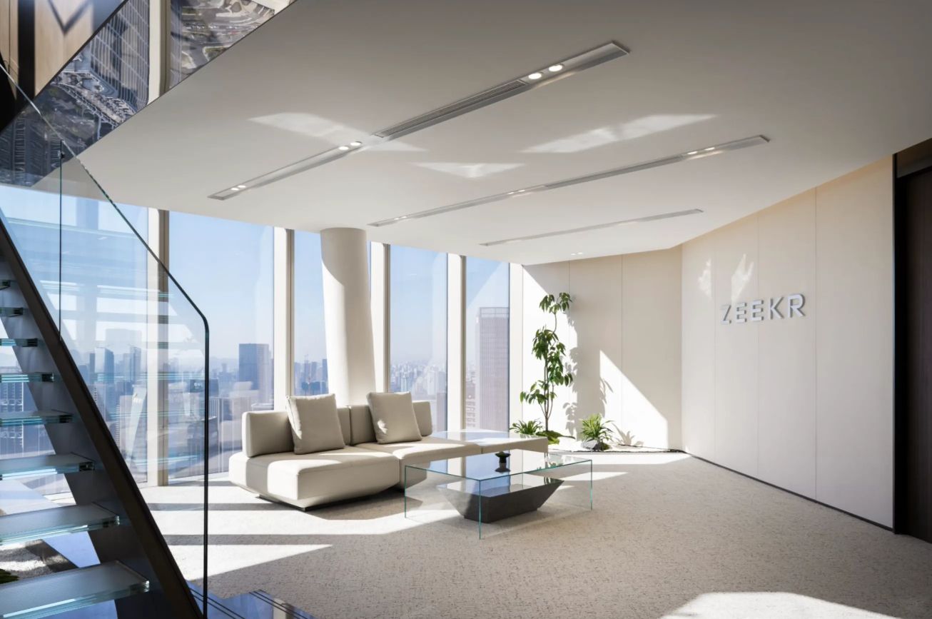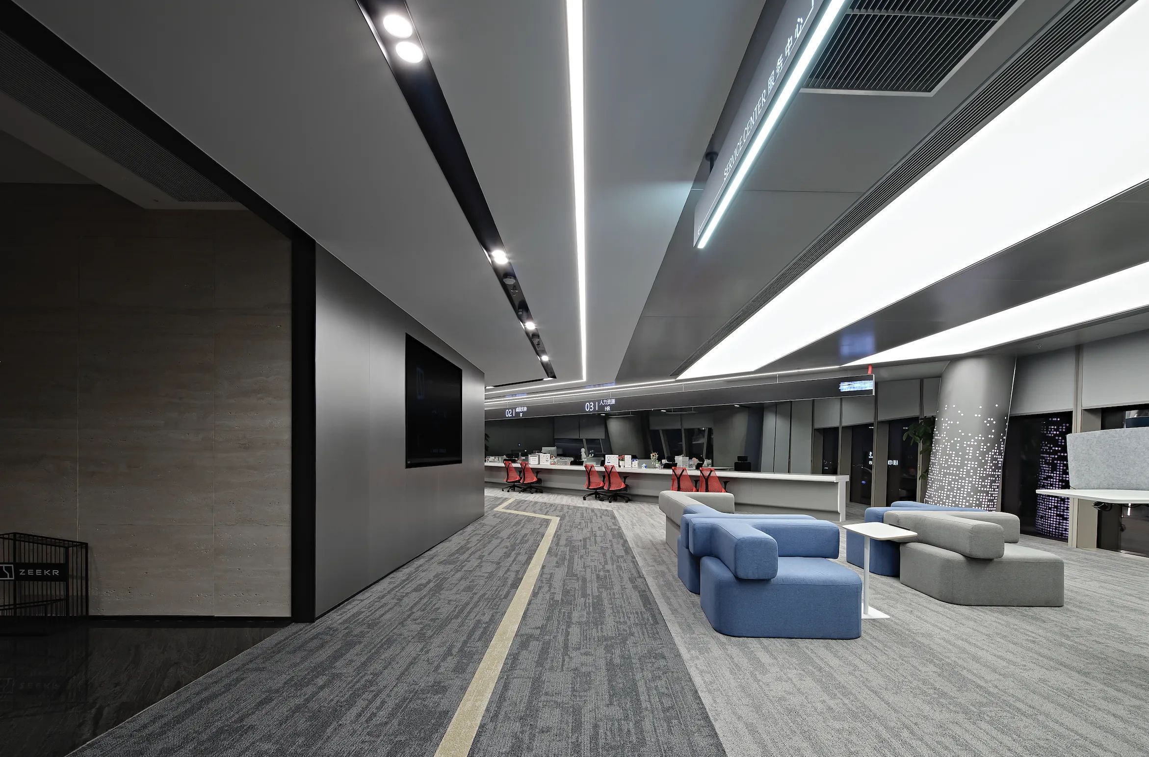 五区高管层设计中则融入了“风”元素,直线造型如顺风般引导视线,倒角和折角元素则体现了无形之风中柔和的力量感。同时,光水风都是产生电能的清洁能源,寓意着极氪的员工也像光水风一样为极氪产生源源不断的电量。