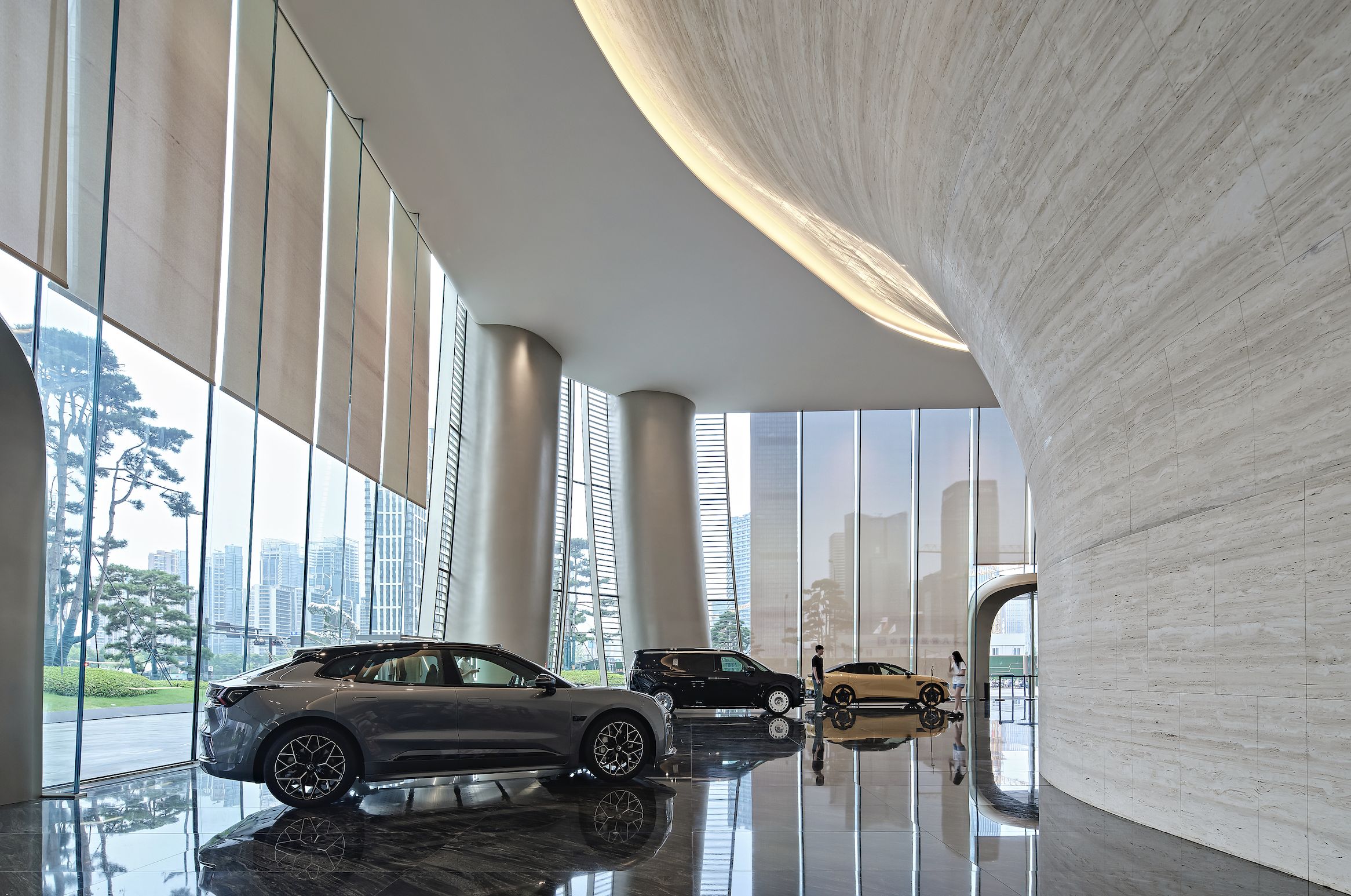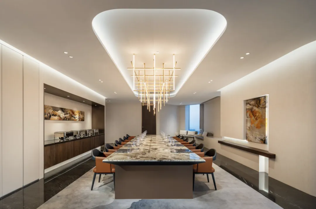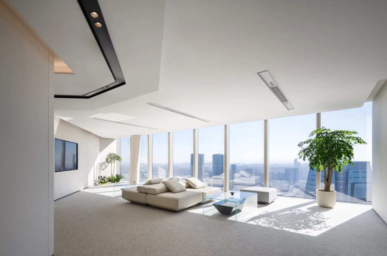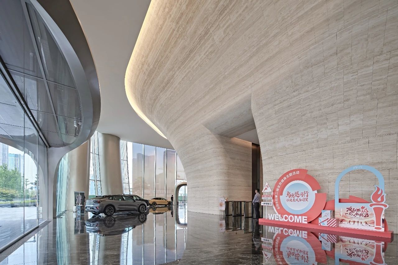 五区高管层设计中则融入了“风”元素,直线造型如顺风般引导视线,倒角和折角元素则体现了无形之风中柔和的力量感。同时,光水风都是产生电能的清洁能源,寓意着极氪的员工也像光水风一样为极氪产生源源不断的电量。