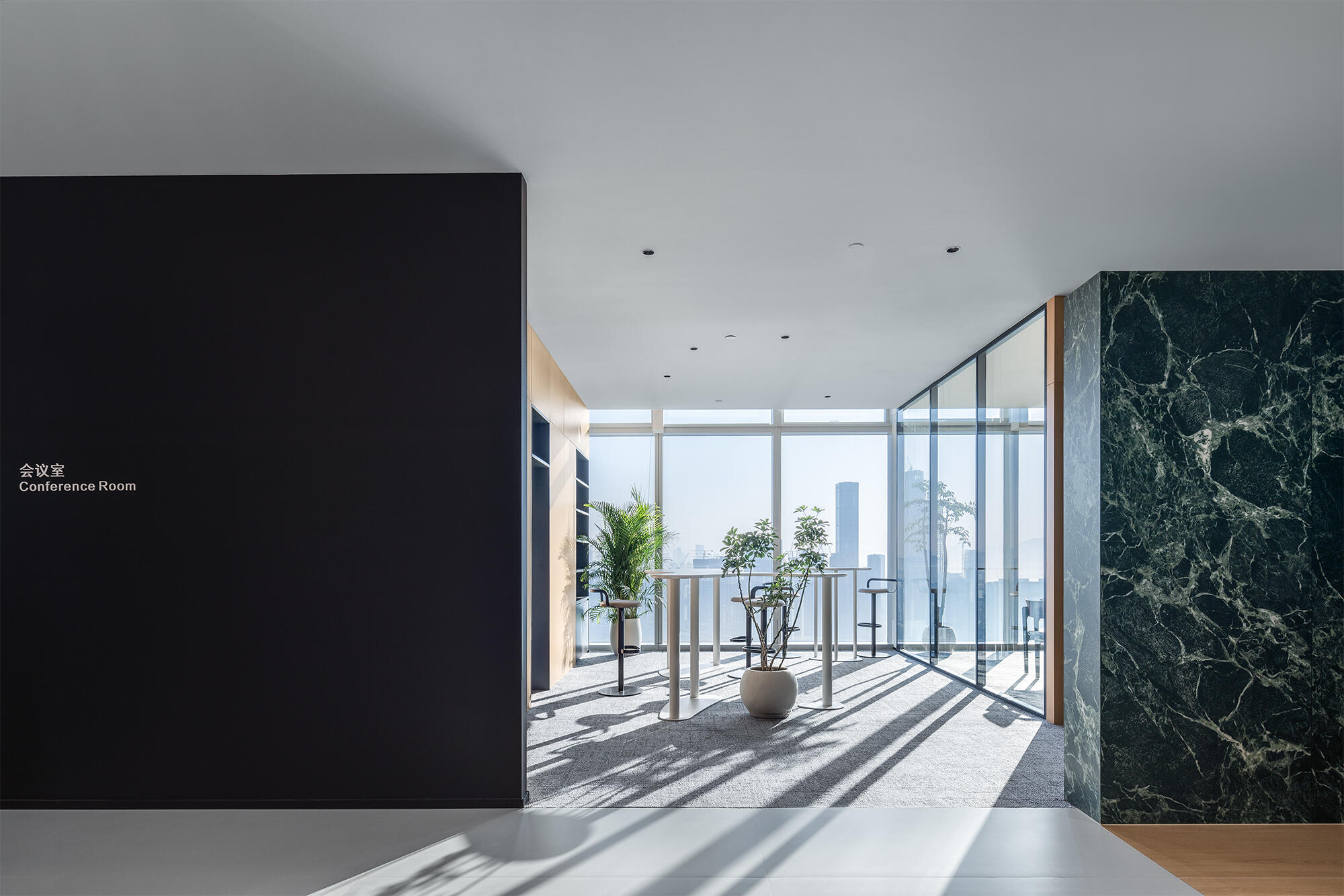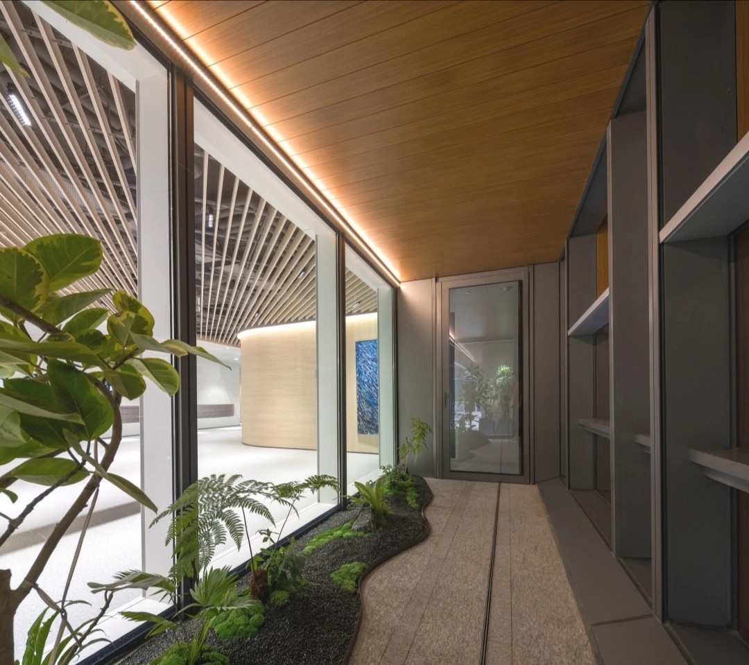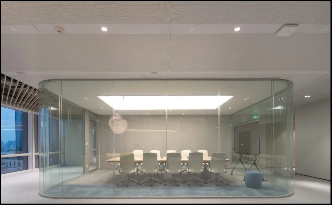 走进前厅大堂,首先映入我们眼帘的就是我们的独特玻璃房子,渐变的地毯如海水一般,映射在玻璃墙,搭配浅色会议家具,犹如在海水中轻盈,自在。