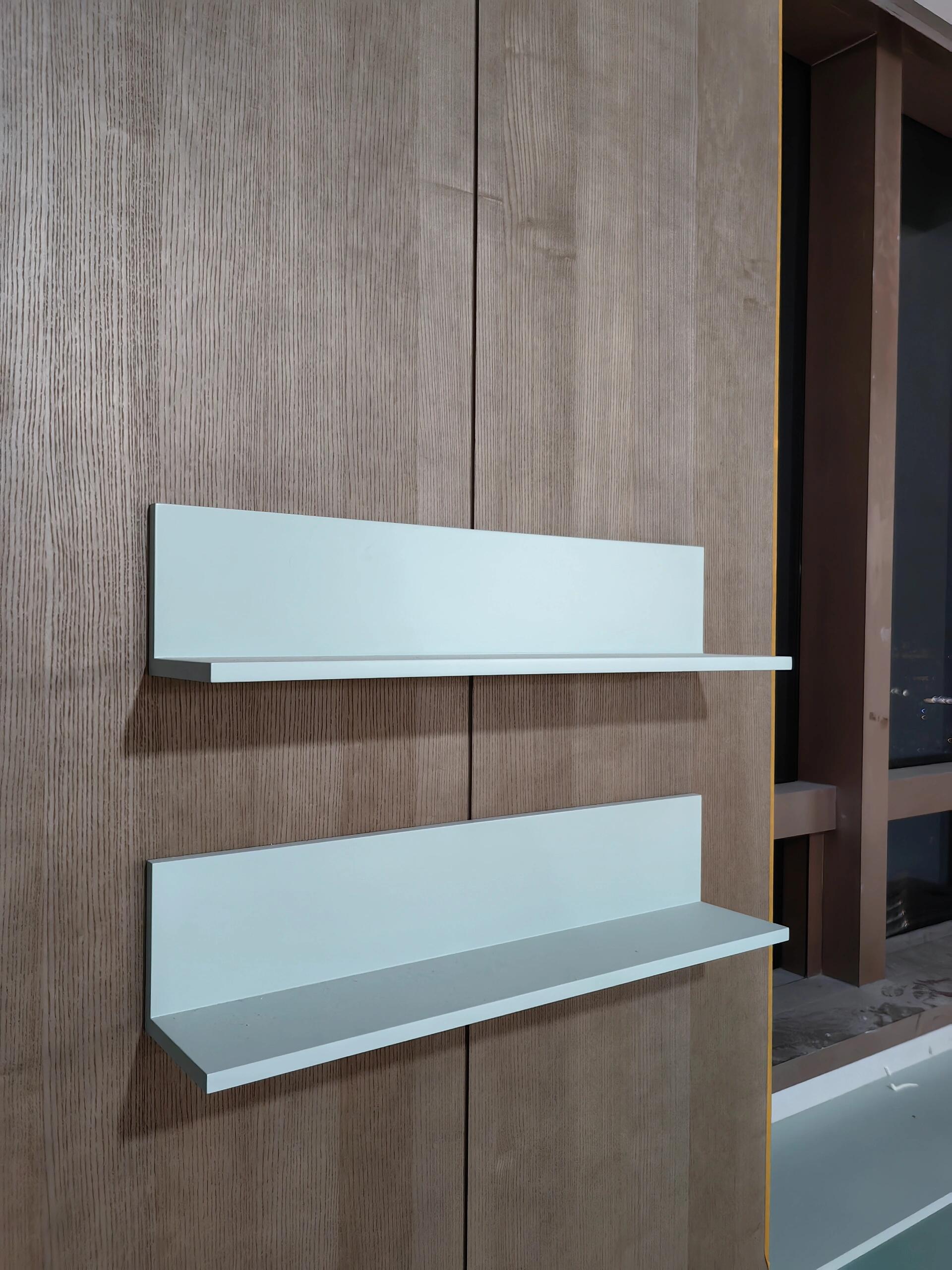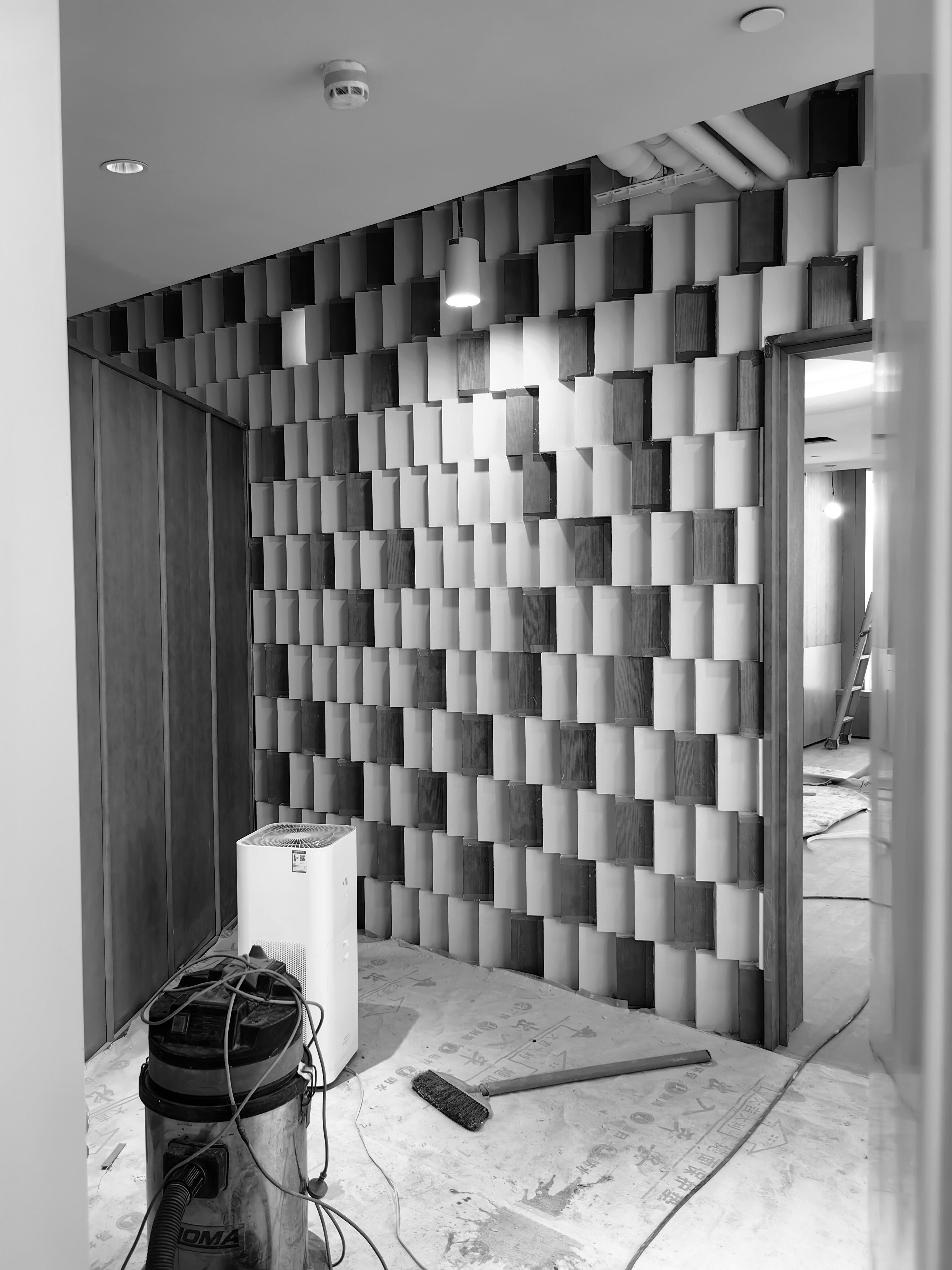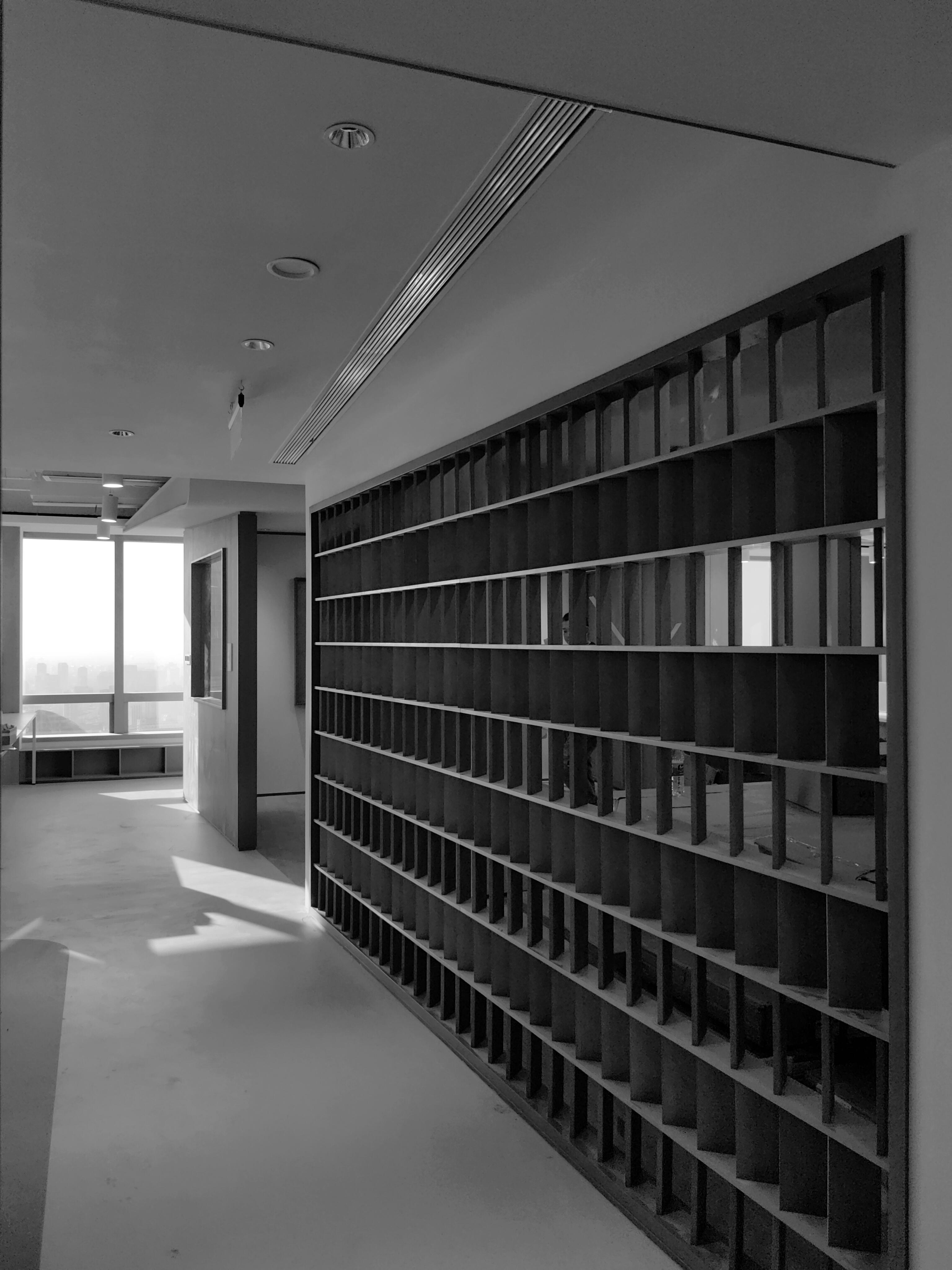 财务室的收纳系统与办公桌一体设计,L形的柜体,强调了空间隐私性,木色和黑色结合,节奏韵律感十足,让使用者形成关于美感和艺术的想象。