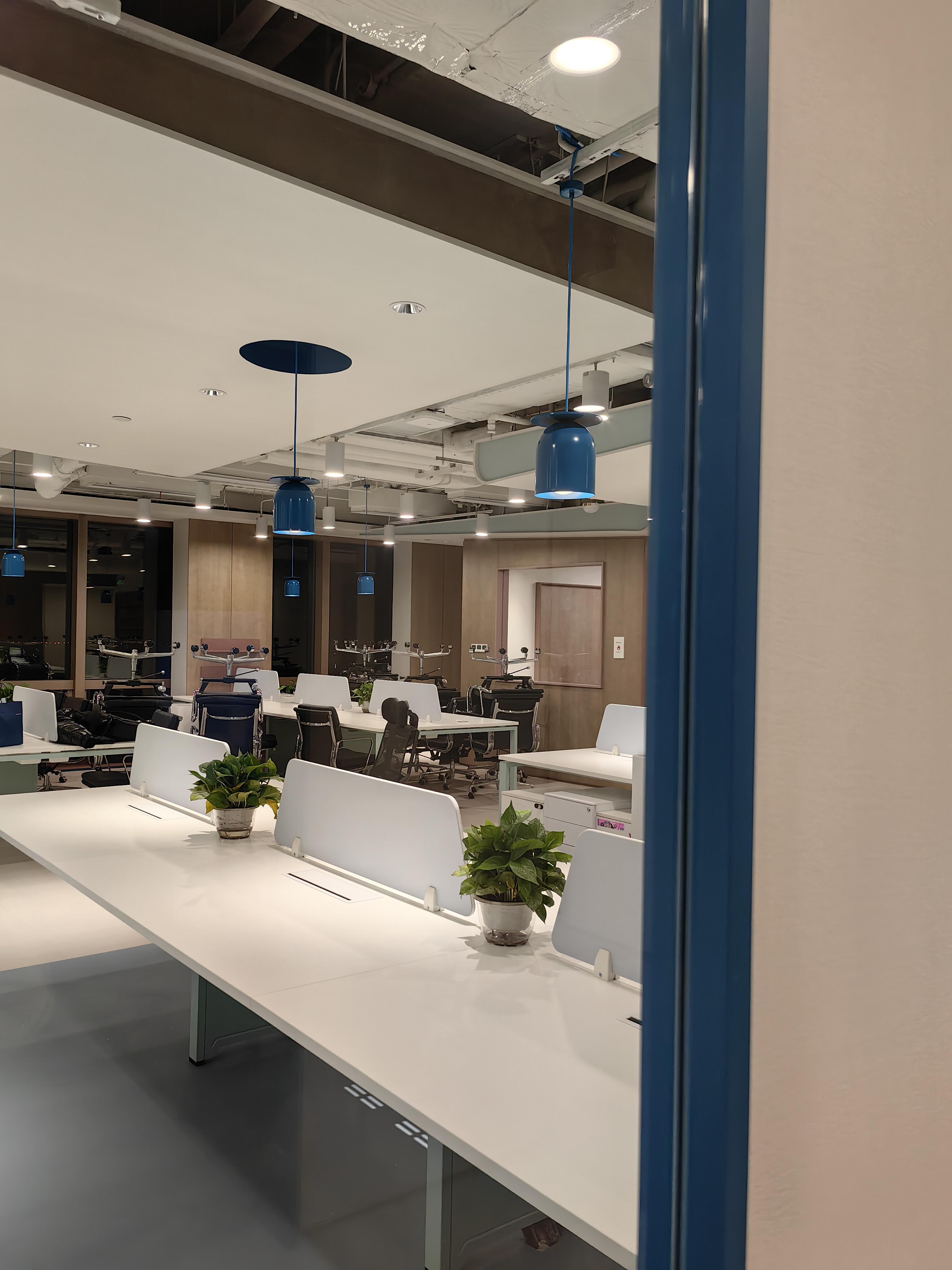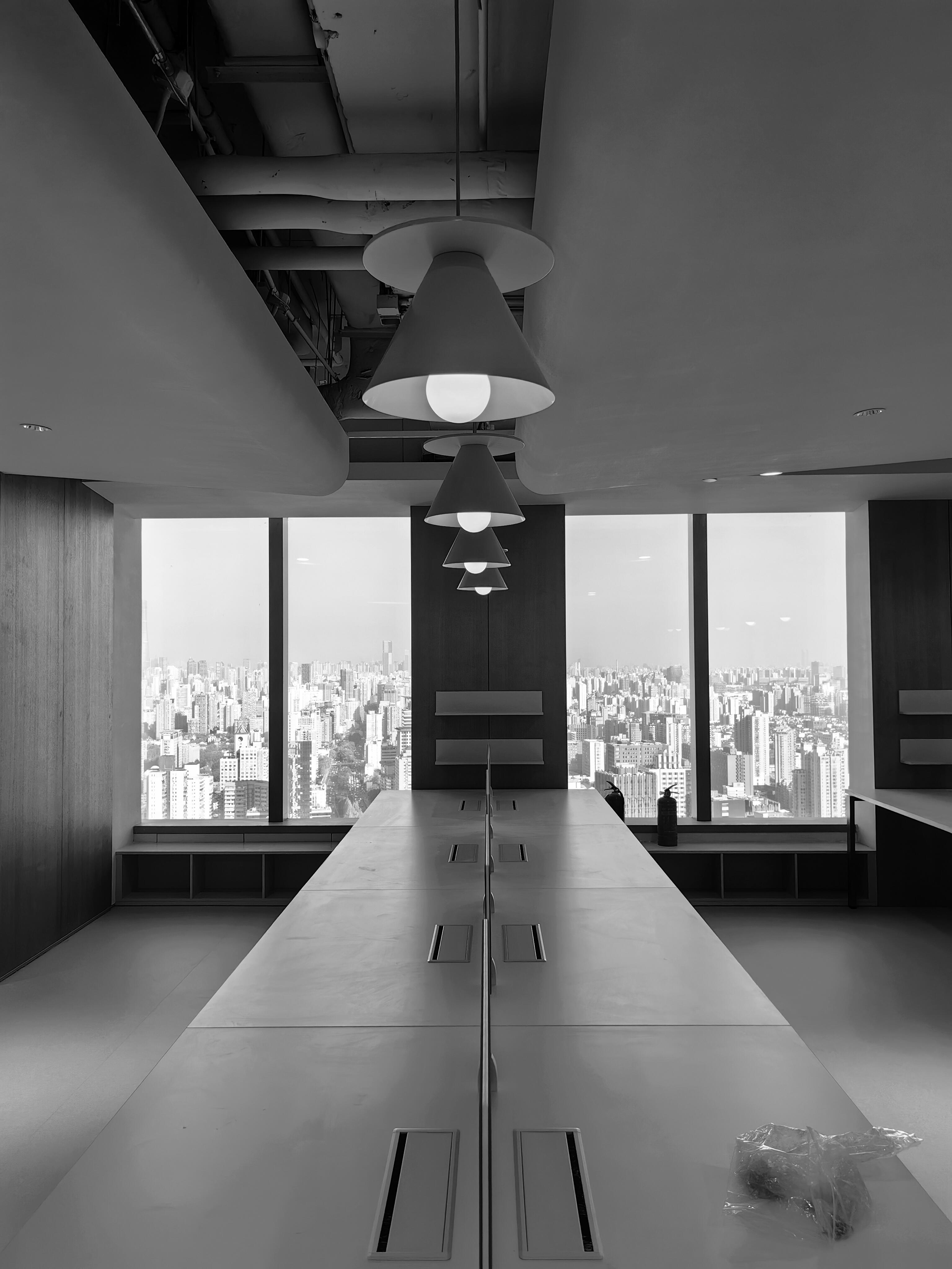 办公空间更注重员工个体的工作需求,黑色办公桌两侧均可布置电脑等办公设备,节约空间,又不会显的过于拥挤。吊灯遵循工位布置,满足工作照明需求。