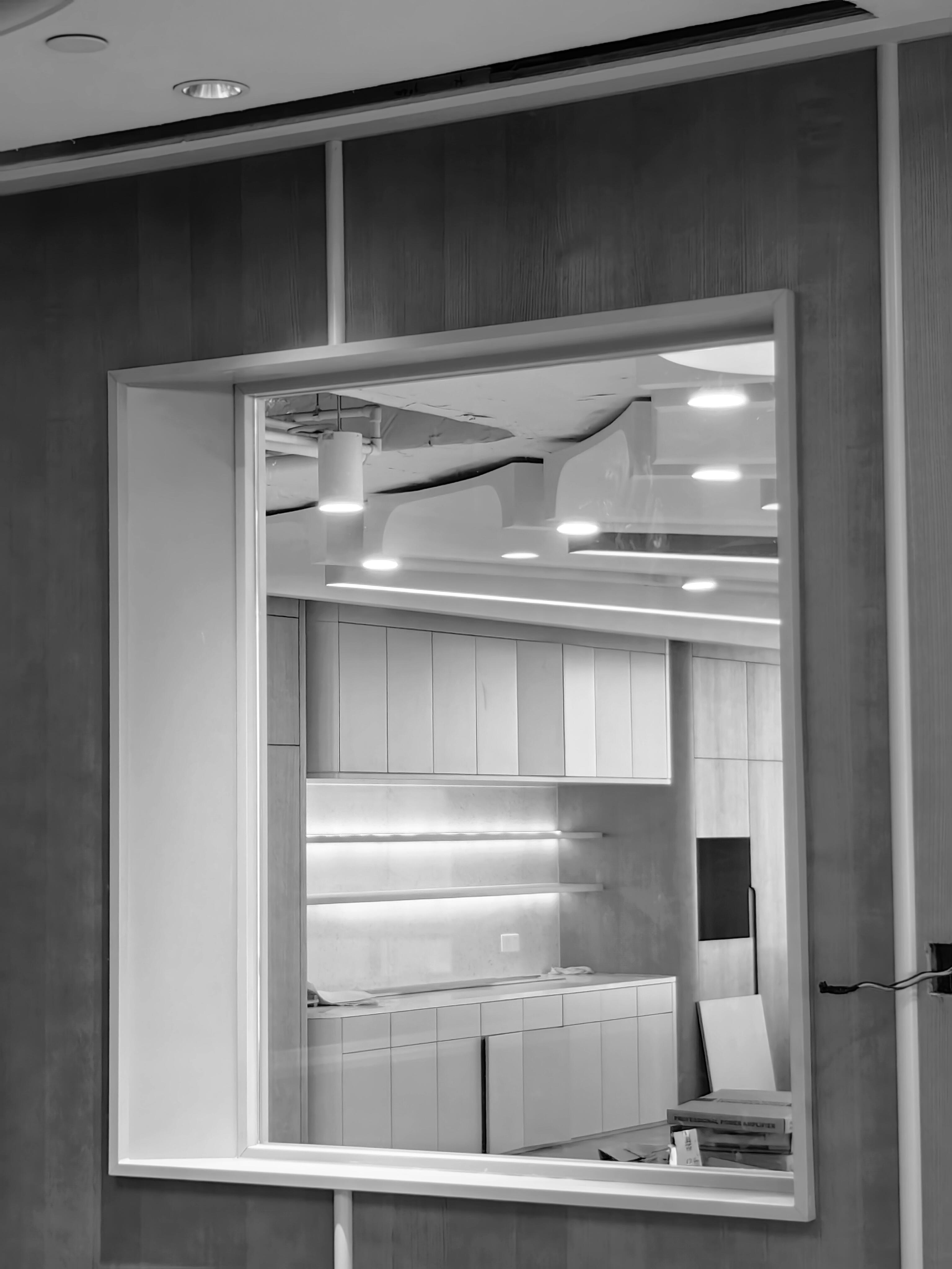 踏入前厅,开阔的空间尺度,自带恢宏气势,干净无痕的前厅岛台,沉稳而不孤冷,与上饰的线条结合,共同构筑一处空且灵净的美学殿堂。