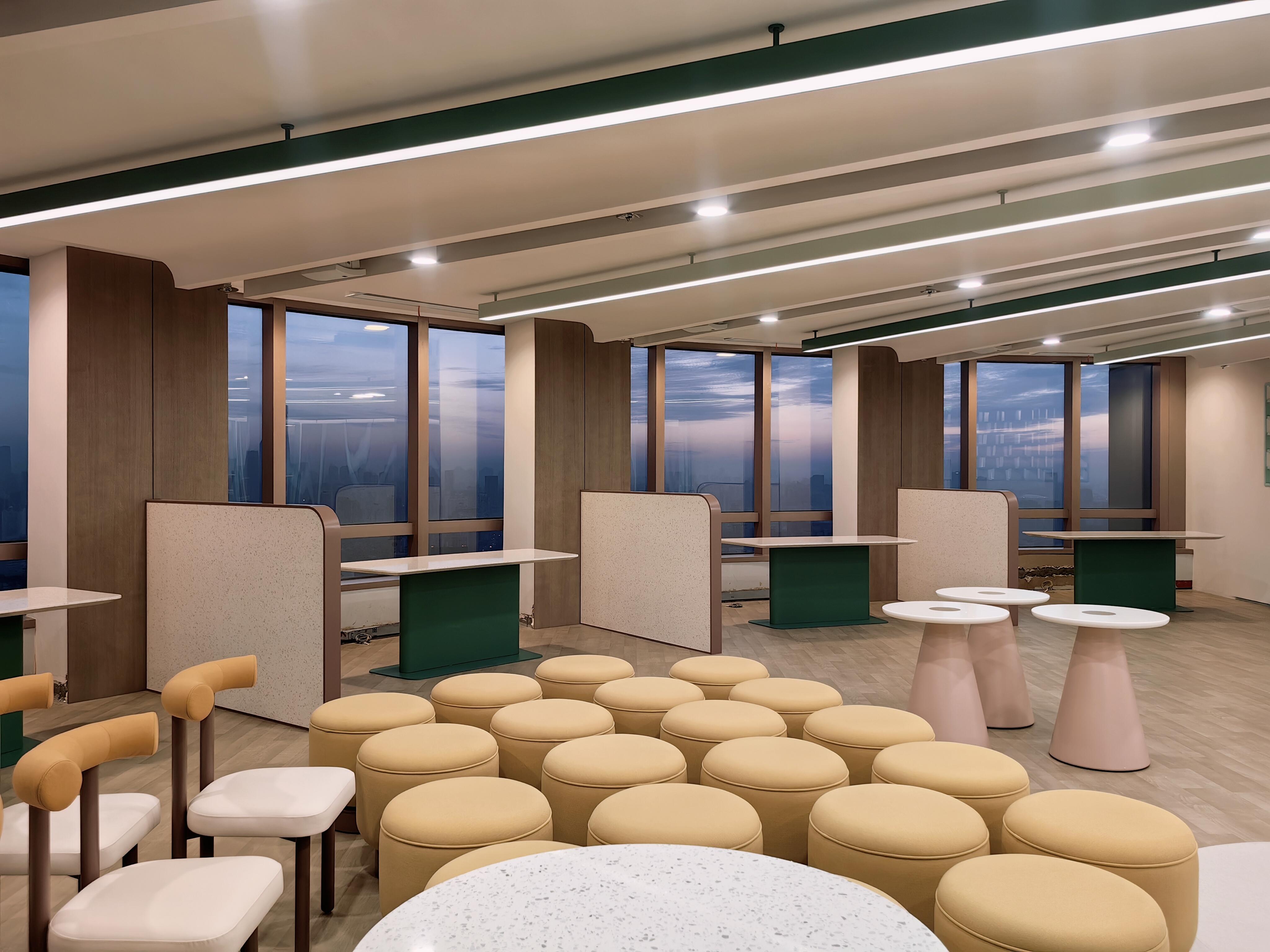 打造互动式会议室,立体圆形吊顶搭载灯光系统顺势垂下,与下方的U形会议桌构成形态呼应,周遭以通透玻璃作为区域隔断,既保证区域互动,又让会议室保持本身的独立。